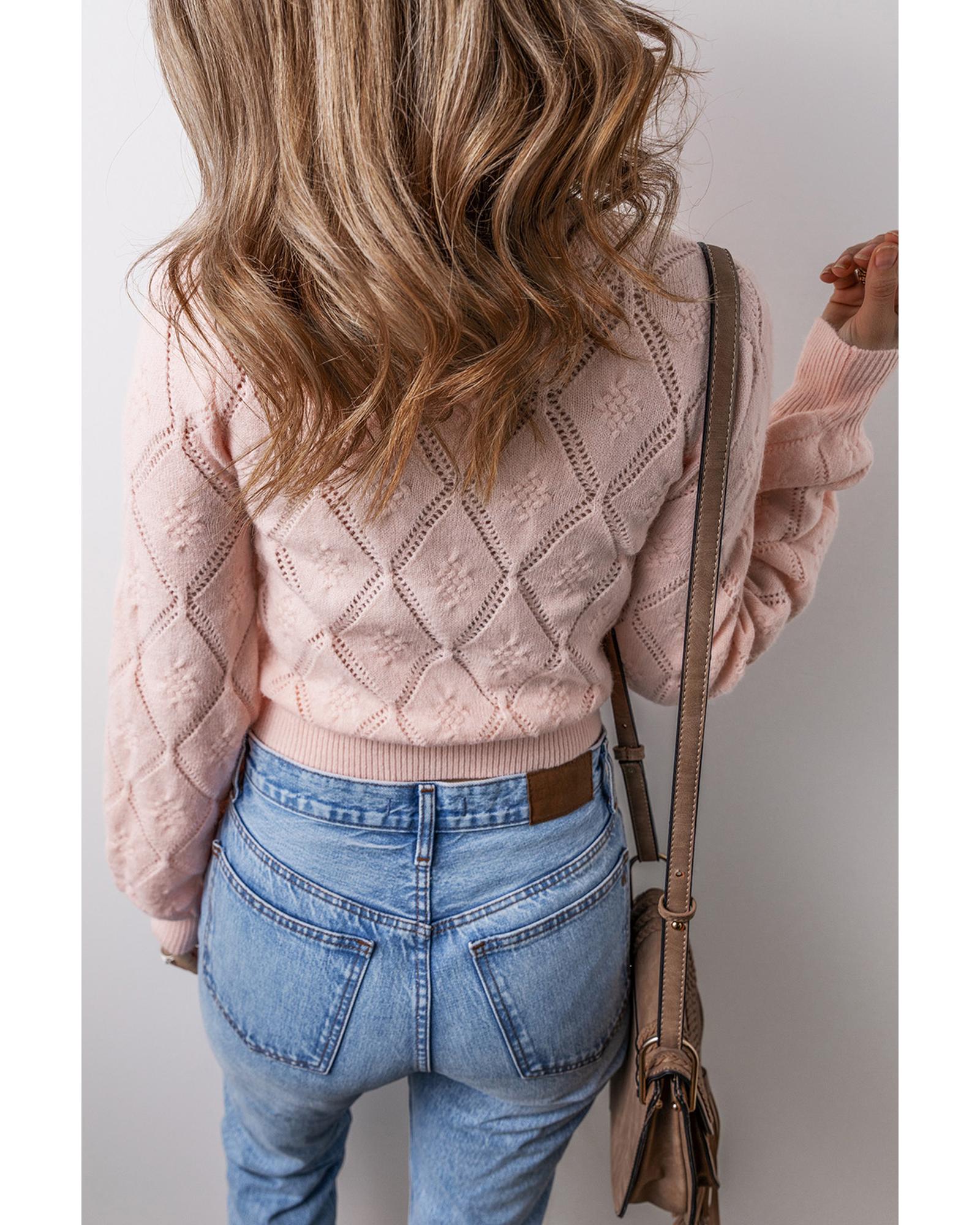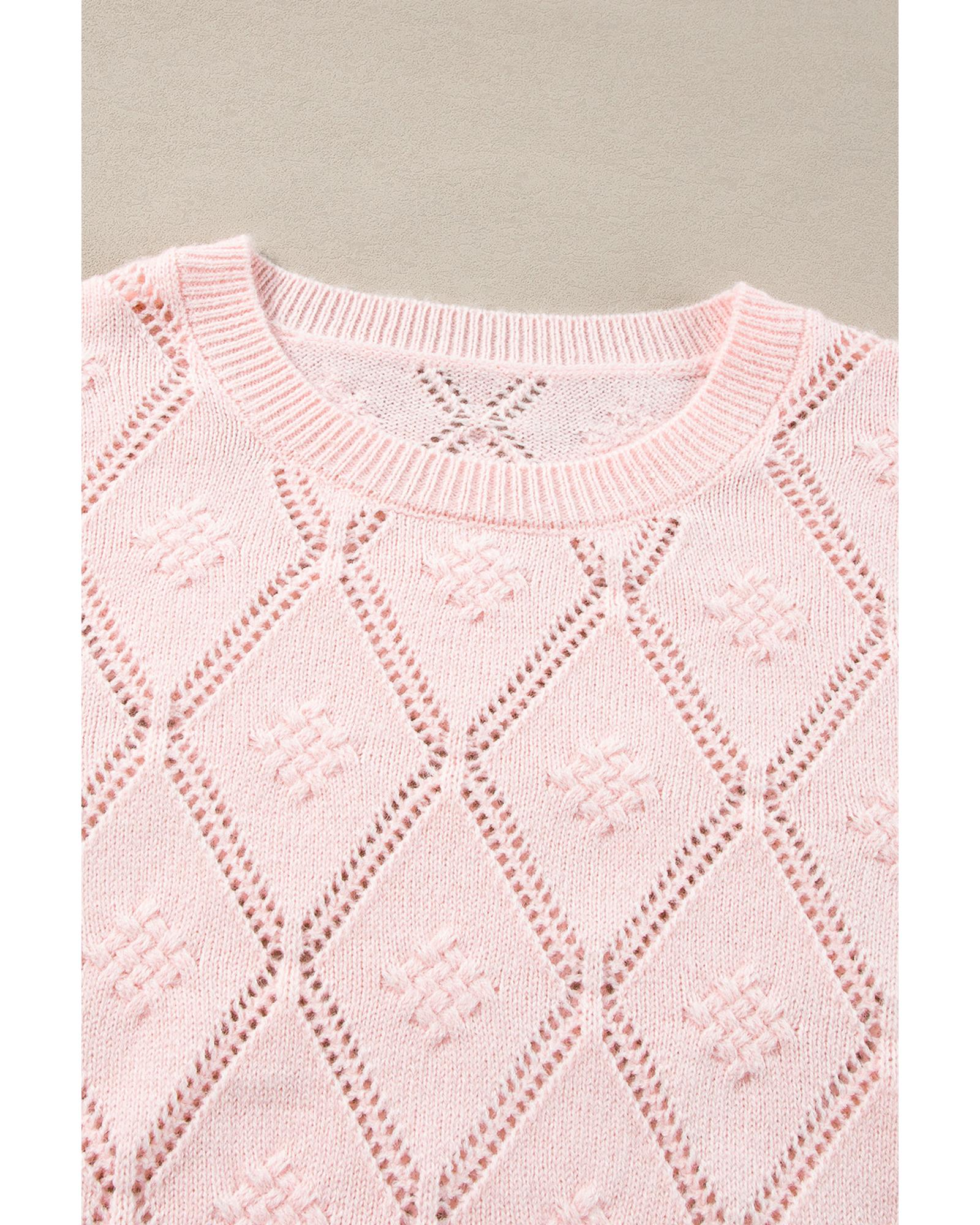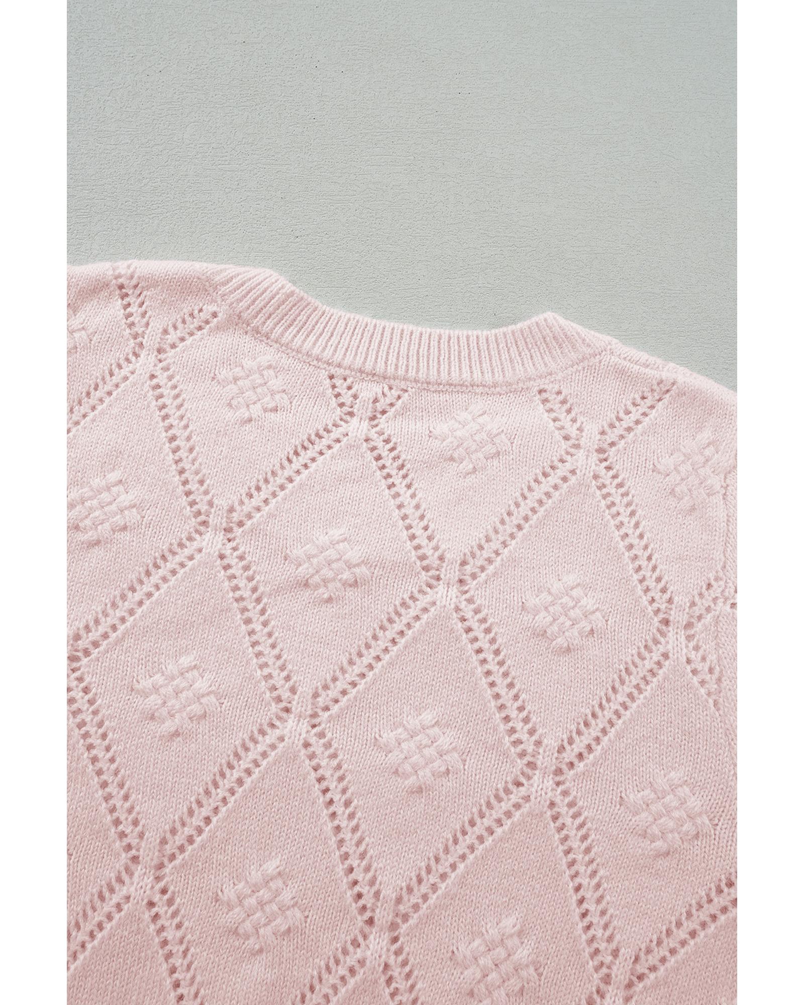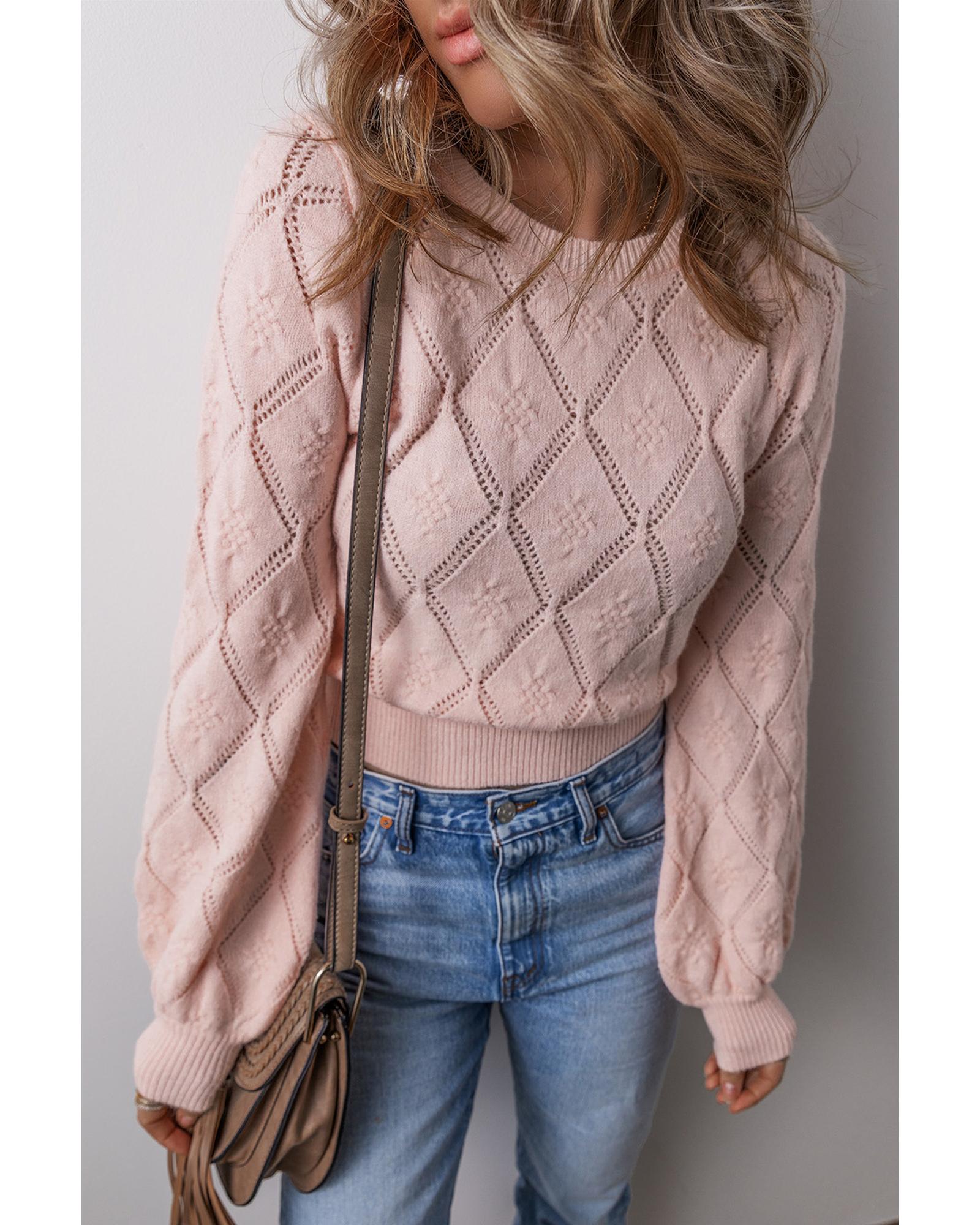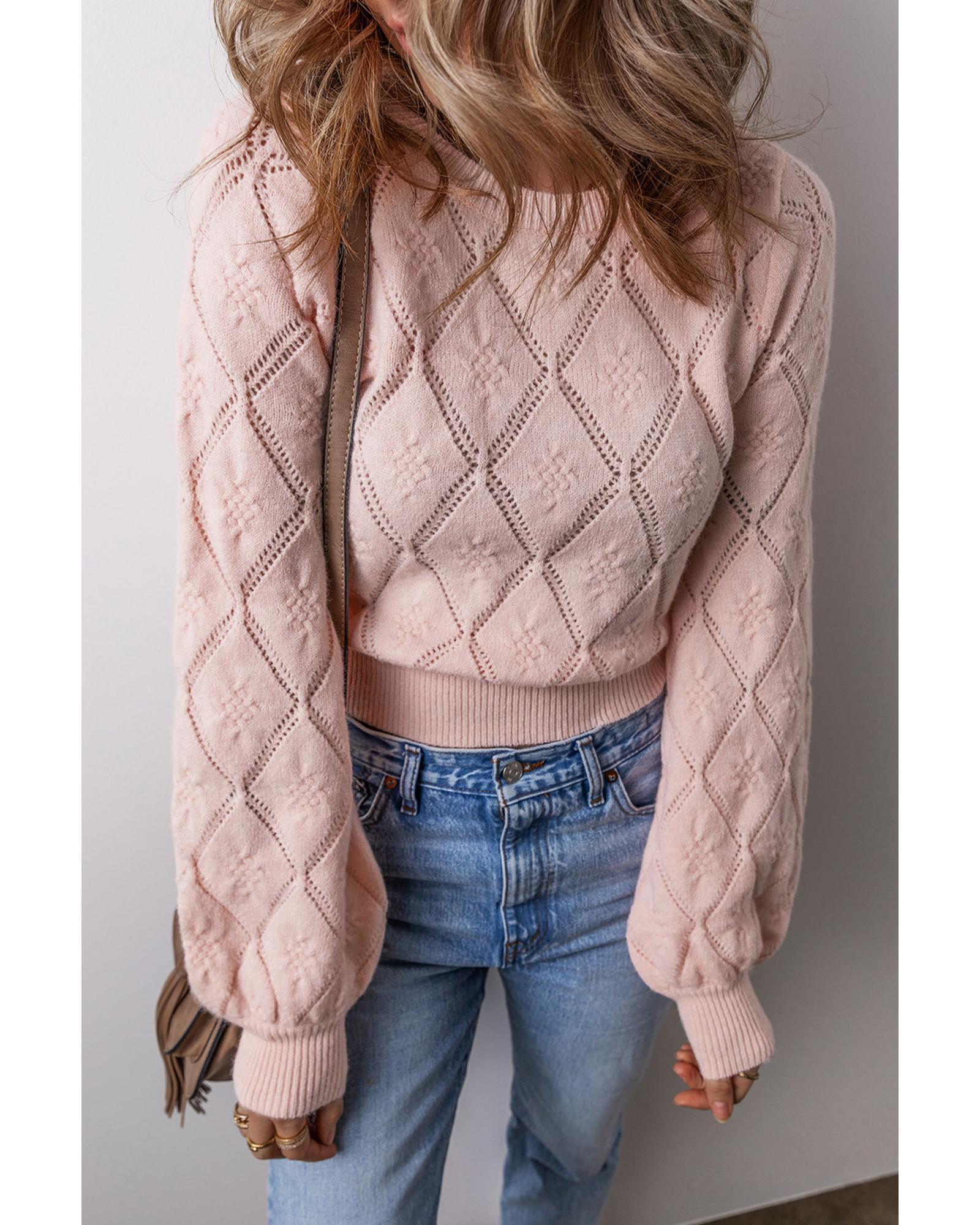 Gossamer Pink Openwork Plaid Puff Sleeve Cropped Sweater – L