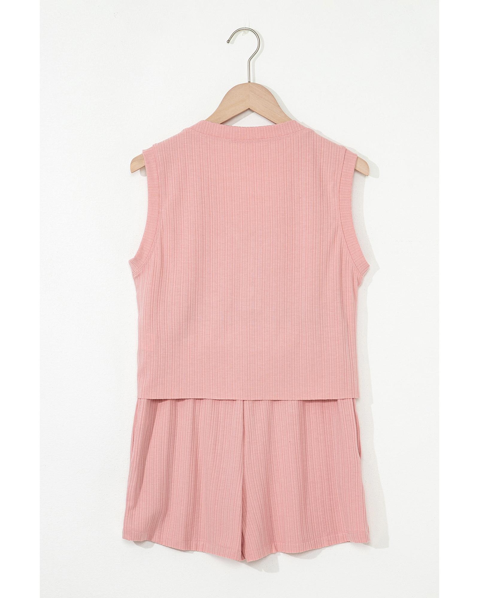 Gossamer Pink Ribbed Button V Neck Tank Top and Shorts Set – M