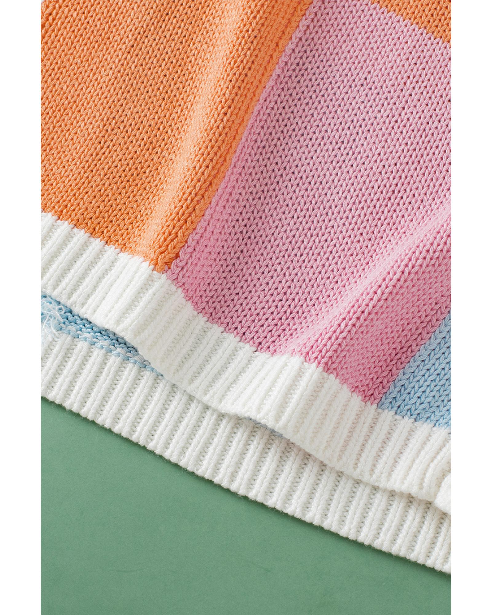 This grapefruit orange color block cap sleeve sweater features a trendy, relaxed fit with a fashionable checkered print. Its lightweight knit design makes it suitable for casual and chic styles, pairing effortlessly with jeans for a stylish look.