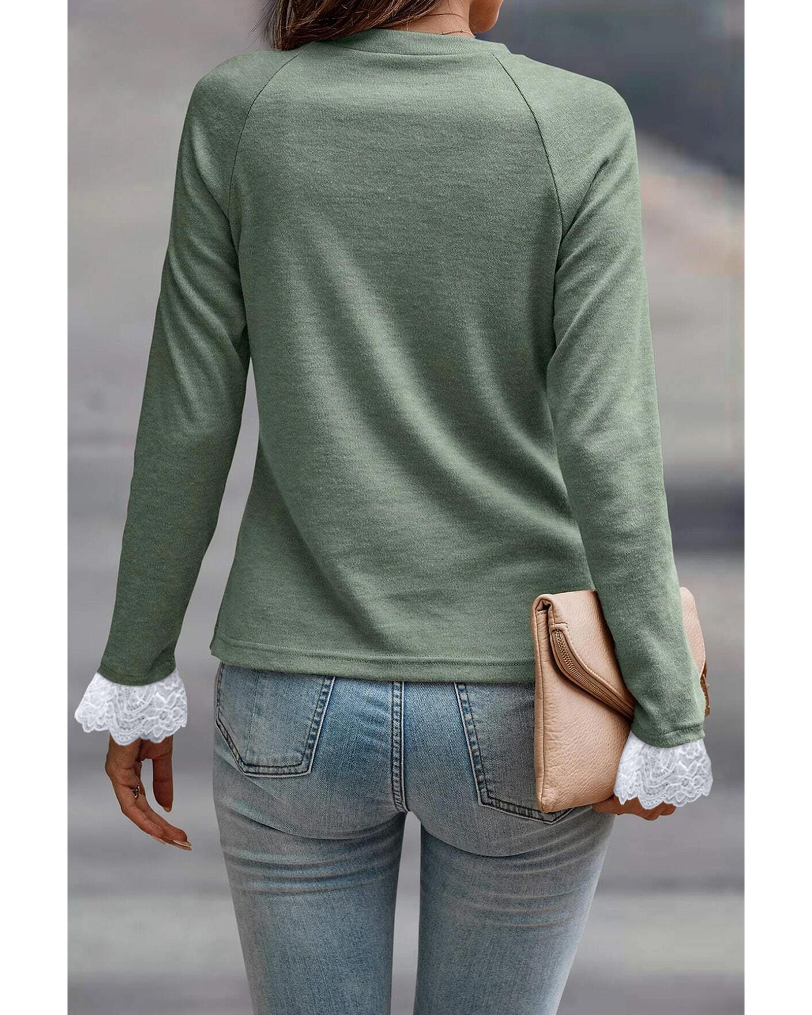 Grass Green Seam Detail Lace Contrast Cuffs Raglan Sleeve Top – L