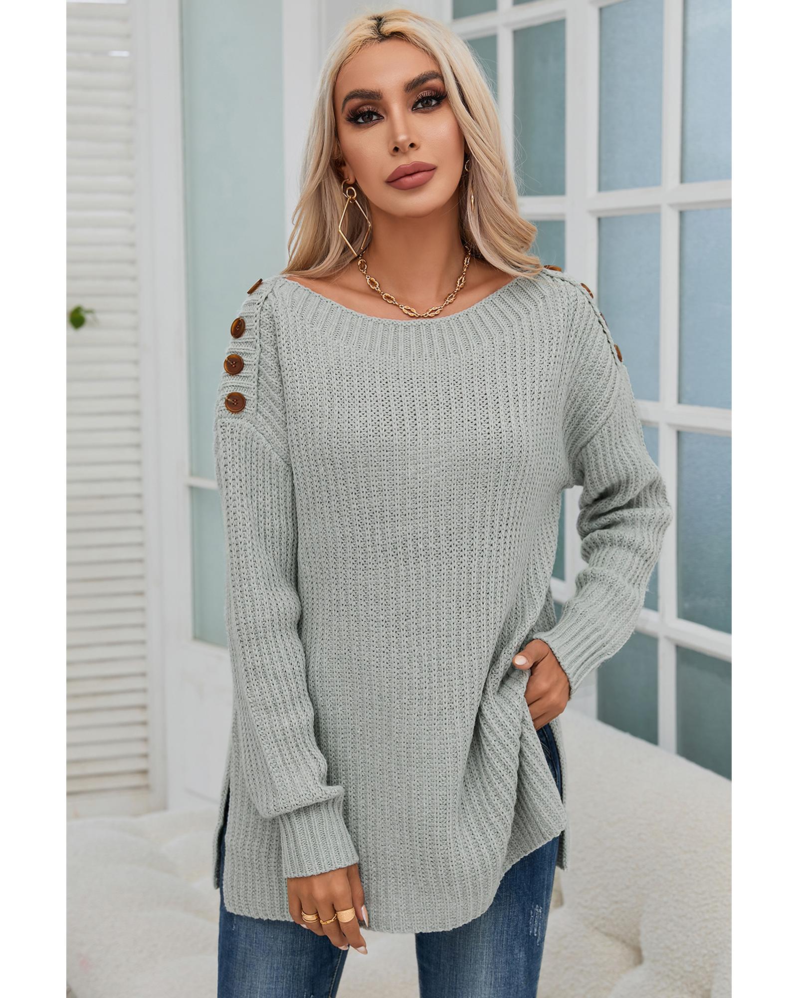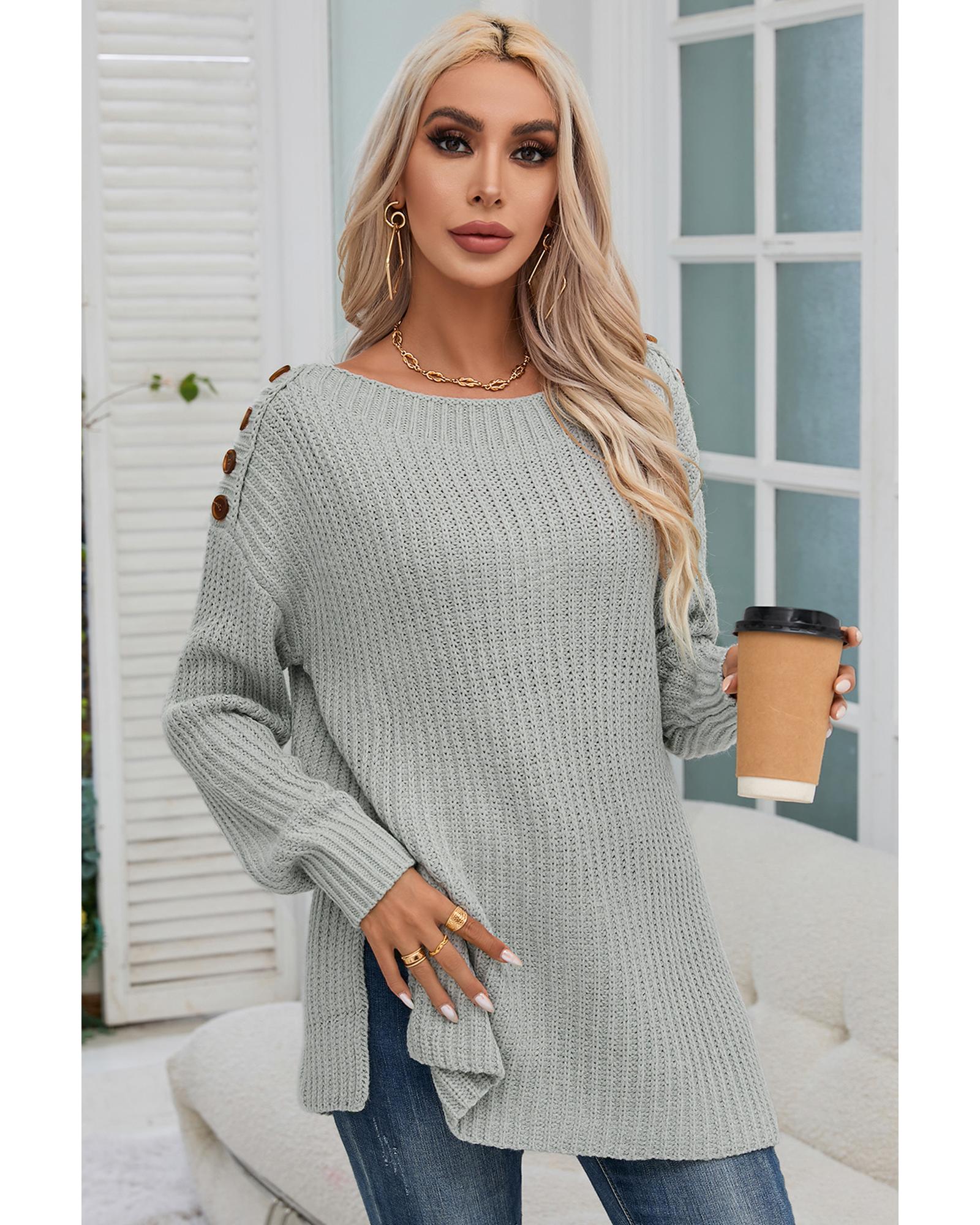 This gray buttoned drop shoulder oversized sweater offers a trendy and comfortable style suitable for casual wear. Designed with a loose fit, it provides both warmth and fashion, making it an ideal choice for winter outfits.