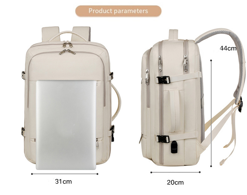 This large-capacity travel backpack combines style and functionality, making it suitable for daily use and extended trips. It features a lightweight design, multiple compartments for organization, and a built-in USB charging port for convenience. The backpack’s modern gray color adds an elegant touch to its practical design.