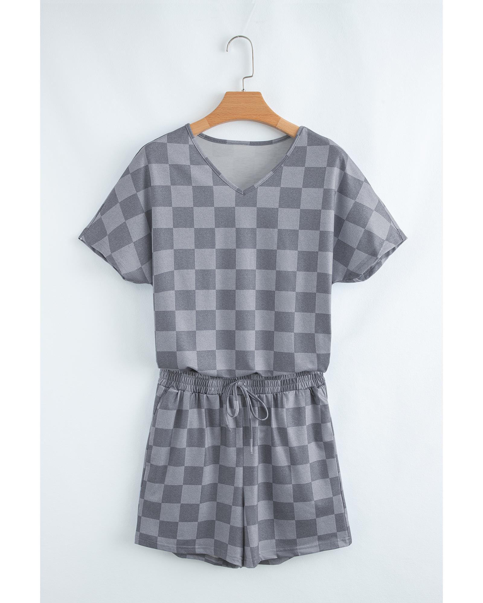 Gray Checkered V Neck Tee Drawstring Shorts Lounge Set – XL