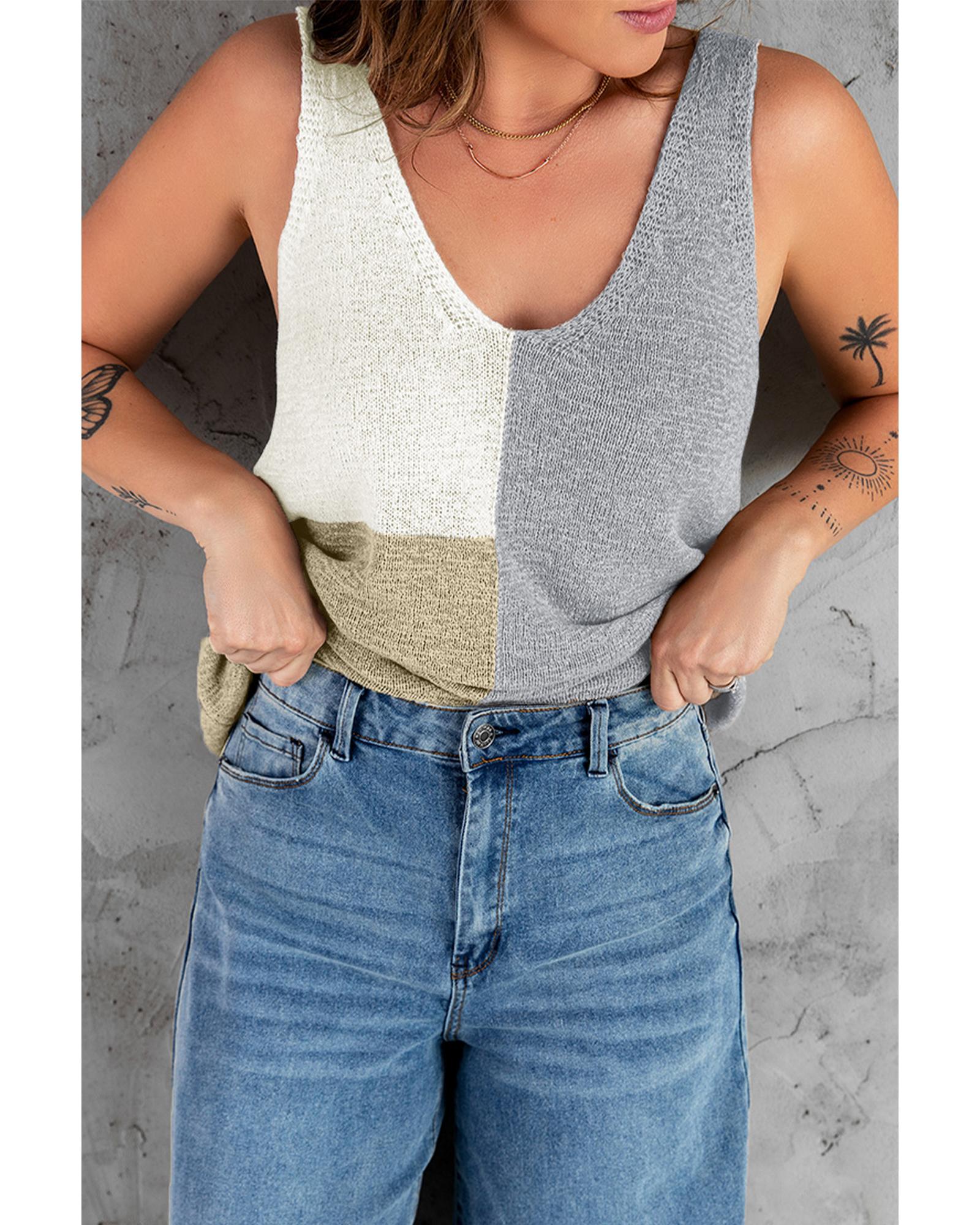 This gray color block knitted tank top offers a trendy and casual style, perfect for summer wear. Designed with a fitted look, it combines comfort and fashion, making it an essential addition to your warm-weather wardrobe.