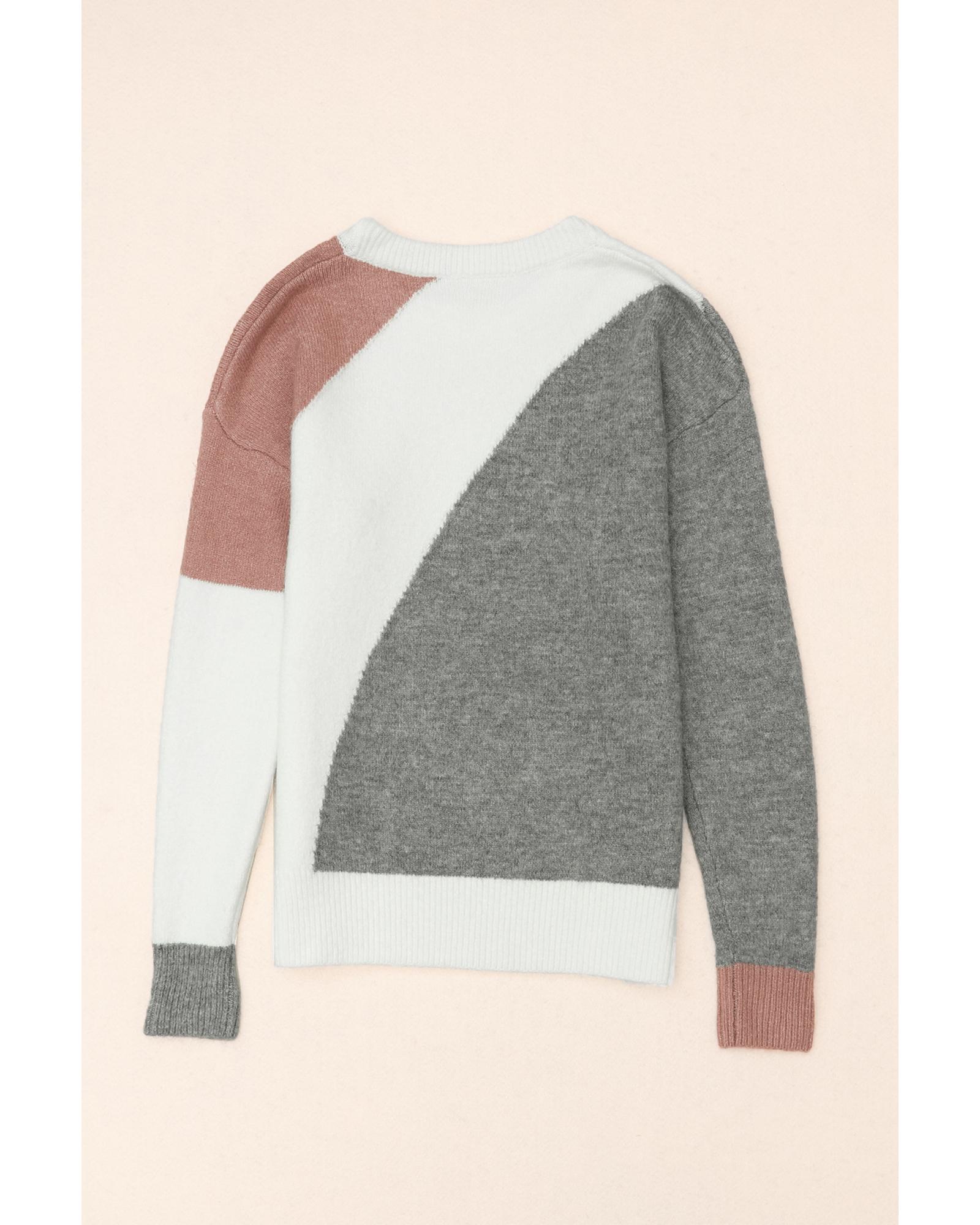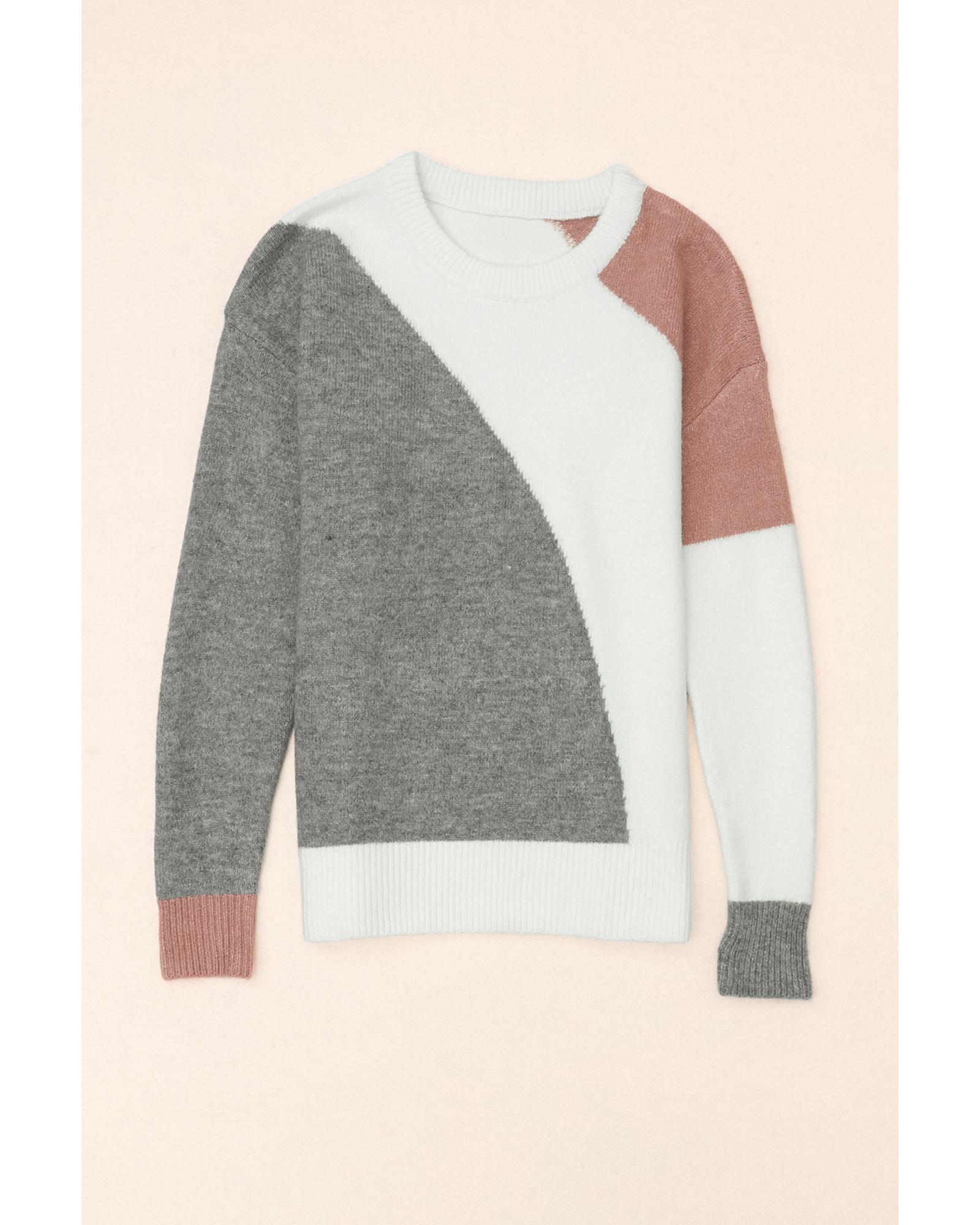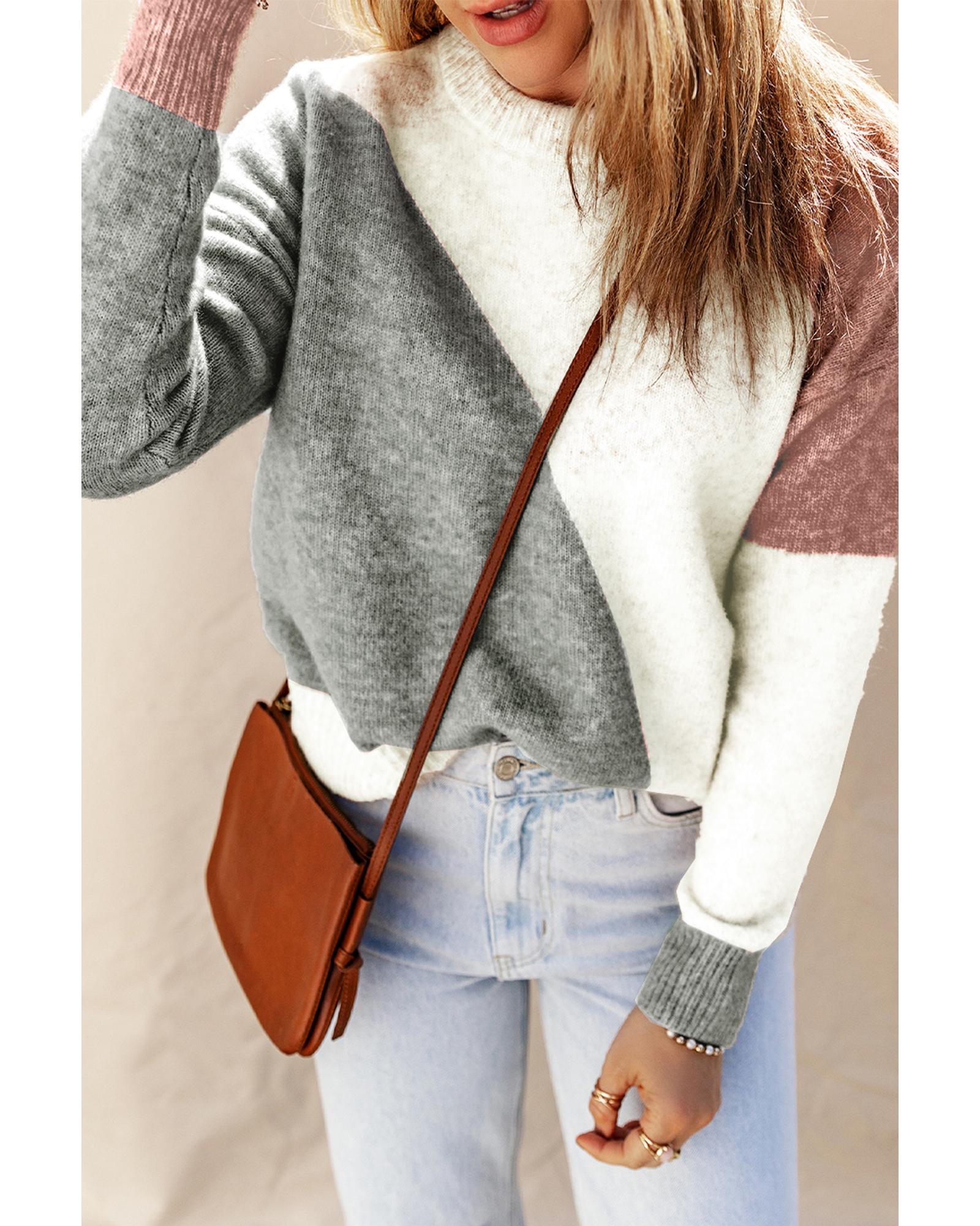 Gray Colorblock Ribbed Trim Round Neck Sweater – L