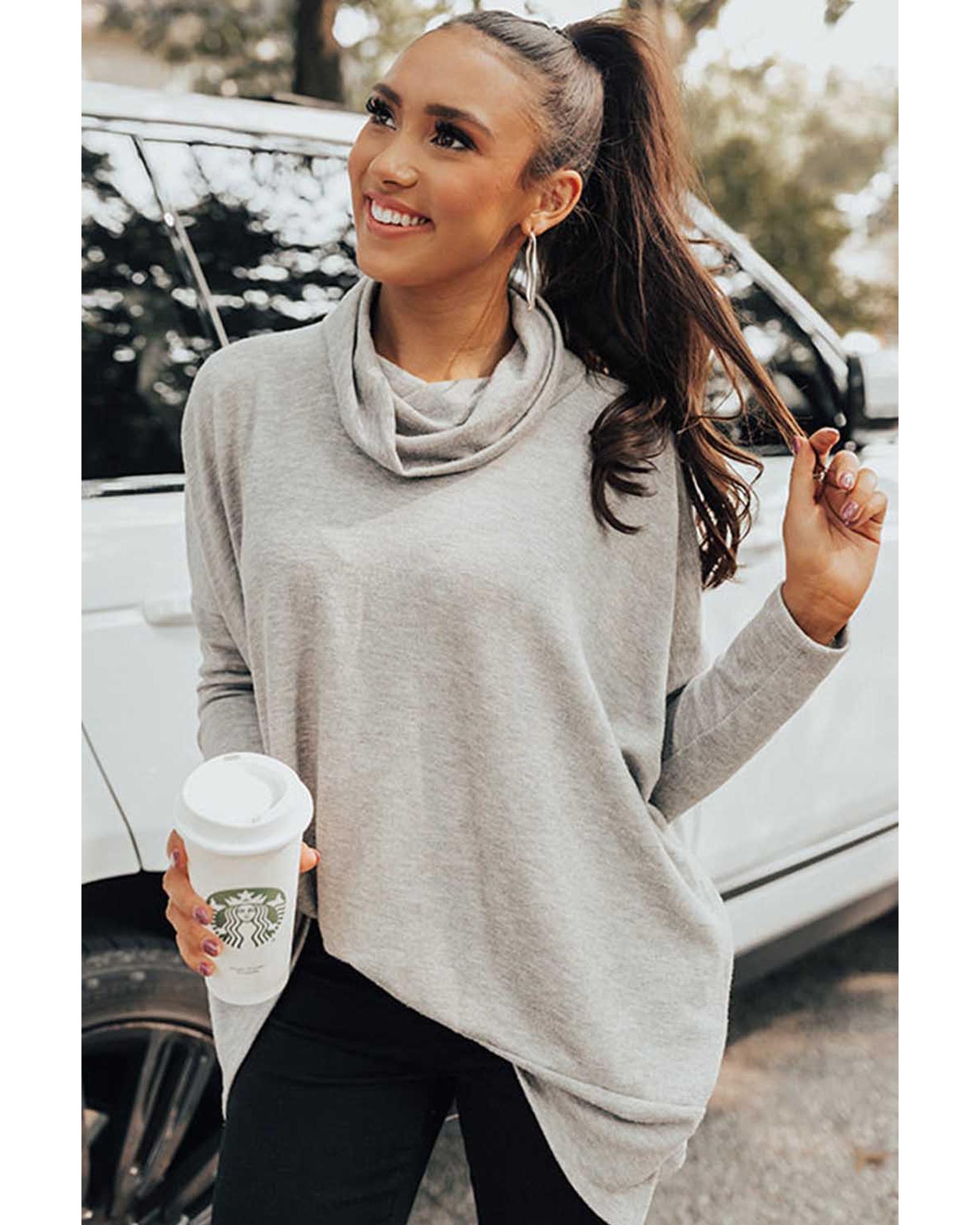 This gray cowl neck shift tunic top offers a stylish and versatile addition to any wardrobe. Designed with a relaxed silhouette and soft lightweight material, it is suitable for wearing alone or layered for different looks. The piece features a cowl neck, long sleeves, and a thigh-length hemline with accent side slits, making it both comfortable and fashionable.