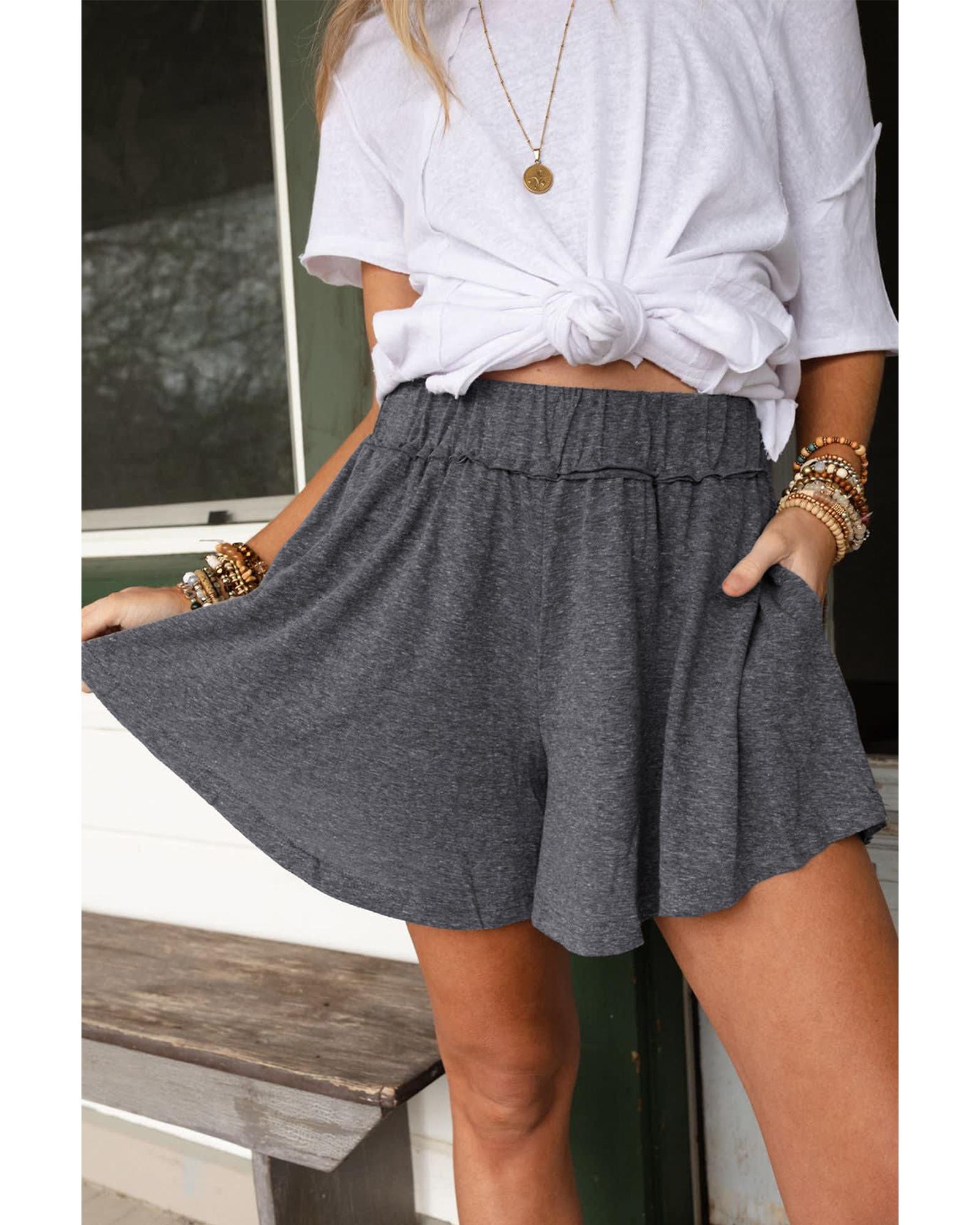 This pair of gray elastic waist culotte shorts offers a trendy and comfortable fit with a relaxed silhouette. Designed with raw edge details and a high-rise elastic waistband, these shorts combine style and ease of wear for casual occasions.