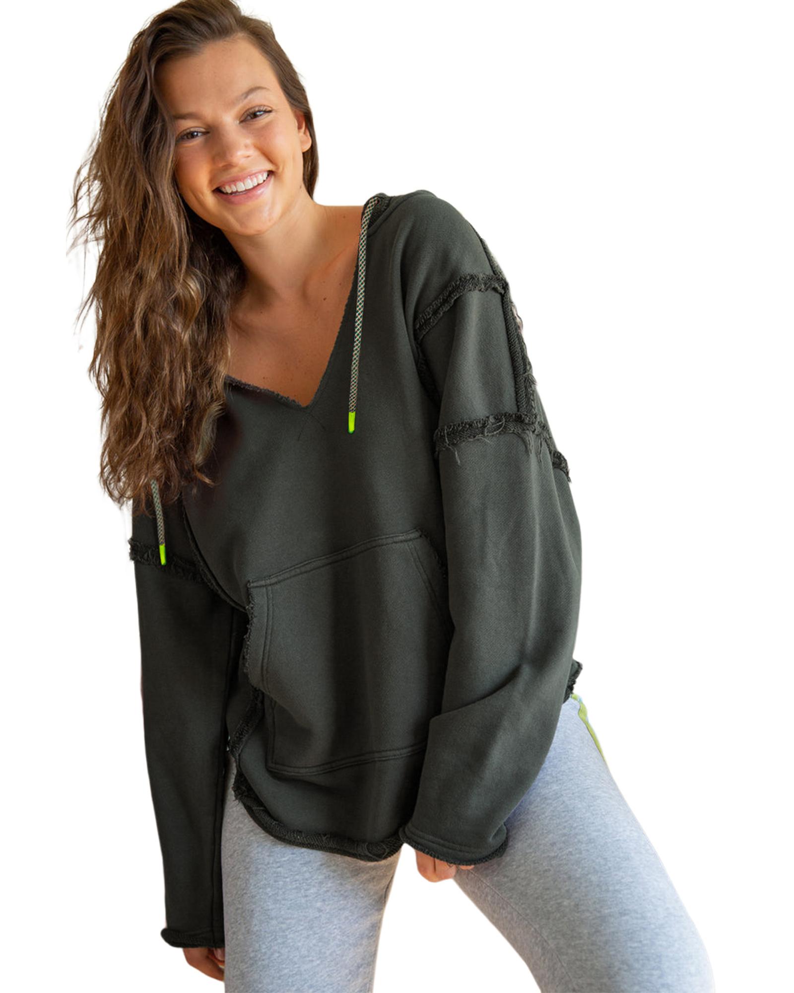 - Features a kangaroo pocket, exposed seam, and raw edge details