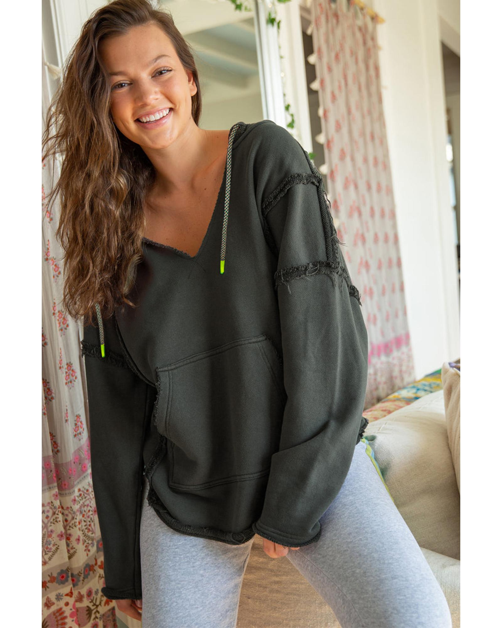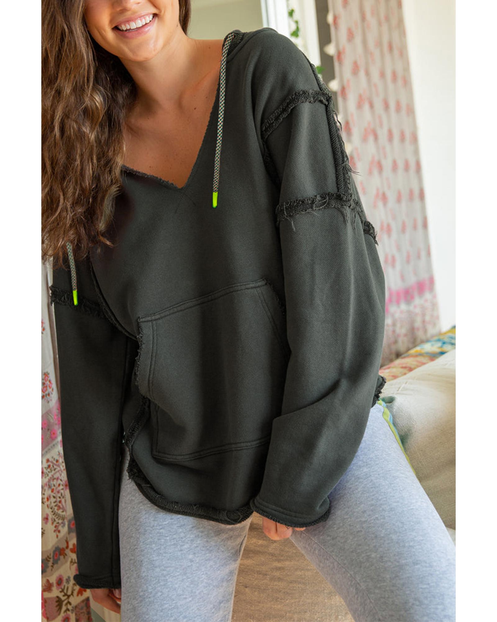 This gray exposed seam raw edge hoodie offers a casual and trendy look with a relaxed fit. Designed for everyday wear, it features practical pockets and stylish raw edge details, making it versatile for pairing with various outfits.