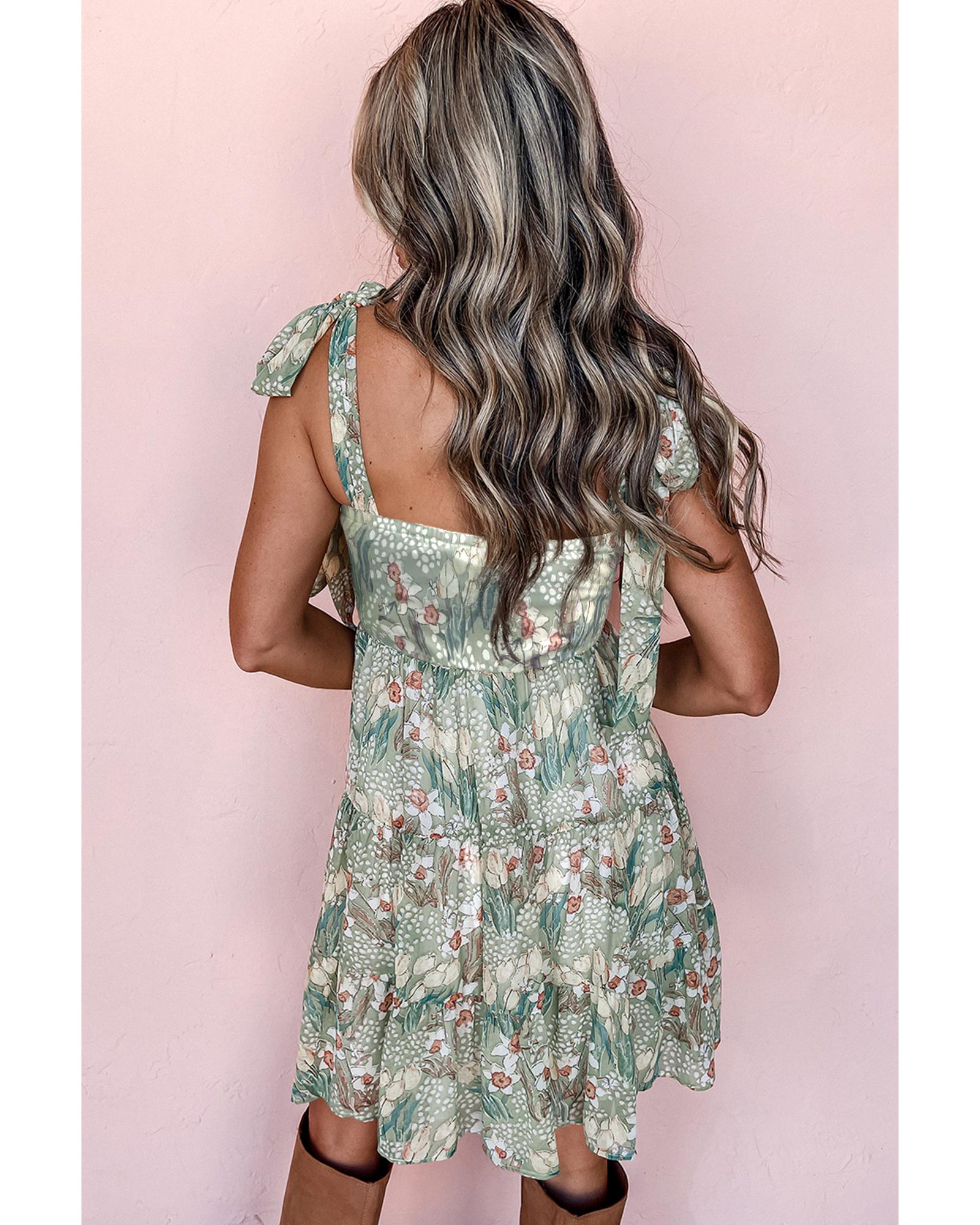 This gray floral mini dress features a stylish knotted strap design and a smocked panel that accentuates your curves. The tiered ruffles add a playful and feminine touch, while the vibrant floral print provides a pop of color and charm, making it perfect for a chic and lively look.