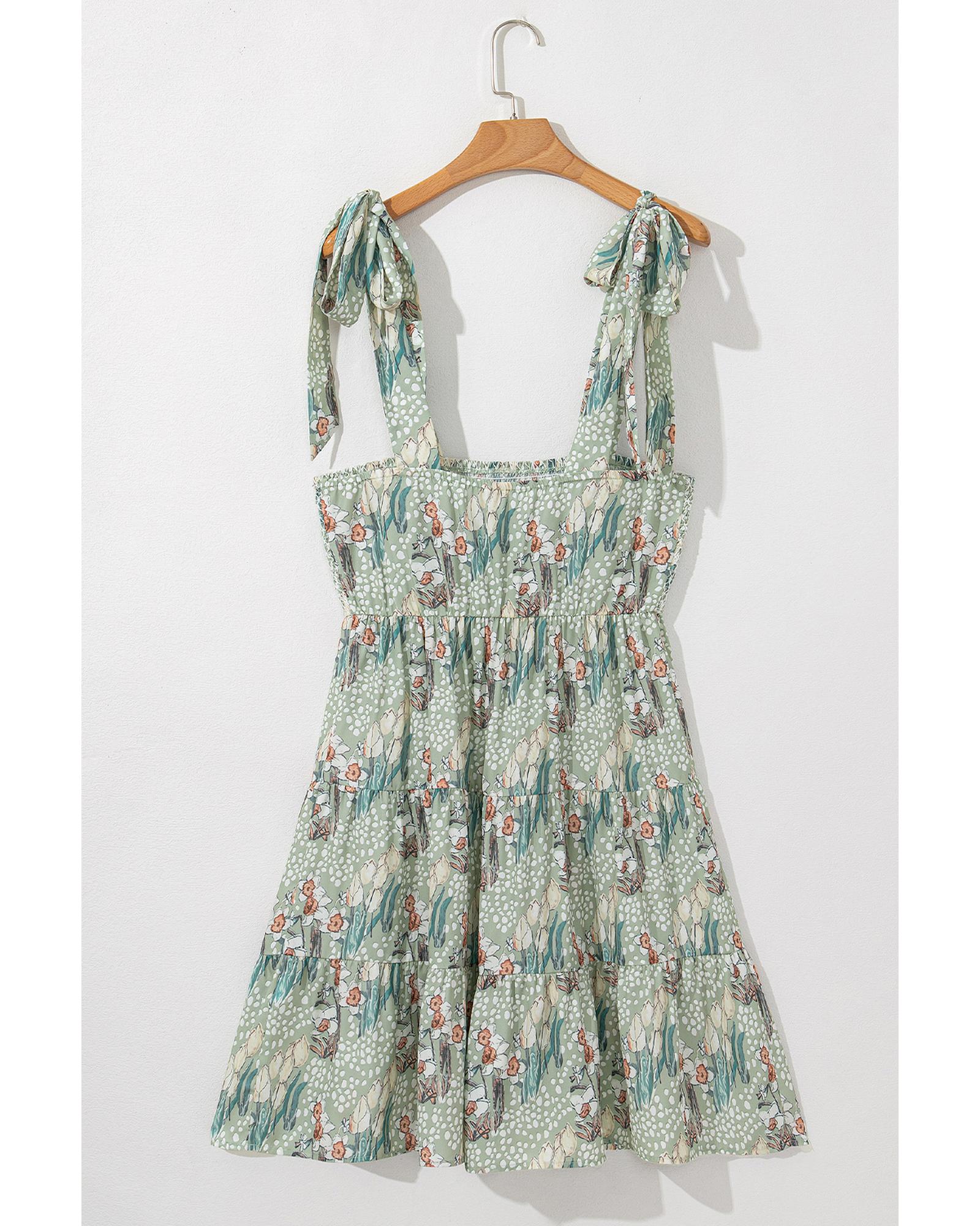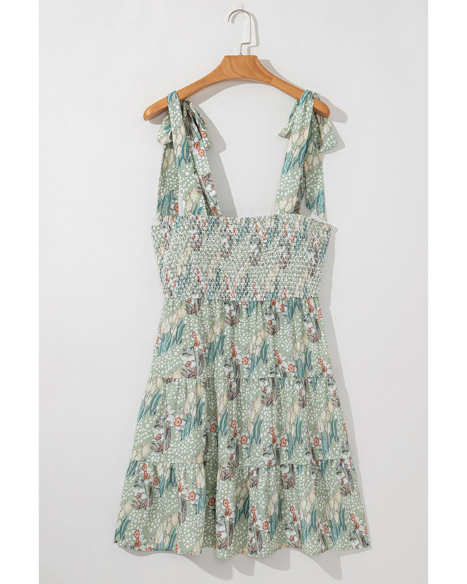 This gray floral mini dress features a stylish knotted strap design and a smocked panel that accentuates your curves. The tiered ruffles add a playful and feminine touch, while the vibrant floral print provides a pop of color and charm, making it perfect for a chic and lively look.