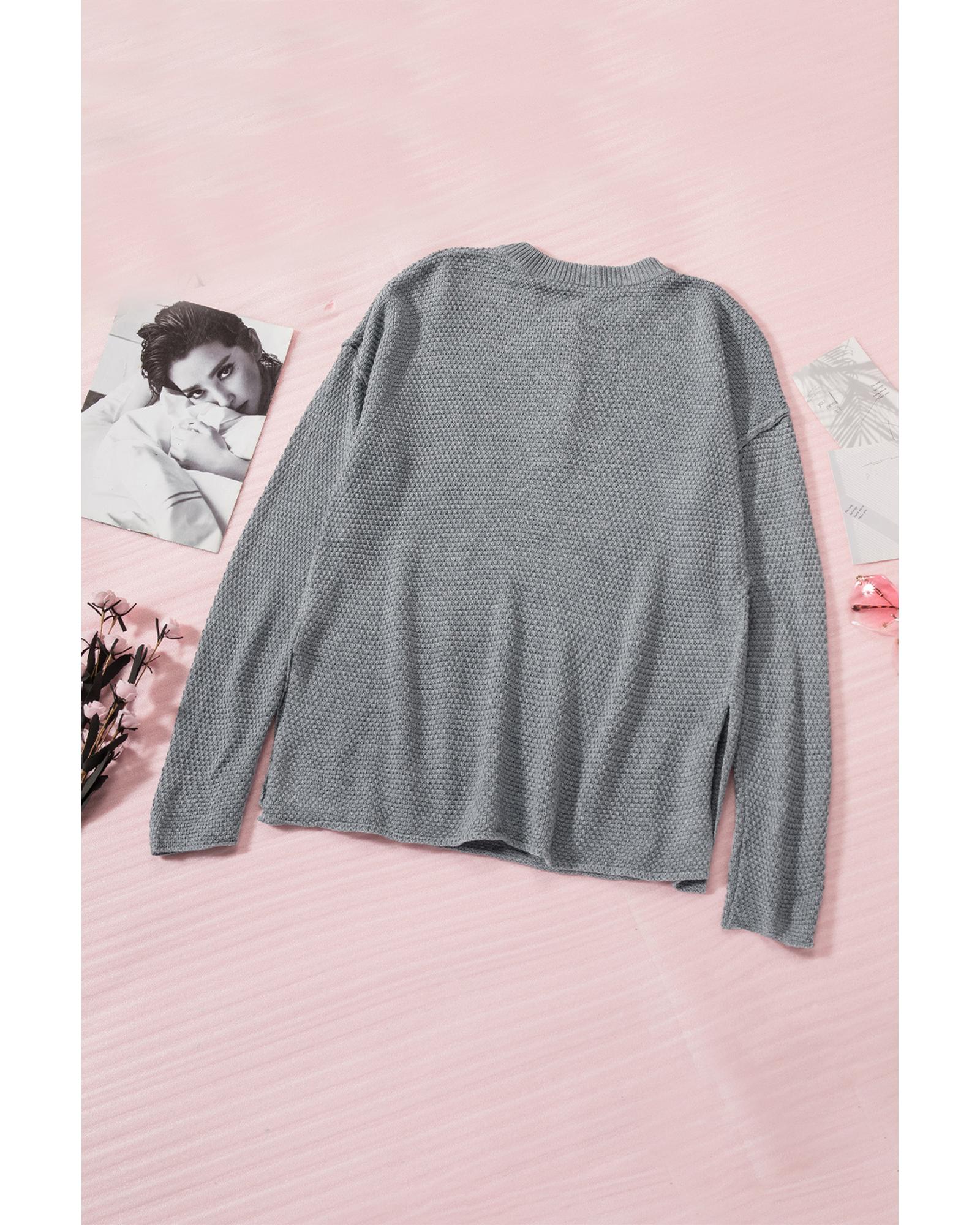 Gray Henley Pullover Drop Shoulder Sweater with Slits – L