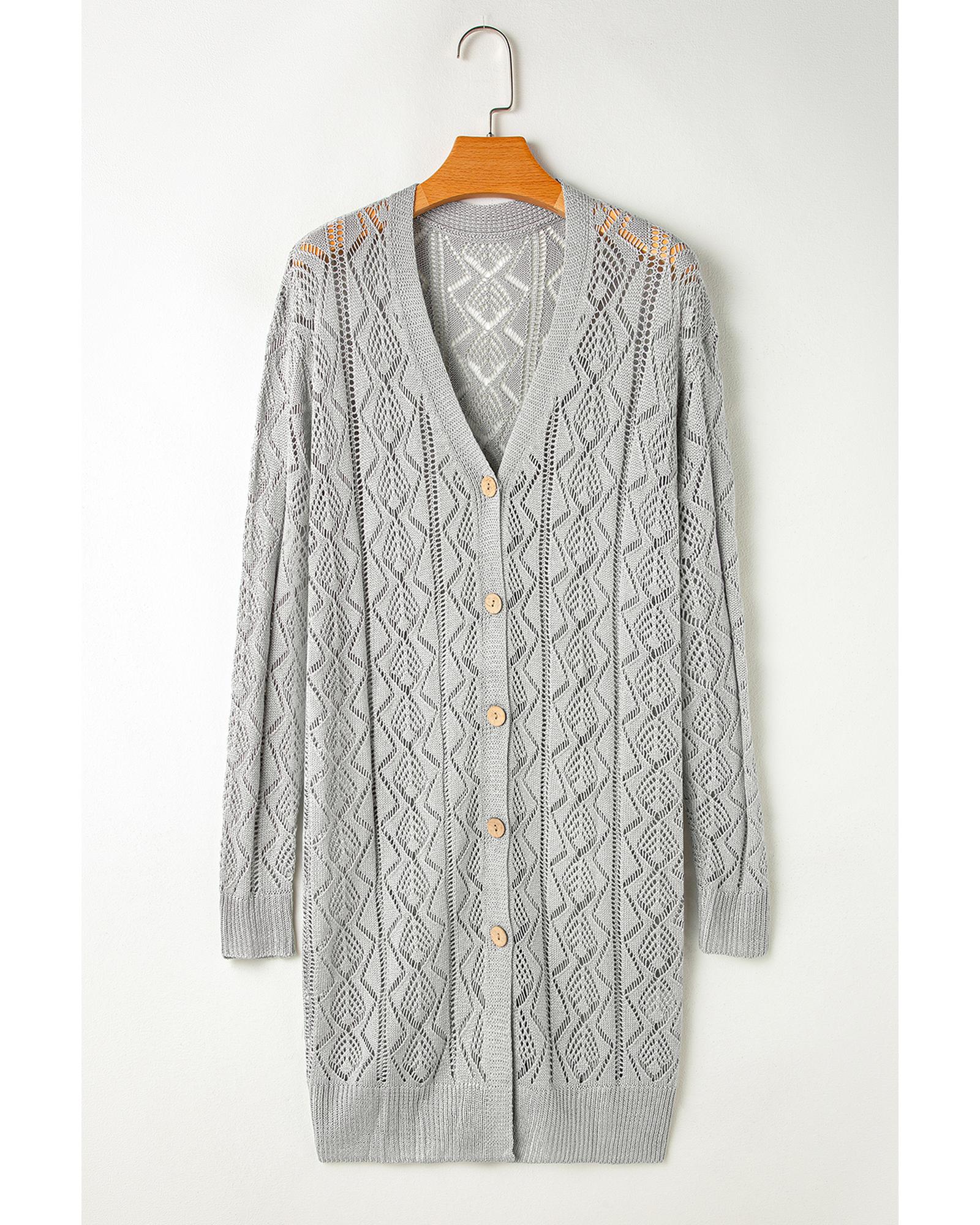 This long gray cardigan features a hollow out knit design with intricate detailing, offering a stylish and trendy look. It is designed with a classic V-neck and front button closure, providing a versatile and comfortable fit suitable for various occasions.