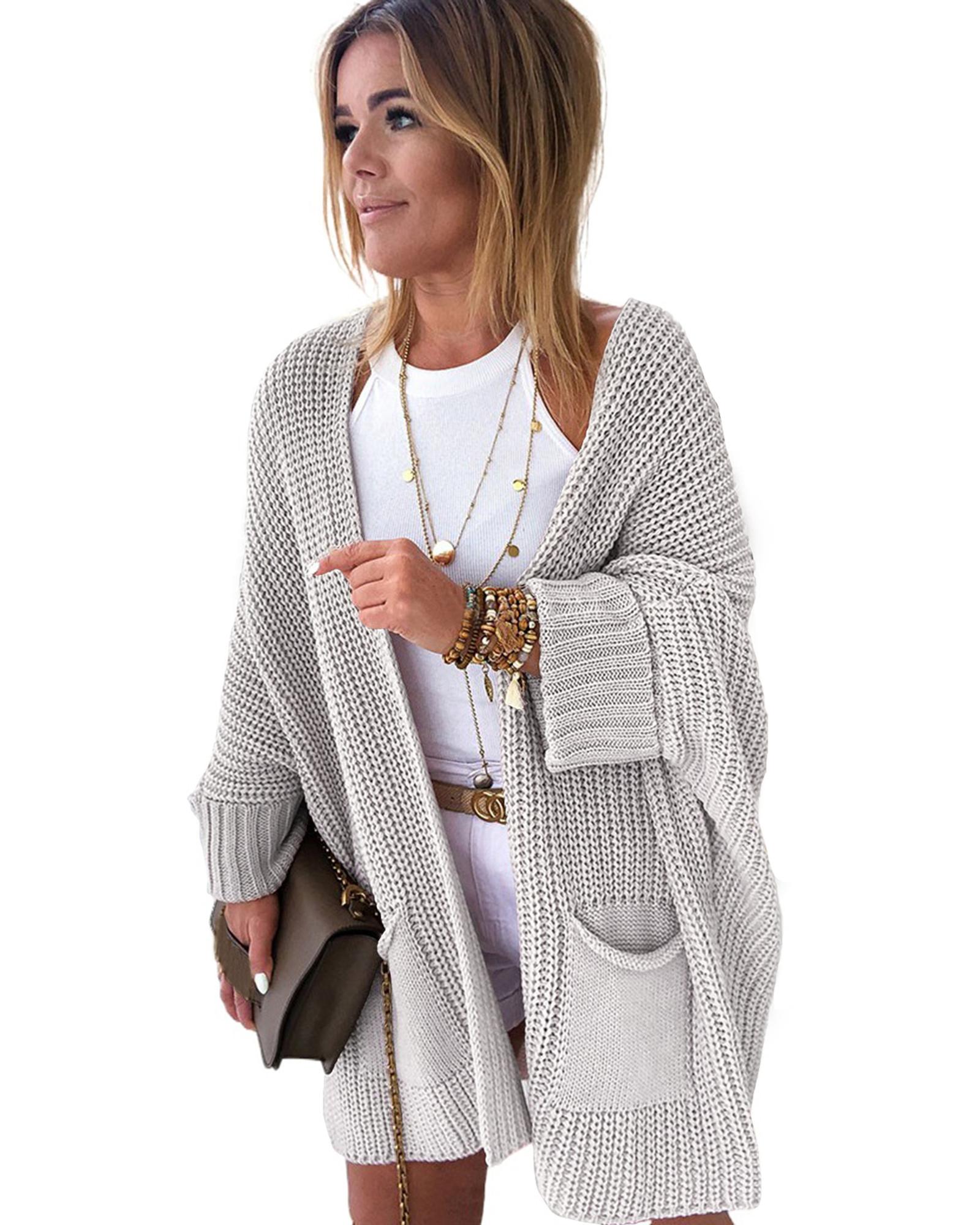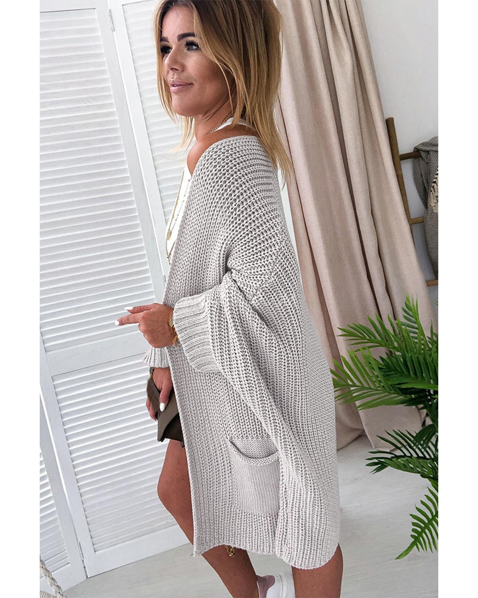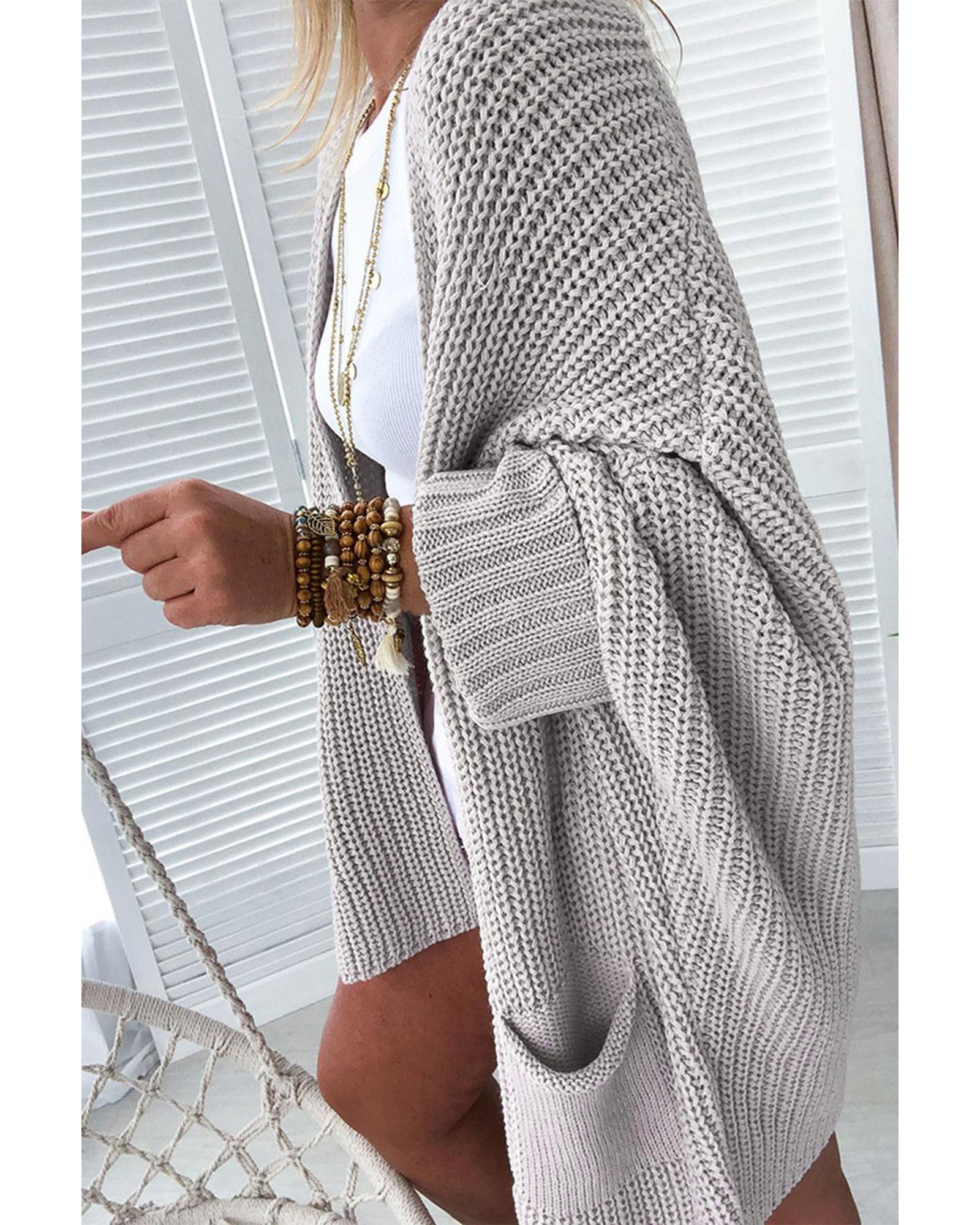 This oversized fold-over sleeve sweater cardigan offers a trendy and comfortable fit, perfect for casual and stylish wear. Its plain knit texture and subtle knitted patch pockets add to its minimalist appeal, while the open front design provides easy layering options.