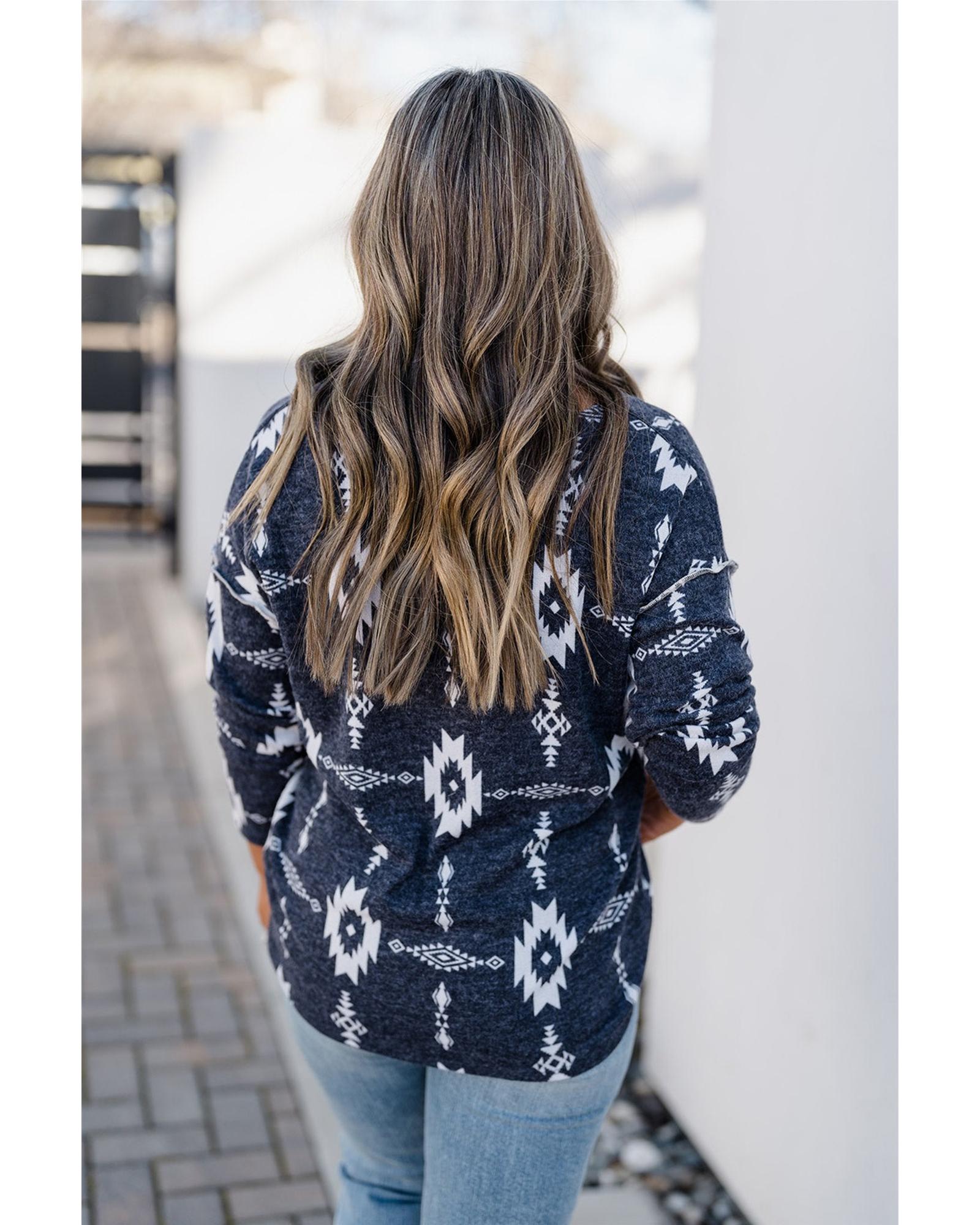 This top features a stylish aztec print design with exposed seams, offering a trendy and fitted look. It is available in plus sizes and crafted from high-quality materials, making it suitable for various occasions. The design emphasizes comfort and fashion, making it a versatile addition to your wardrobe.