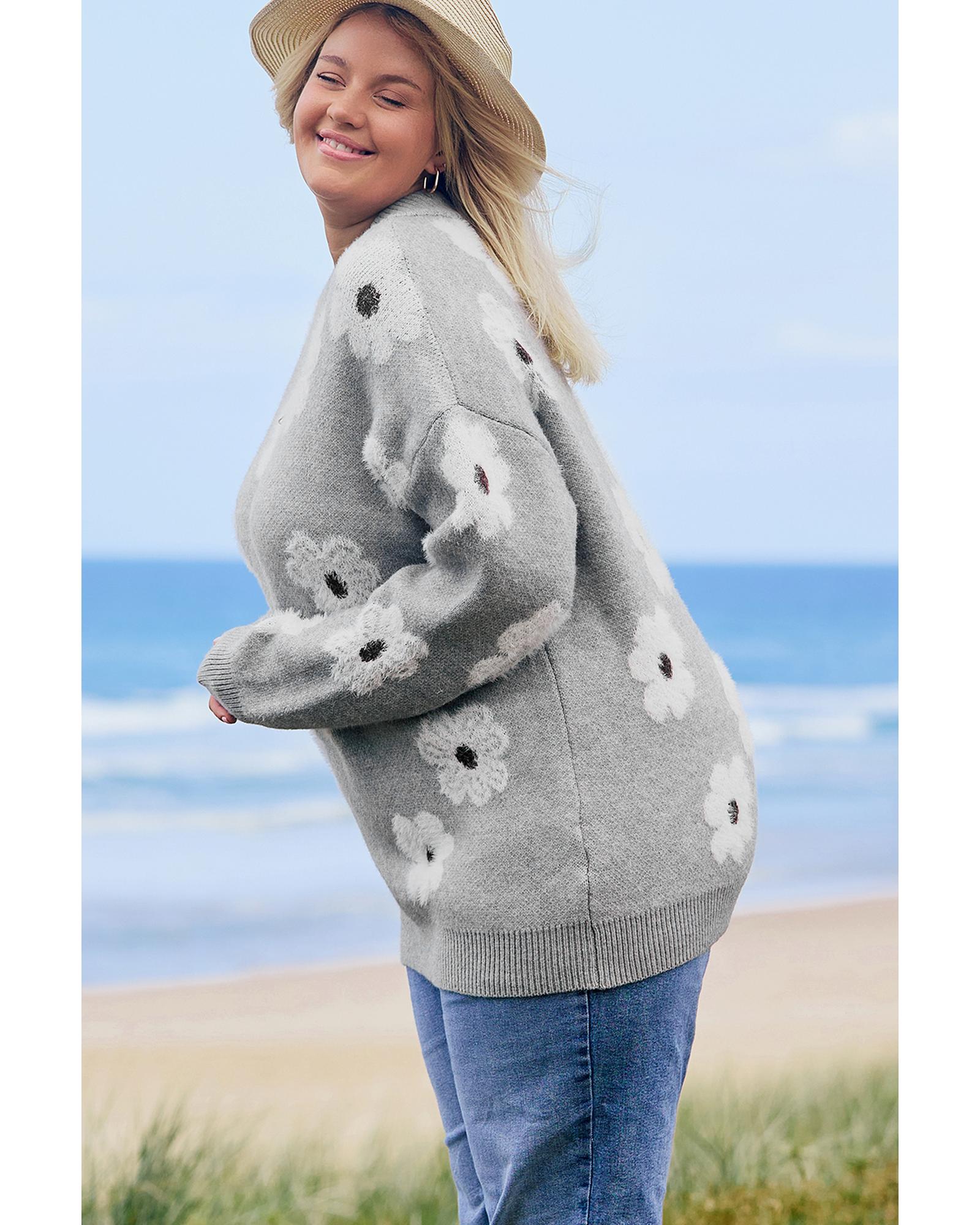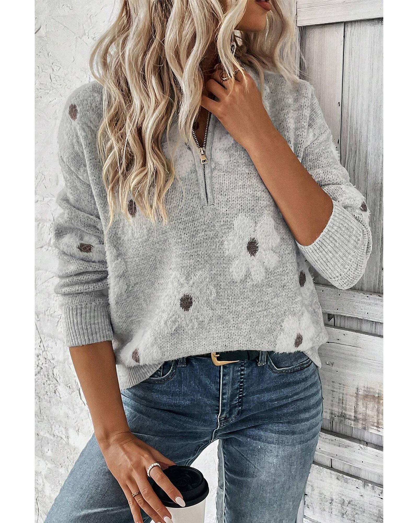 Gray Plus Size Embroidered Floral Pattern Half Zip Sweater – 4X