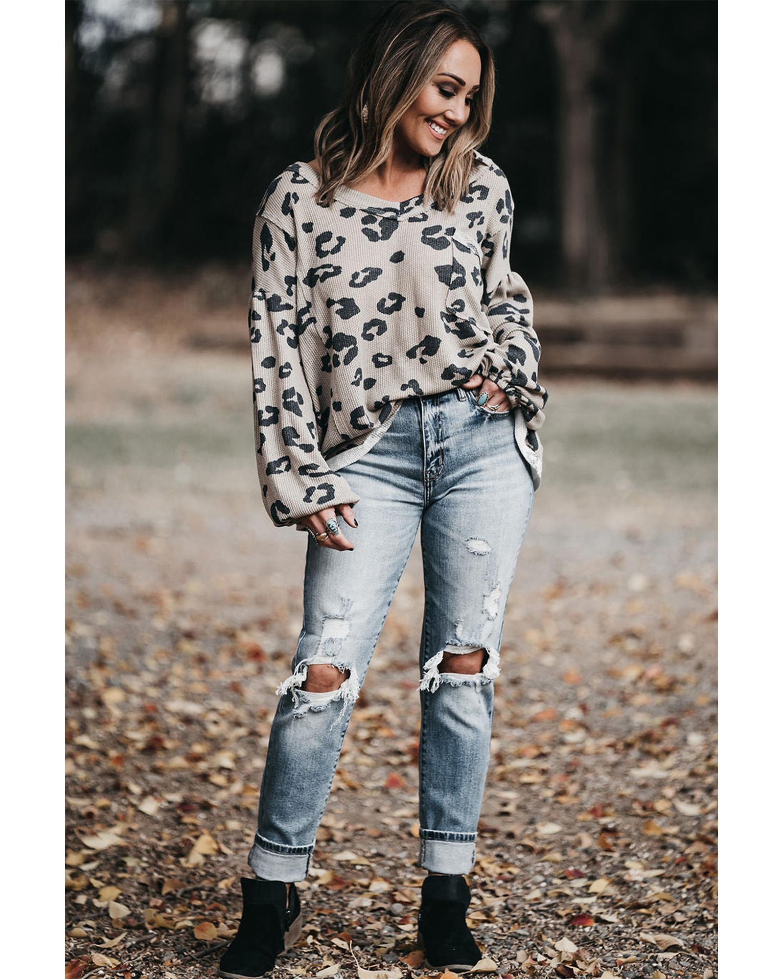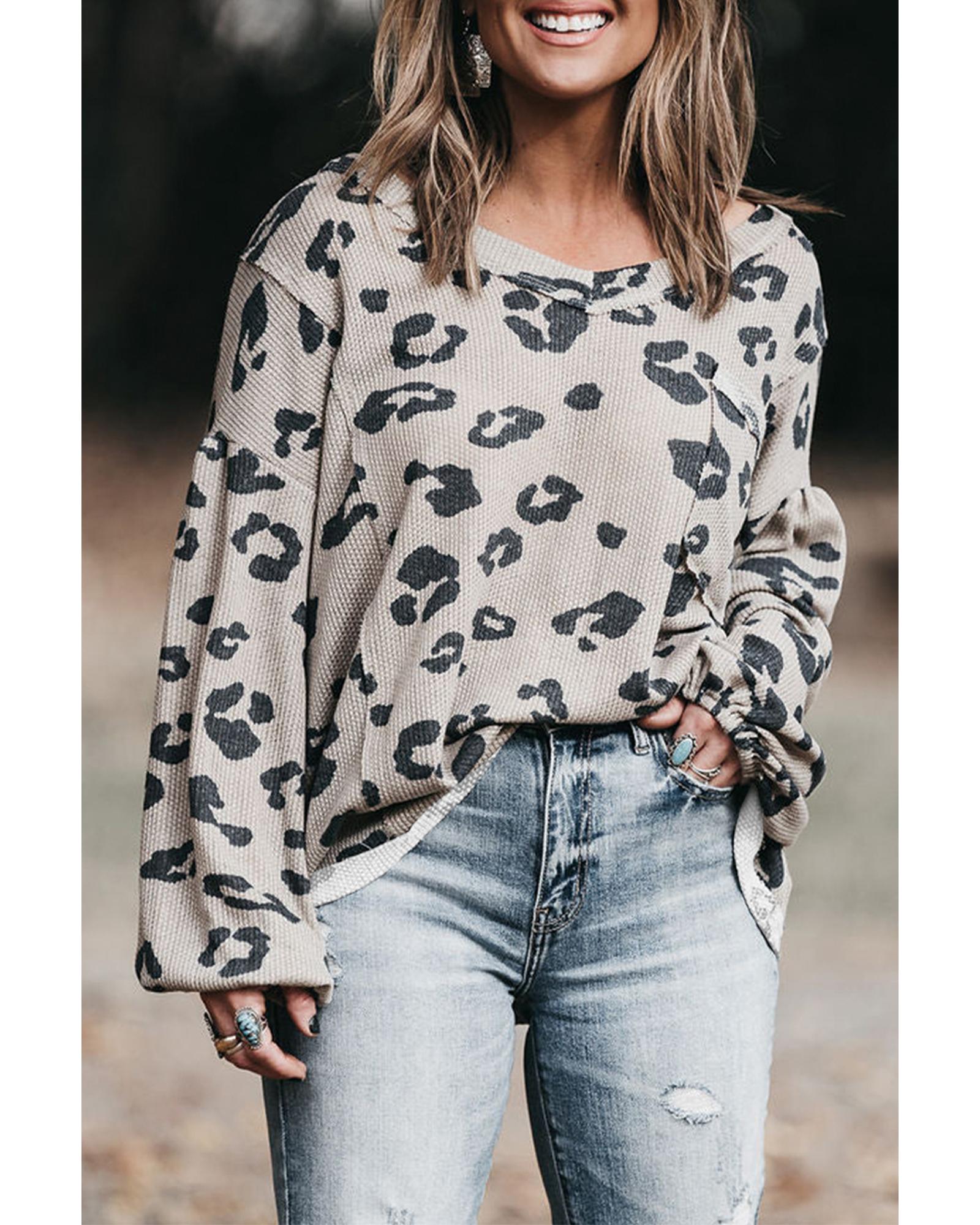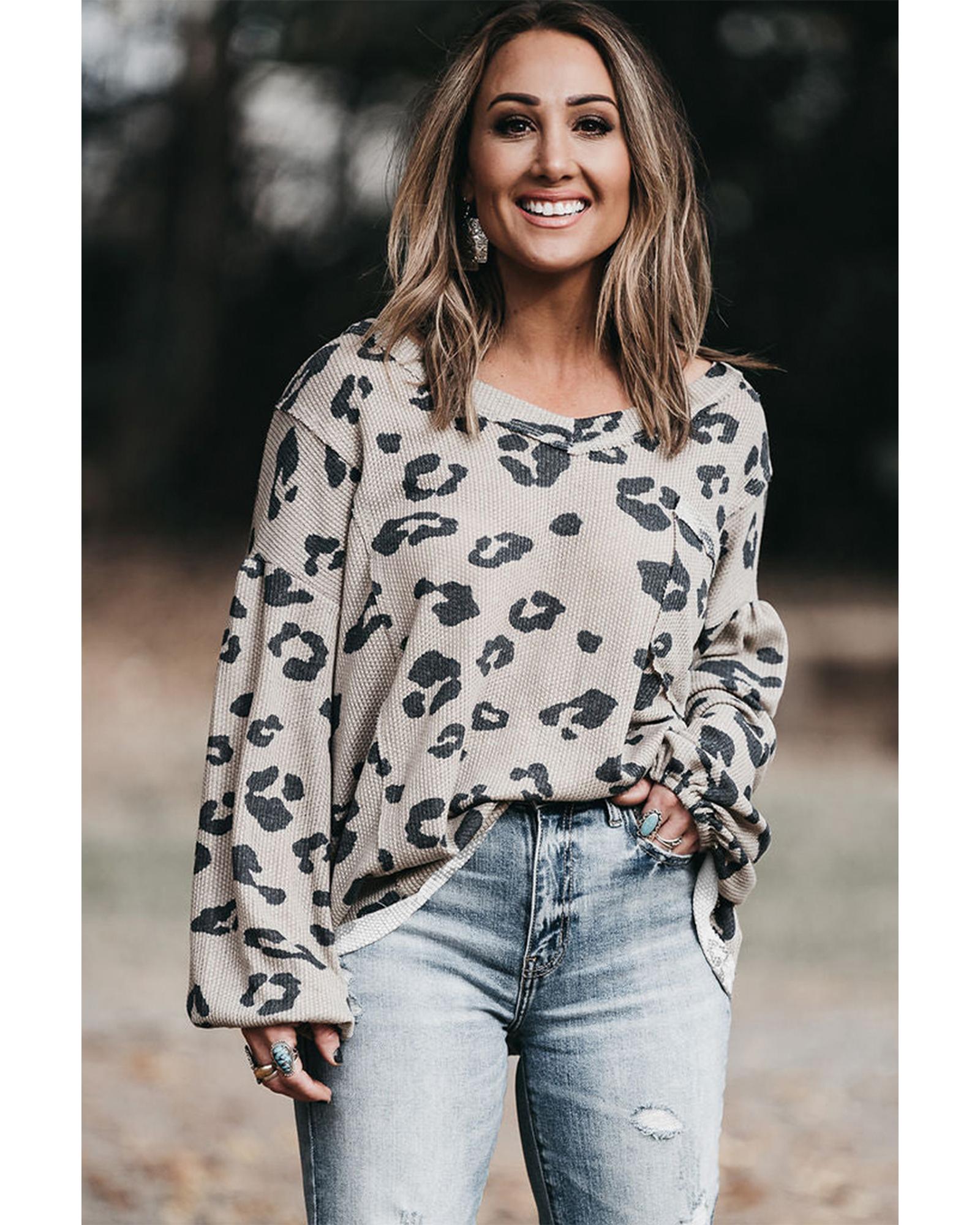 This thermal knit top features a stylish gray printed leopard pattern combined with balloon sleeves, offering a casual yet trendy look. Designed with a plus size fit, it provides comfort and fashion for a variety of body types.