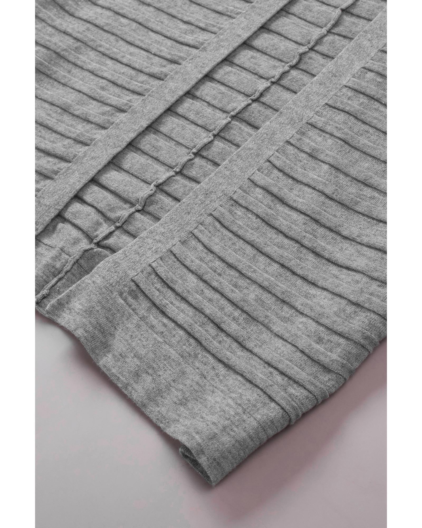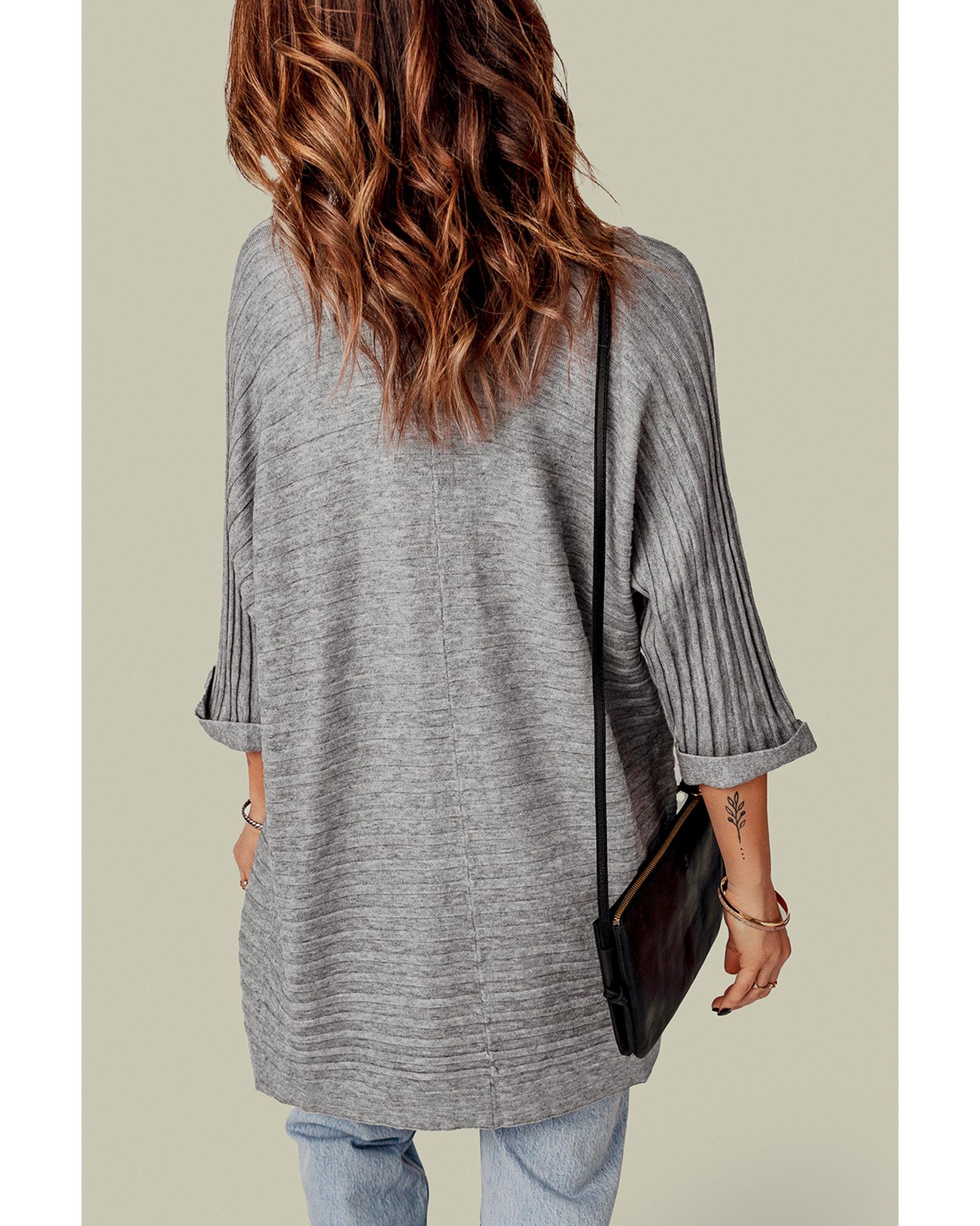 This gray ribbed open front knit cardigan features a trendy fitted design with a fashionable open front and 3/4 sleeves. The ribbed knit adds stylish detail, making it a versatile addition to your wardrobe. Crafted from soft, smooth, and skin-friendly fabric, it offers comfort and style for various casual occasions.