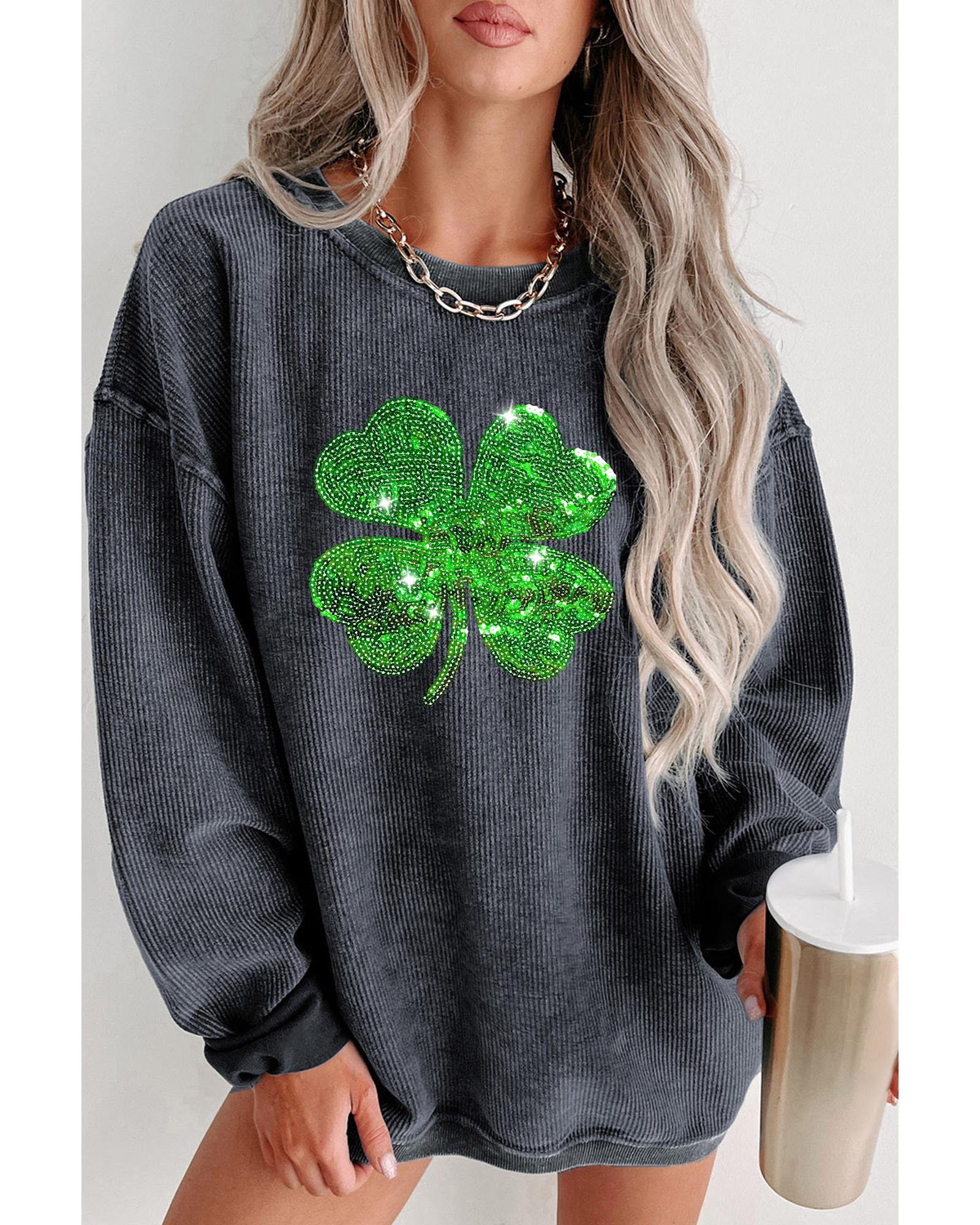 This gray sweatshirt features a stylish design with a glittering sequined leaf clover patch, making it suitable for various casual occasions. Crafted from comfortable corded fabric, it offers a relaxed fit that is easy to pair with jeans, shorts, or skinny pants. The sweatshirt is available in multiple sizes to ensure a good fit for different body types.