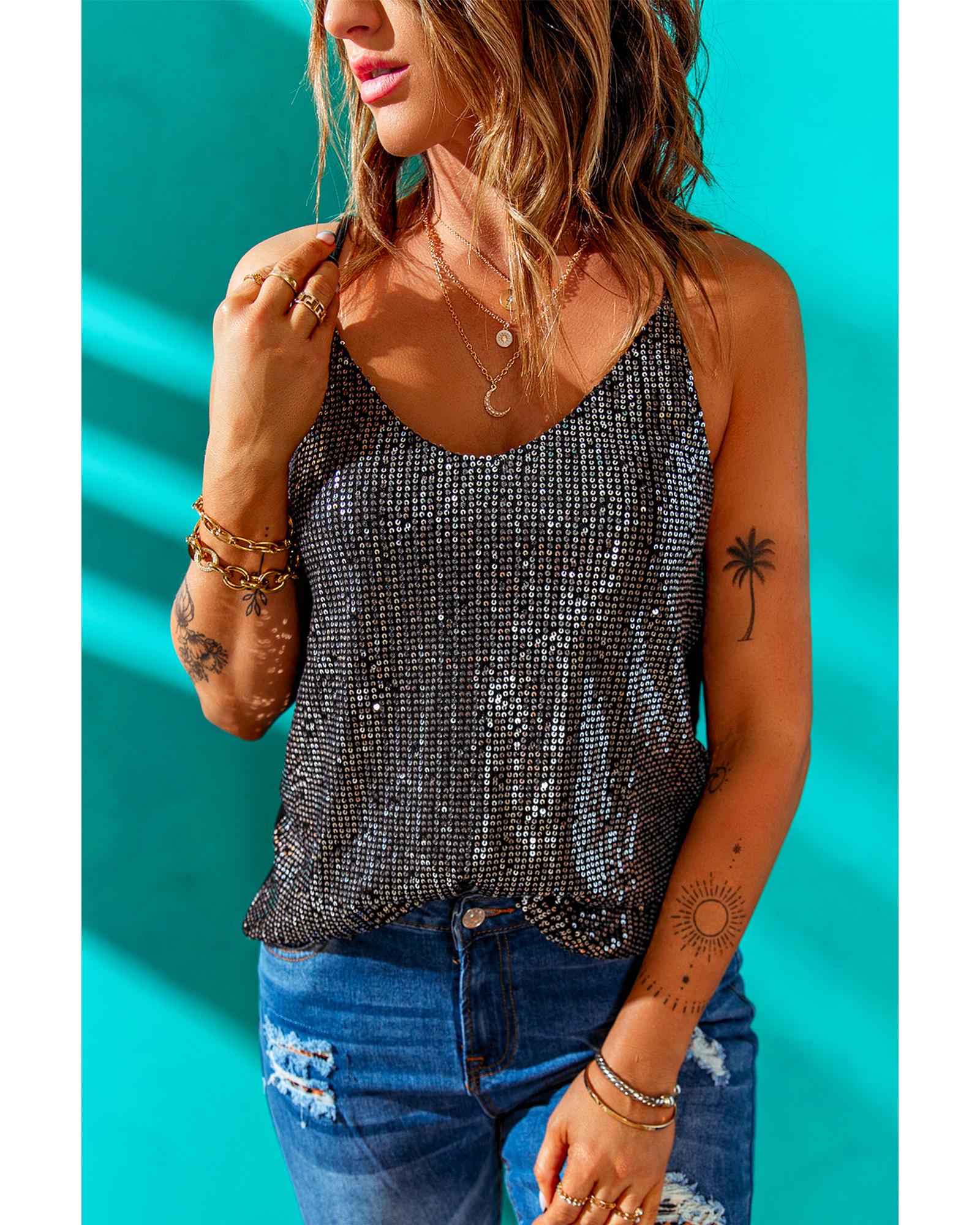 This Gray Sequin Tank Top features a trendy fitted design with a shimmering sequin fabric, making it suitable for both party nights and daily wear. It offers a stylish and comfortable option that can be paired easily with various bottoms for different occasions.