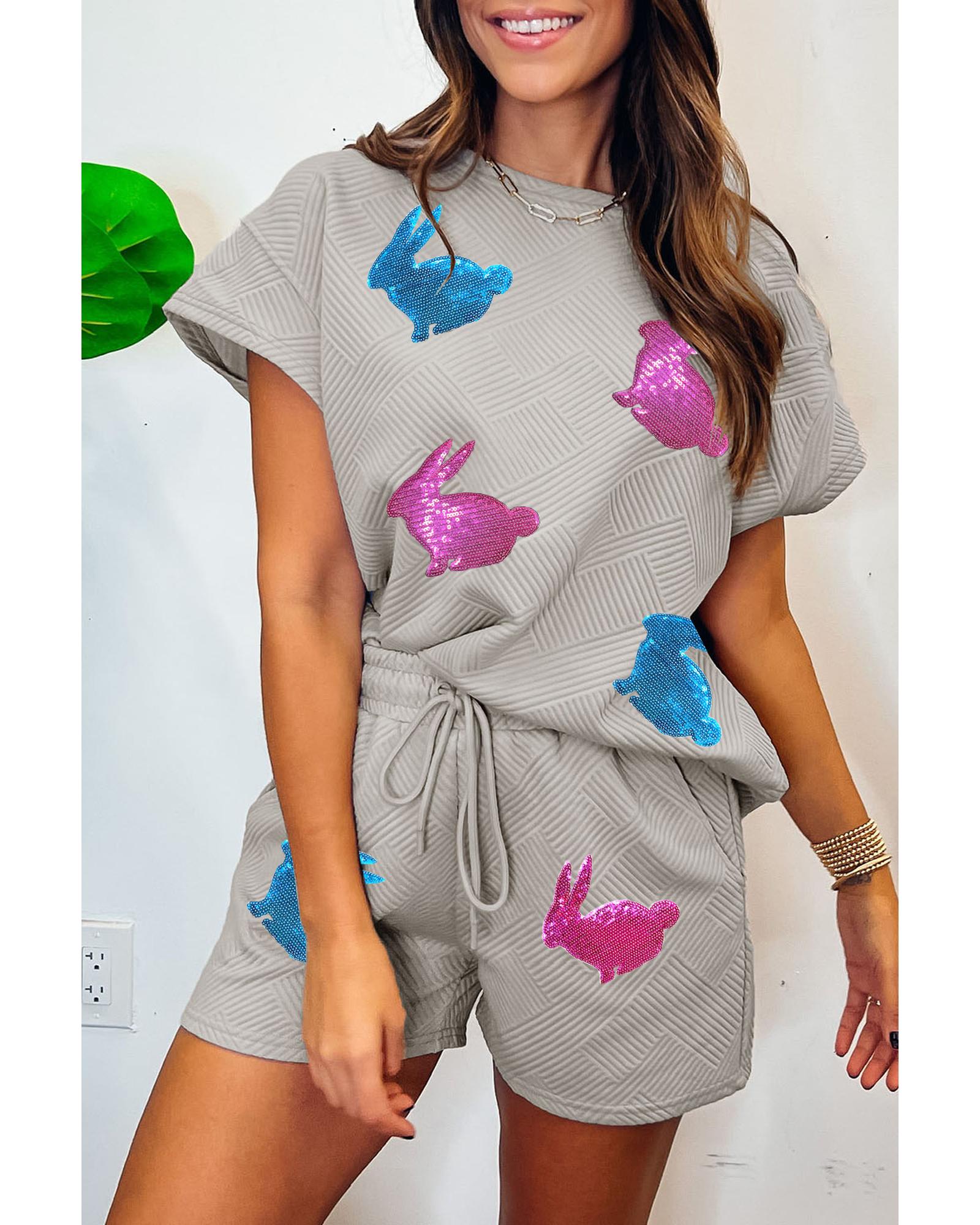 This gray shiny Easter bunny patch short outfit features a textured design that adds a playful and stylish touch to your wardrobe. Crafted with a comfortable fit in mind, it is suitable for women seeking a trendy and festive look for the holiday season.