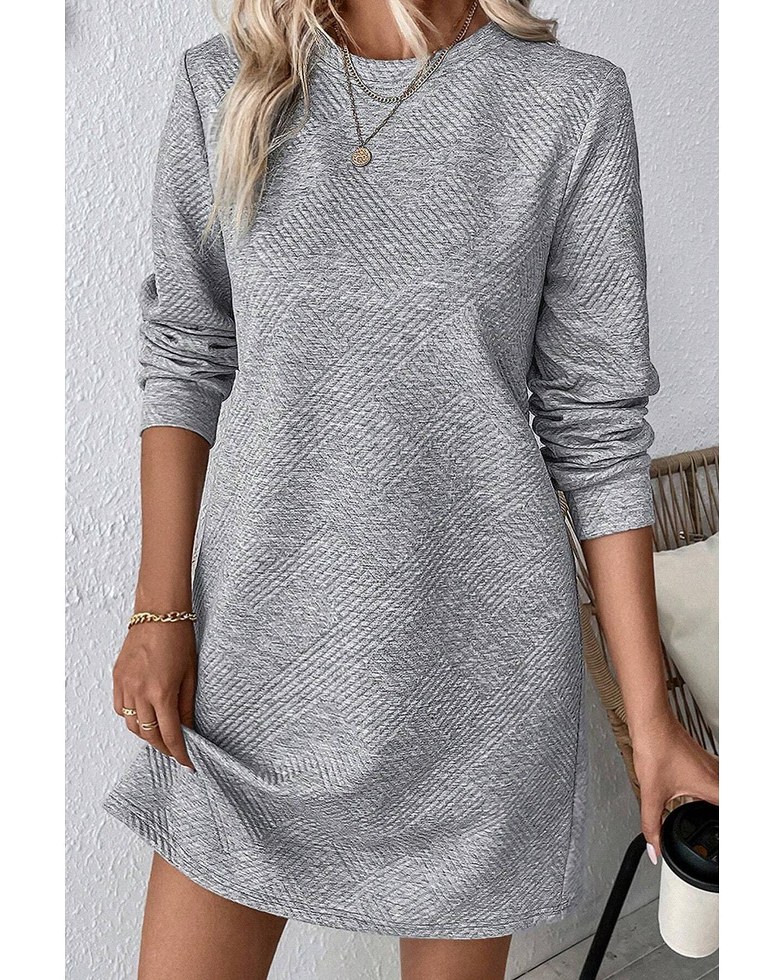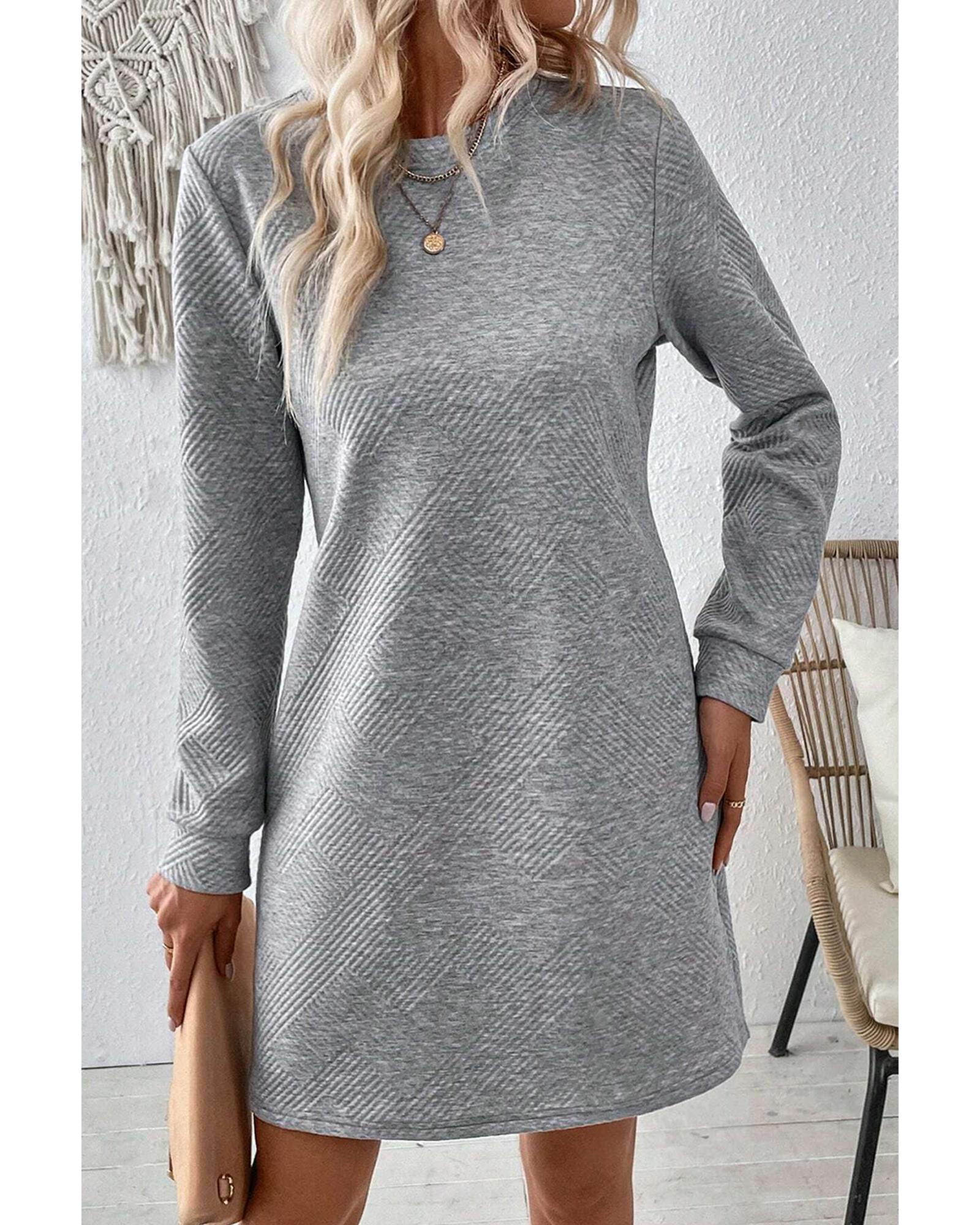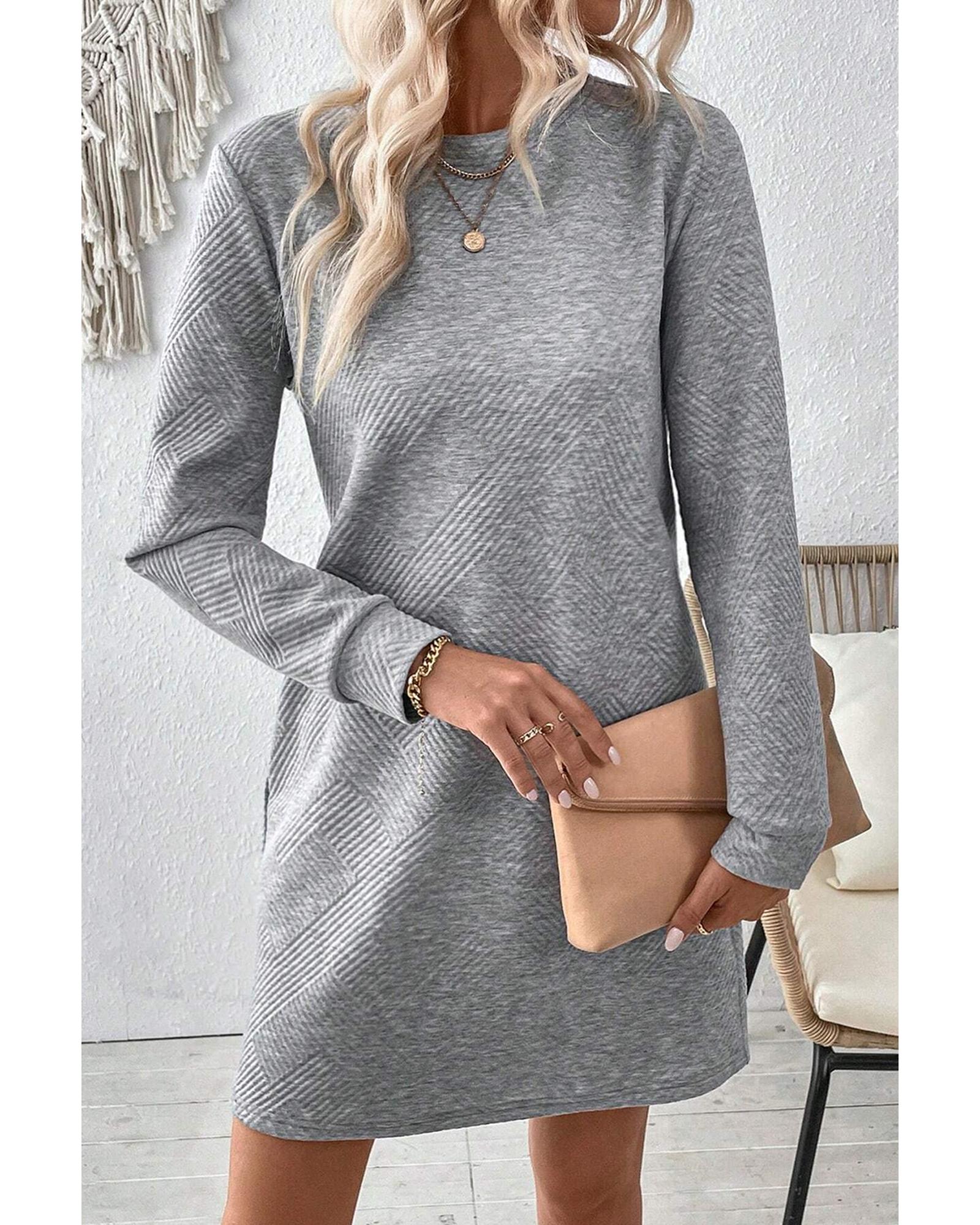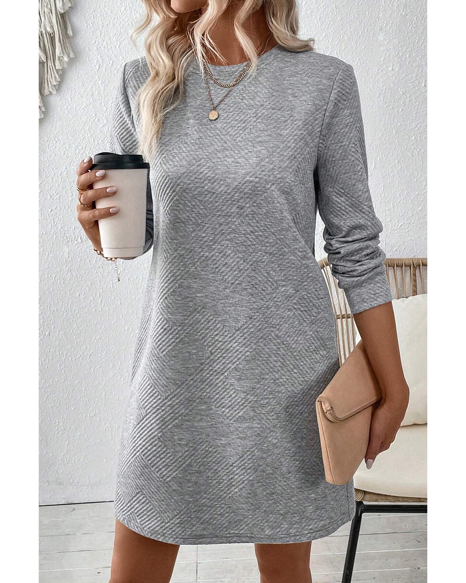 This gray textured long sleeve shift dress offers a stylish and comfortable option for various occasions. Its classic design features a crew neck and long sleeves, complemented by a textured fabric that adds visual interest. The shift silhouette provides a flattering fit, and the mini length makes it versatile for different settings.