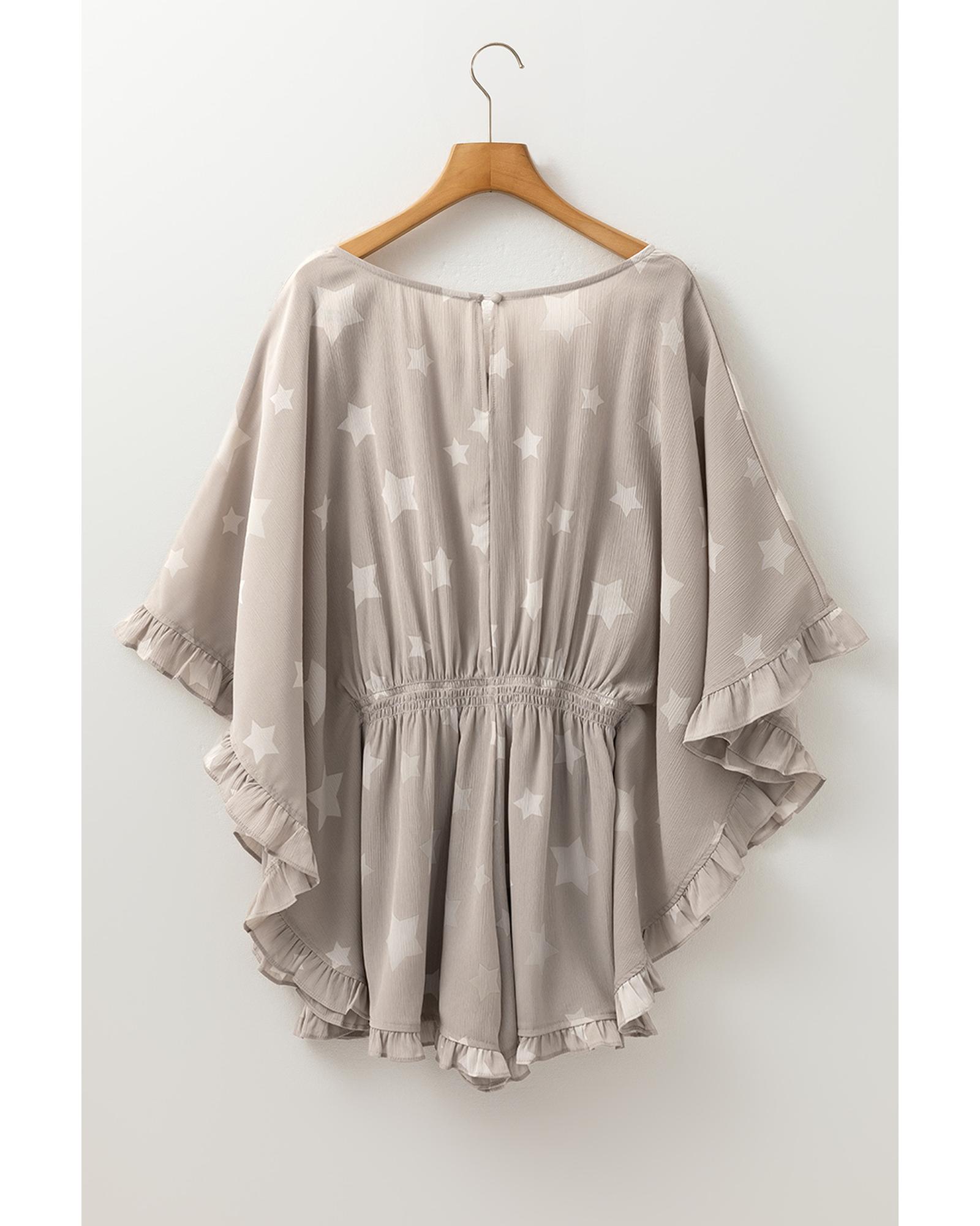 This romper features a charming gray star print and a textured crinkle fabric, offering a relaxed yet elegant silhouette. The kimono style and ruffled sleeve details add a touch of femininity and style, making it suitable for various occasions.