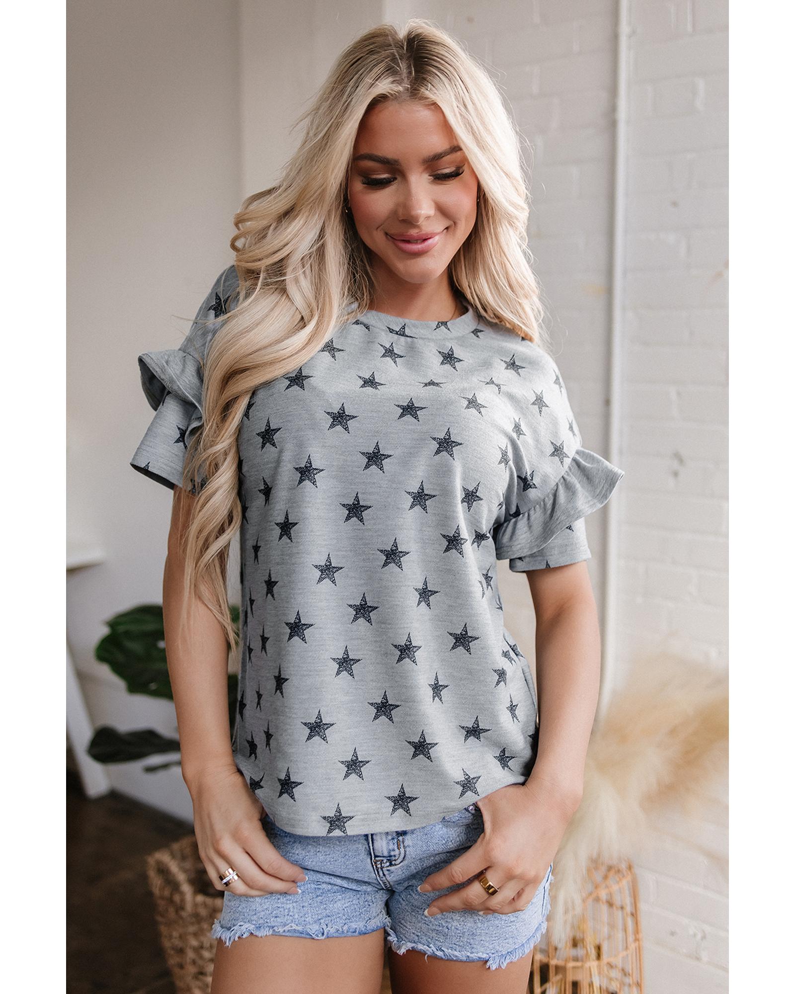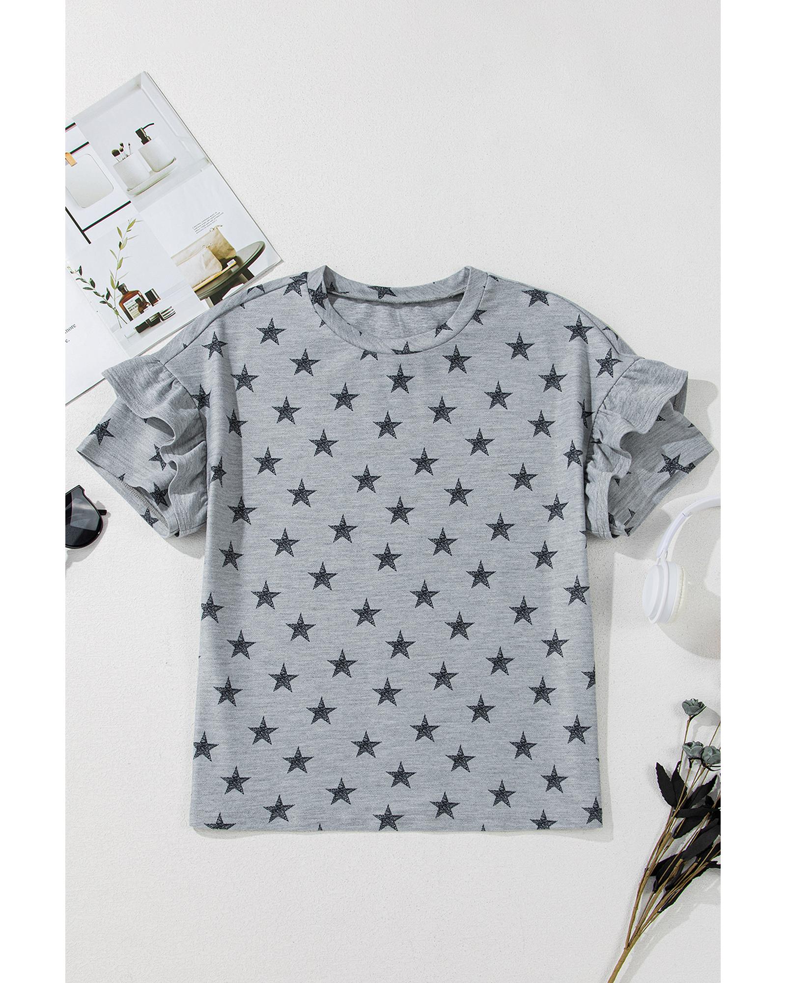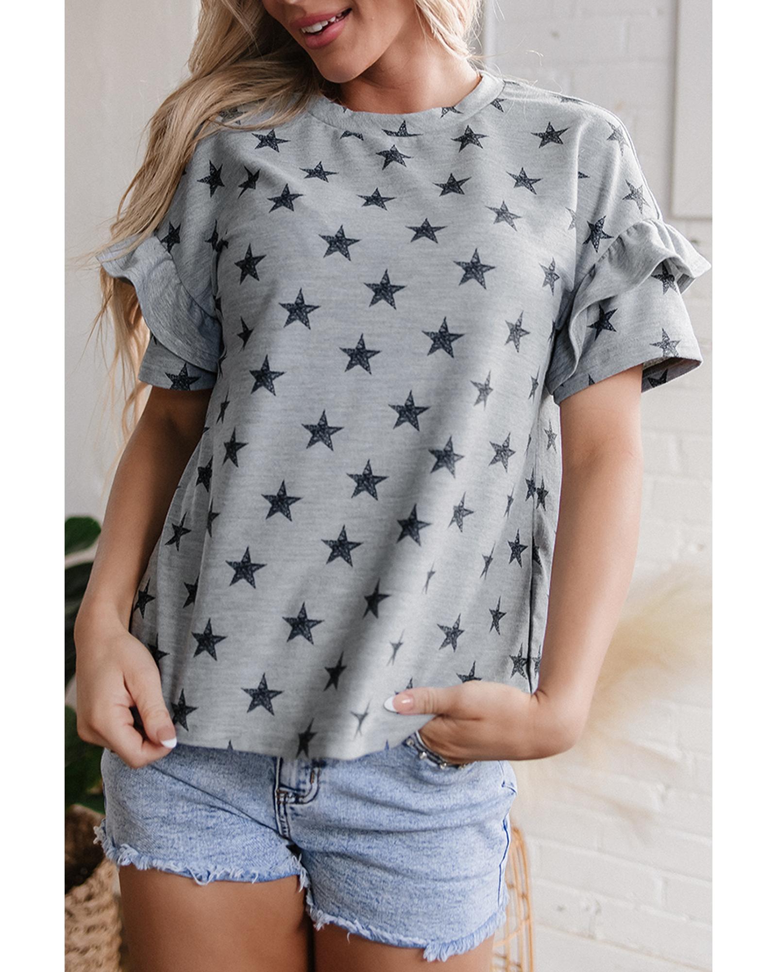 This Gray Star Print Tiered Ruffled Sleeve Crew Neck T Shirt combines a stylish design with comfortable wear. It features playful star prints and tiered ruffled sleeves, adding a feminine and whimsical touch to your everyday wardrobe. Made from soft, breathable fabric, it ensures all-day comfort.