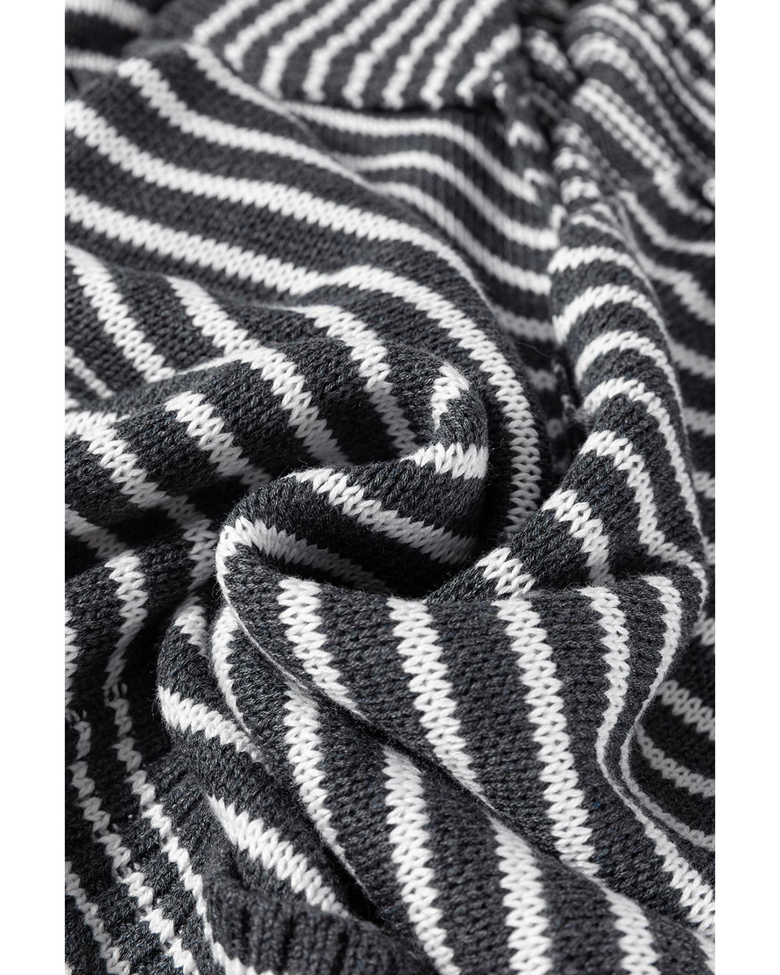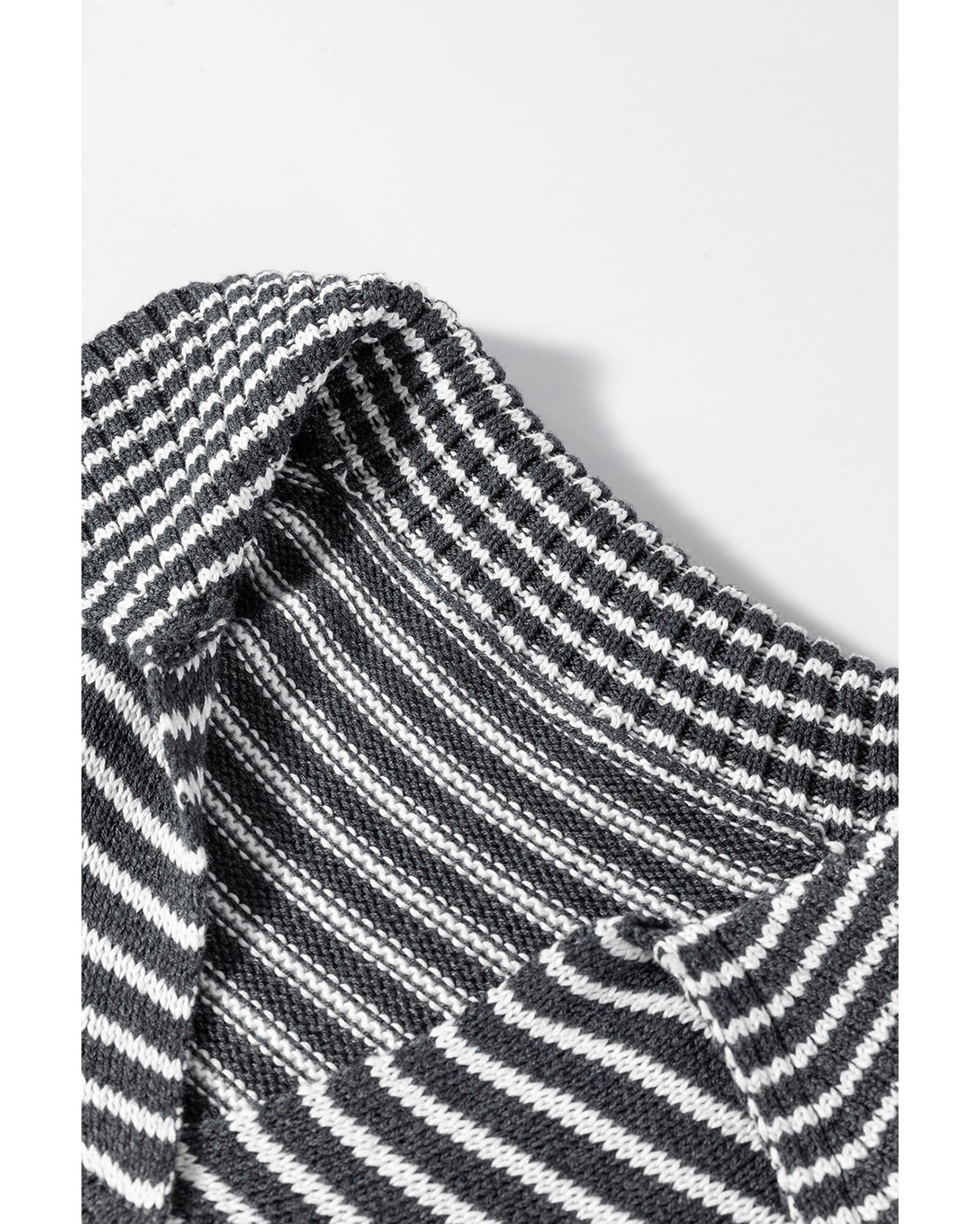 This gray stripe collared V-neck sweater vest features a sleeveless design with convenient pockets, making it a versatile addition to your wardrobe. Crafted from lightweight knit material, it offers a comfortable fit and stylish appearance suitable for various occasions.
