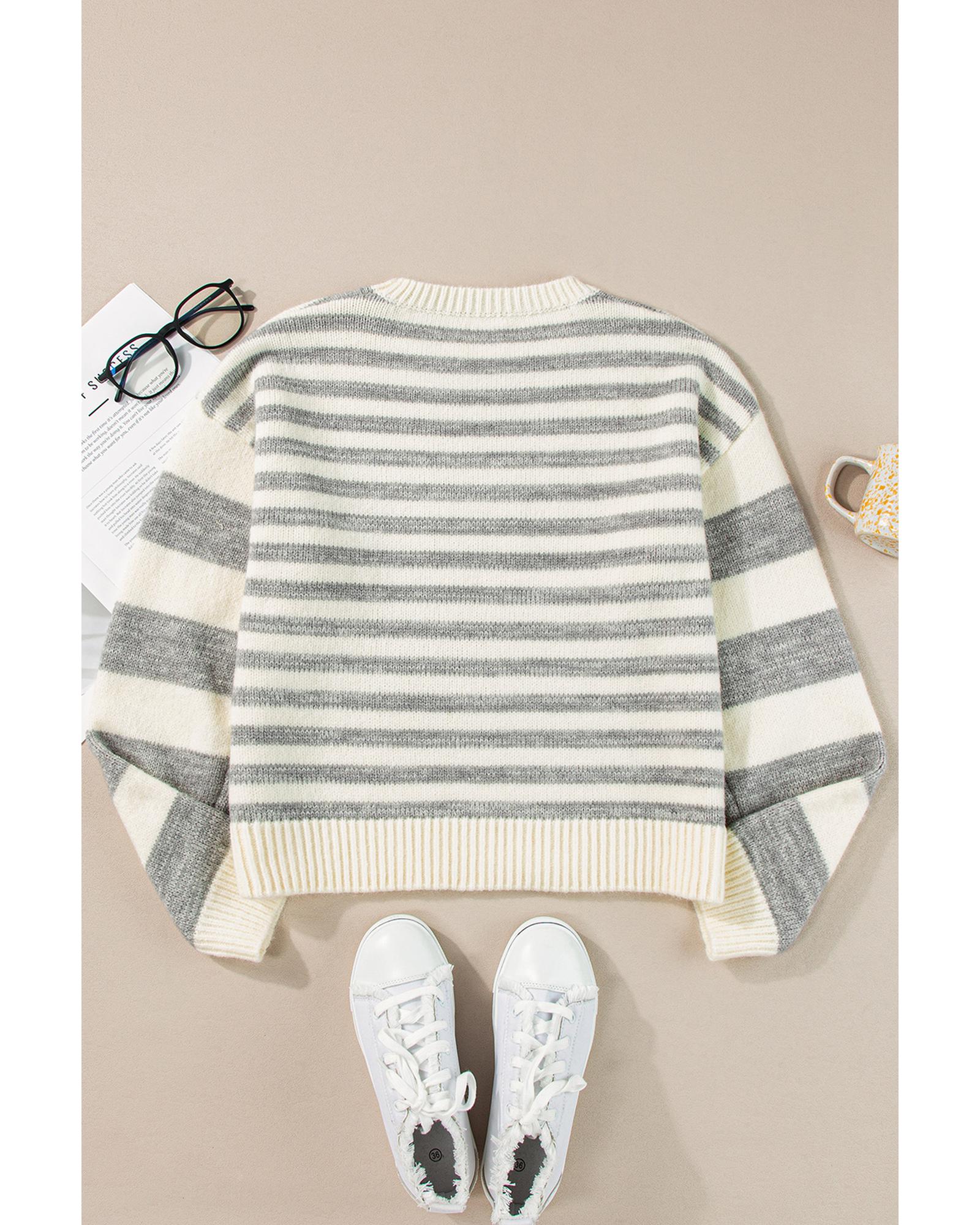 This gray stripe drop shoulder crew neck sweater offers a casual and timeless style with a relaxed fit. Designed with a trendy fitted look, it features a classic striped pattern and a comfortable round neck. Made from soft and warm knitted fabric, it provides both style and comfort for everyday wear.