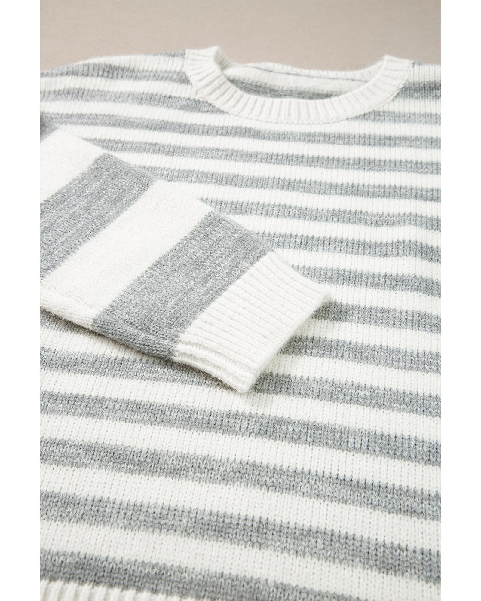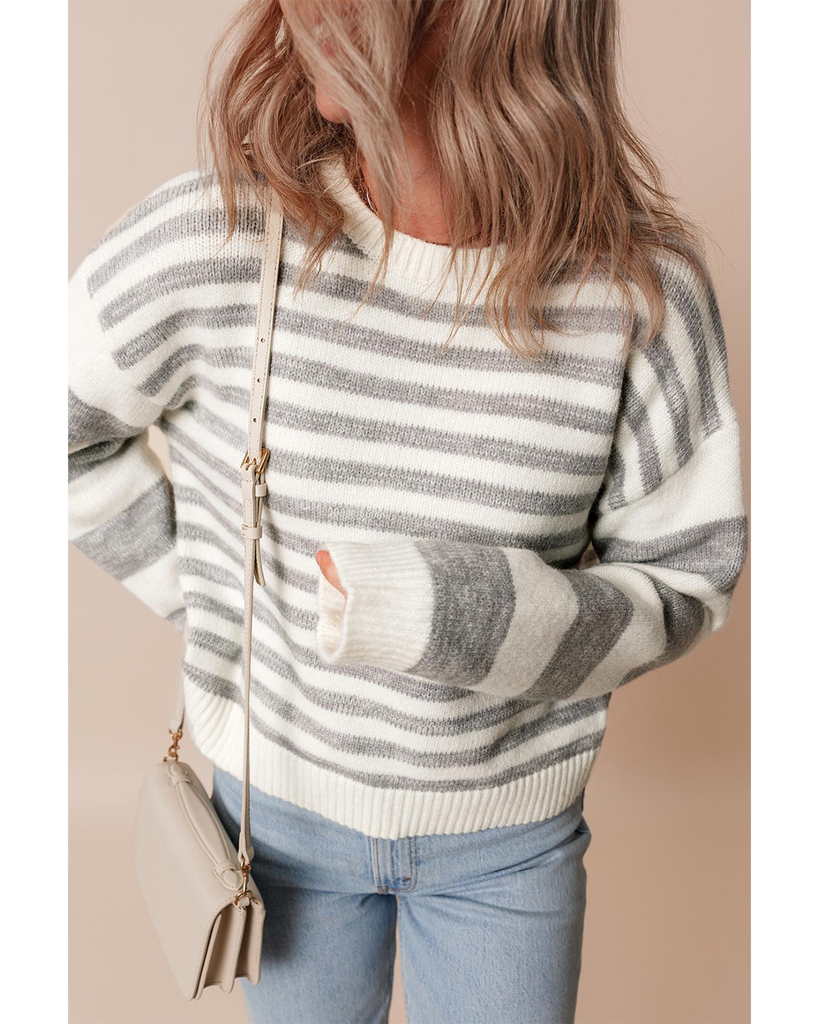 This gray stripe drop shoulder crew neck sweater offers a casual and timeless style with a relaxed fit. Designed with a trendy fitted look, it features a classic striped pattern and a comfortable round neck. Made from a soft and warm knitted fabric, it provides both style and comfort for everyday wear.