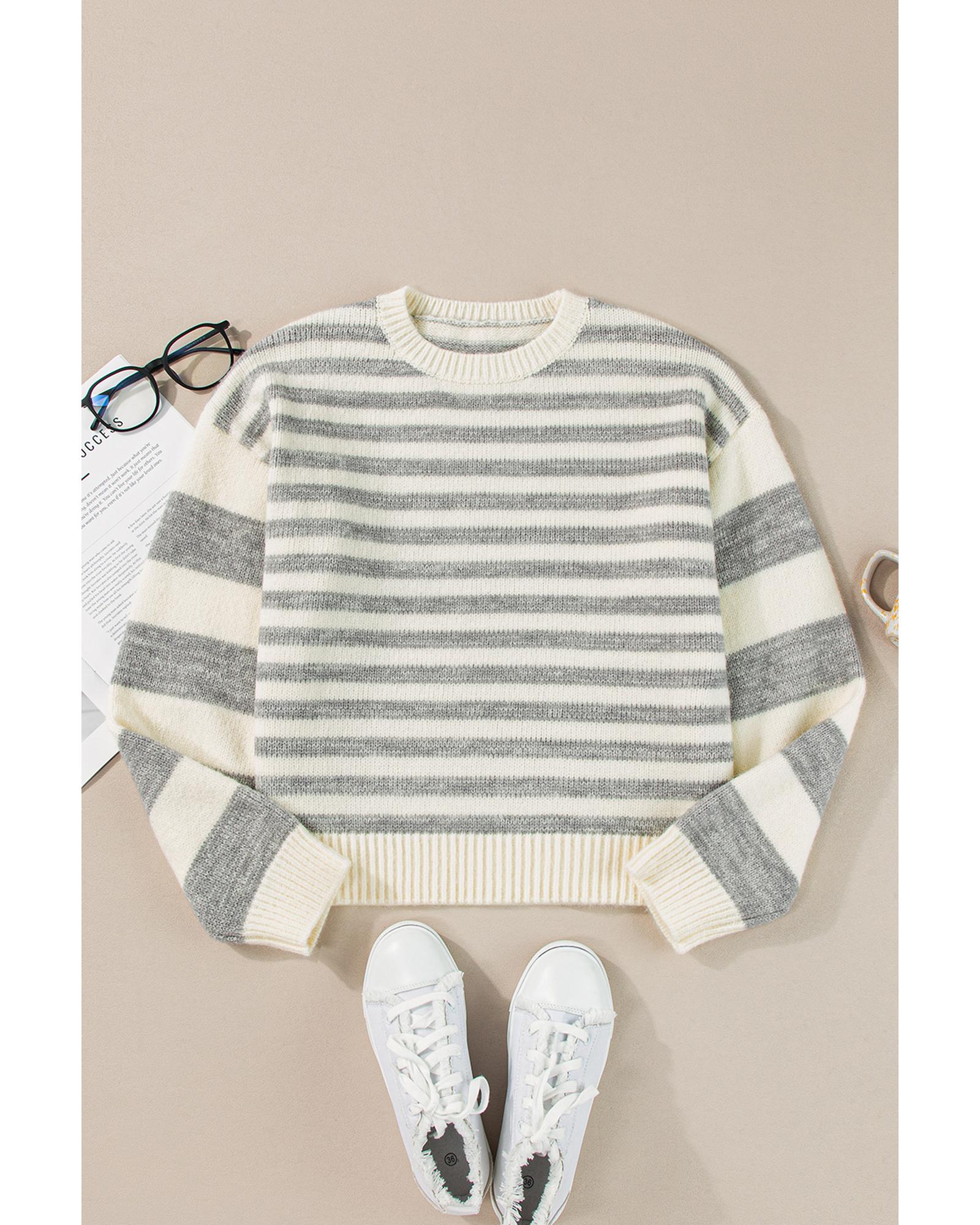 This gray stripe drop shoulder crew neck sweater offers a casual and timeless style with a relaxed fit. Designed for comfort and warmth, it features a classic striped pattern and a round neckline, making it suitable for everyday wear.