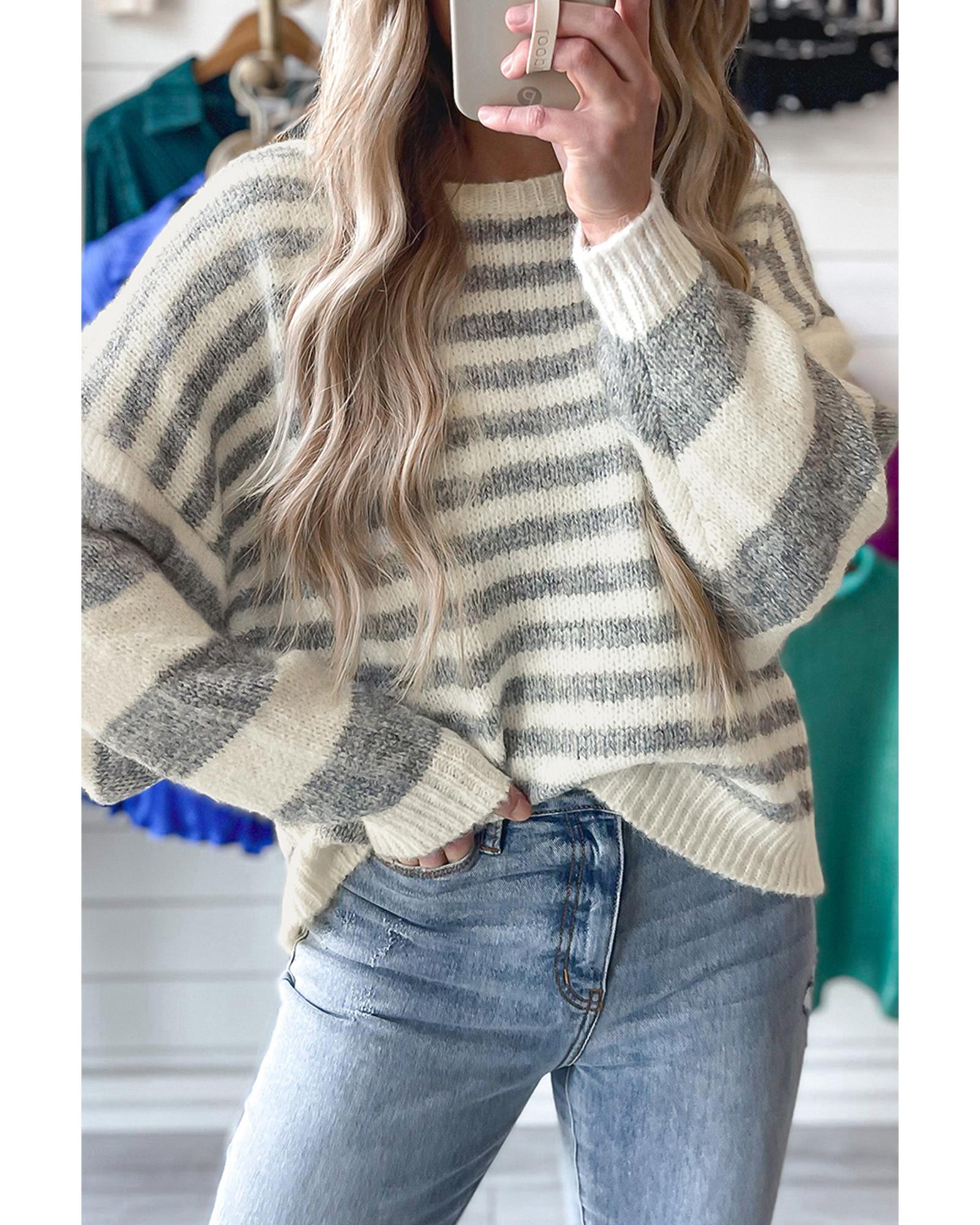 Gray Stripe Drop Shoulder Crew Neck Sweater – XL