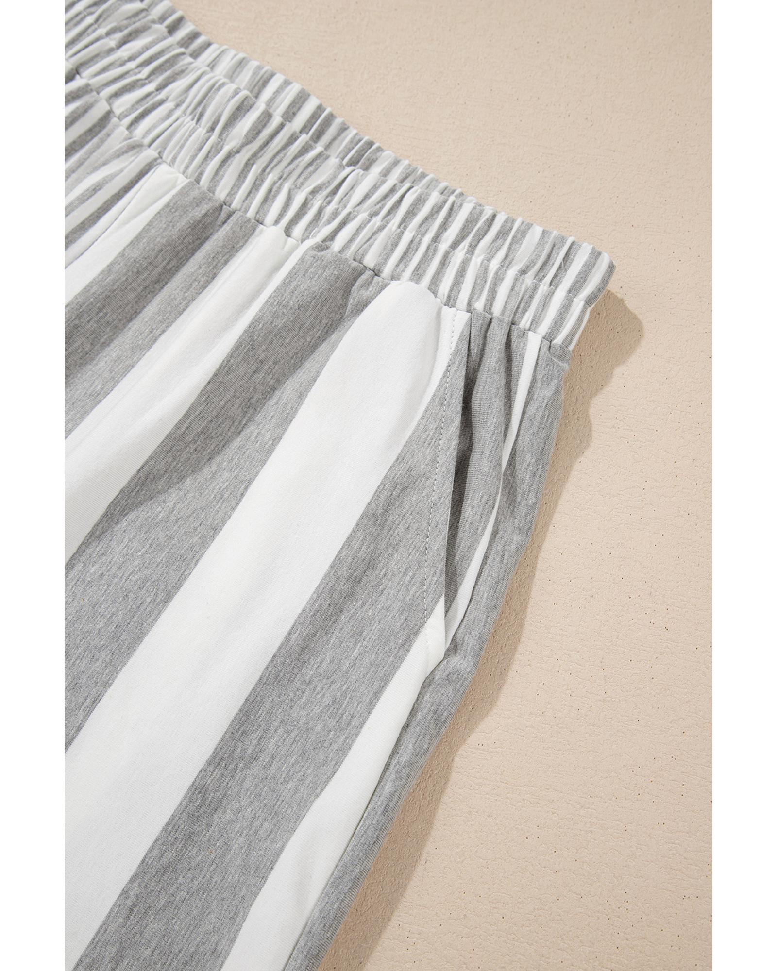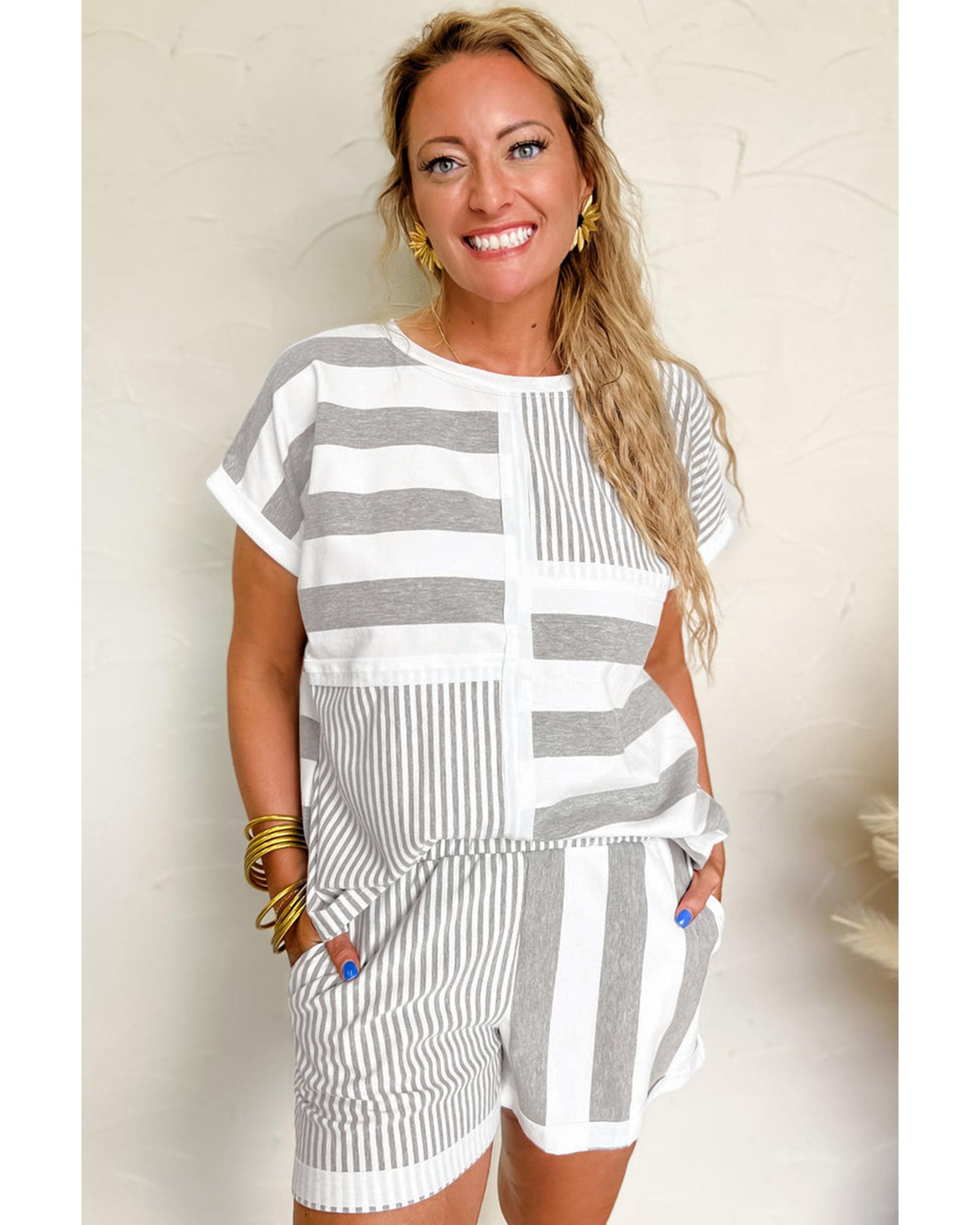 Gray Stripe Mixed Print Short Sleeve Top and Pocketed Shorts Set – S