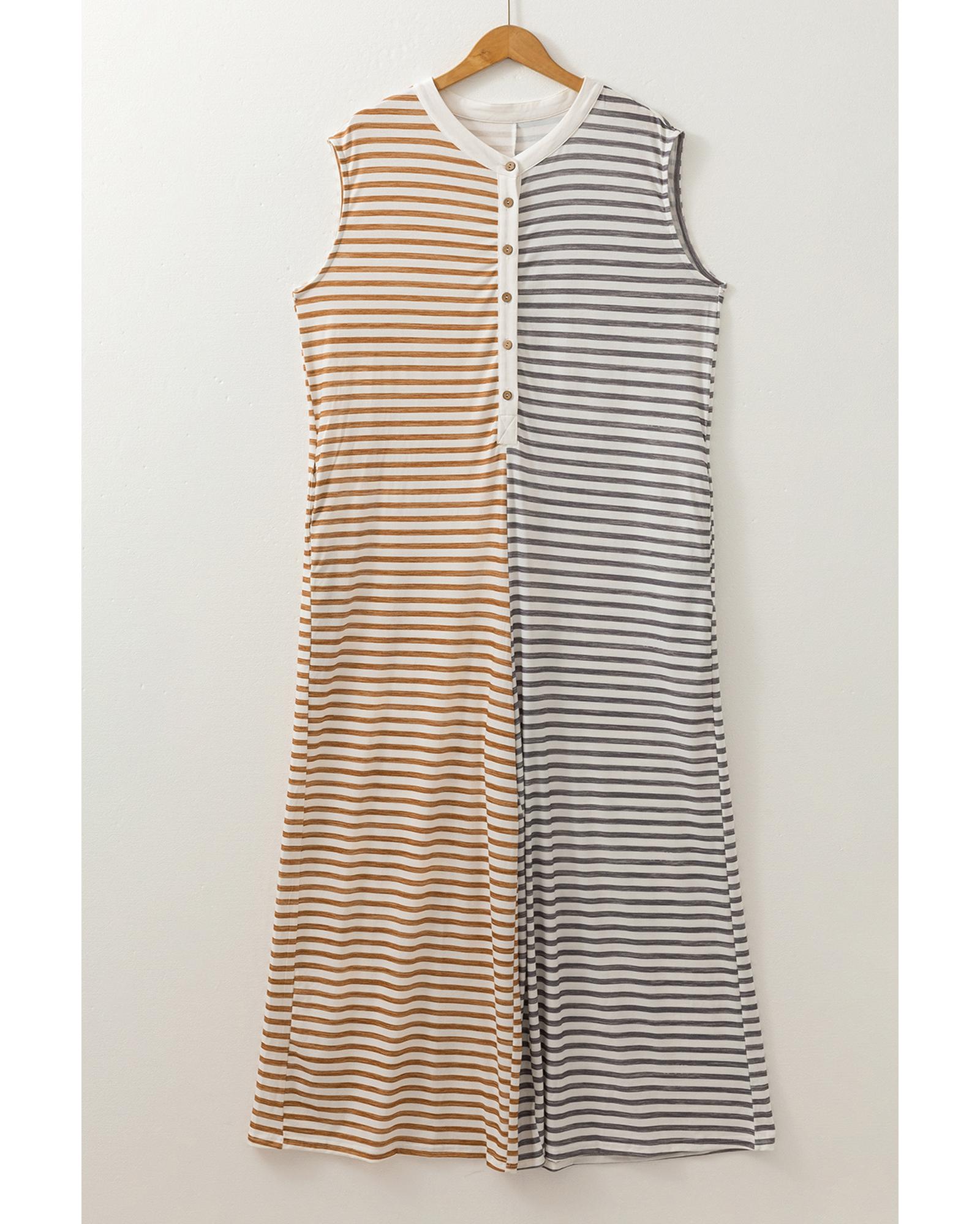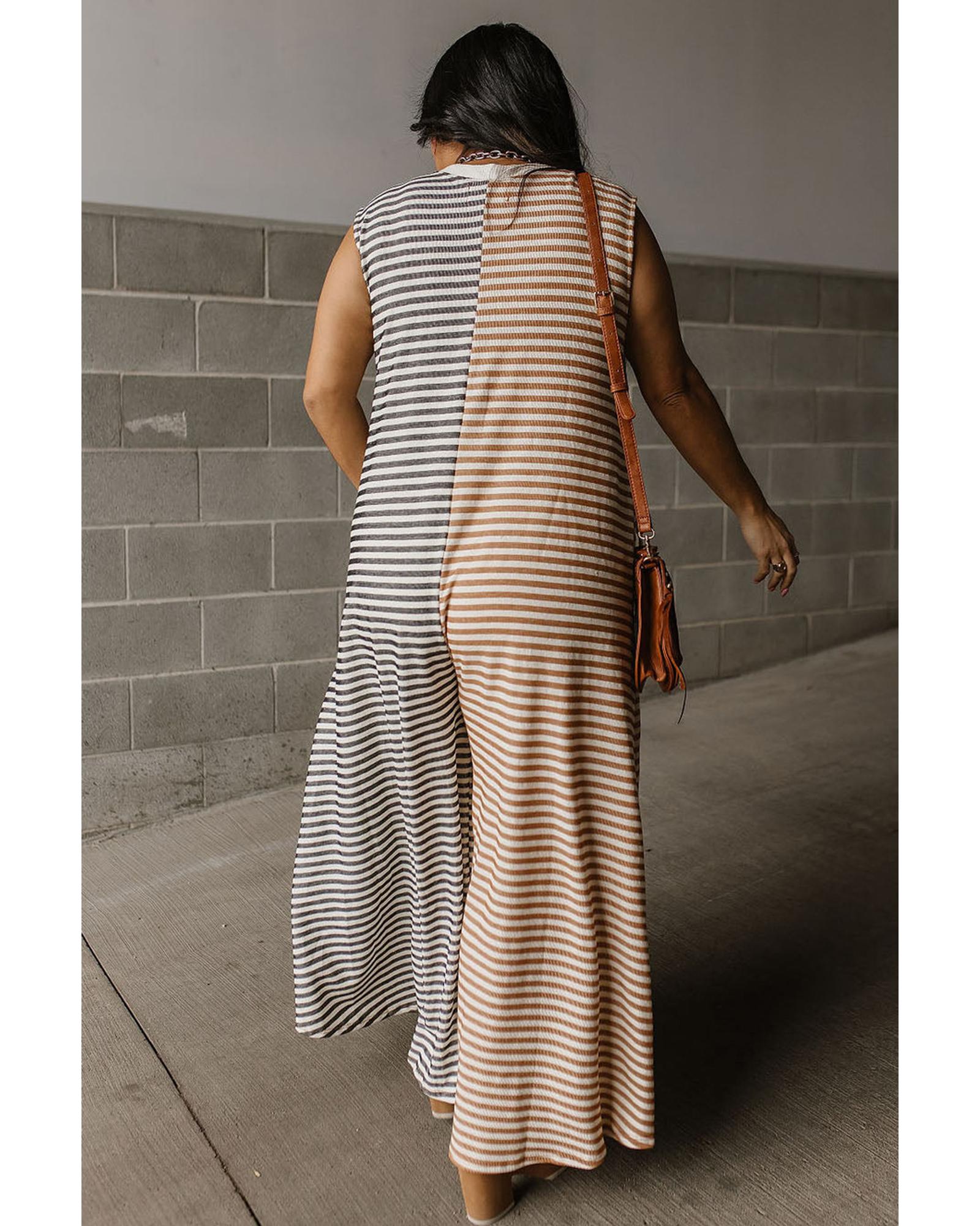 Gray Stripe Plus Size Color Block Buttoned Sleeveless Wide Leg Jumpsuit – 4X