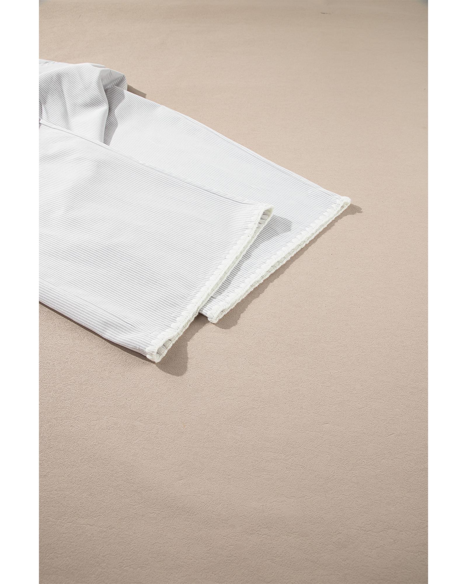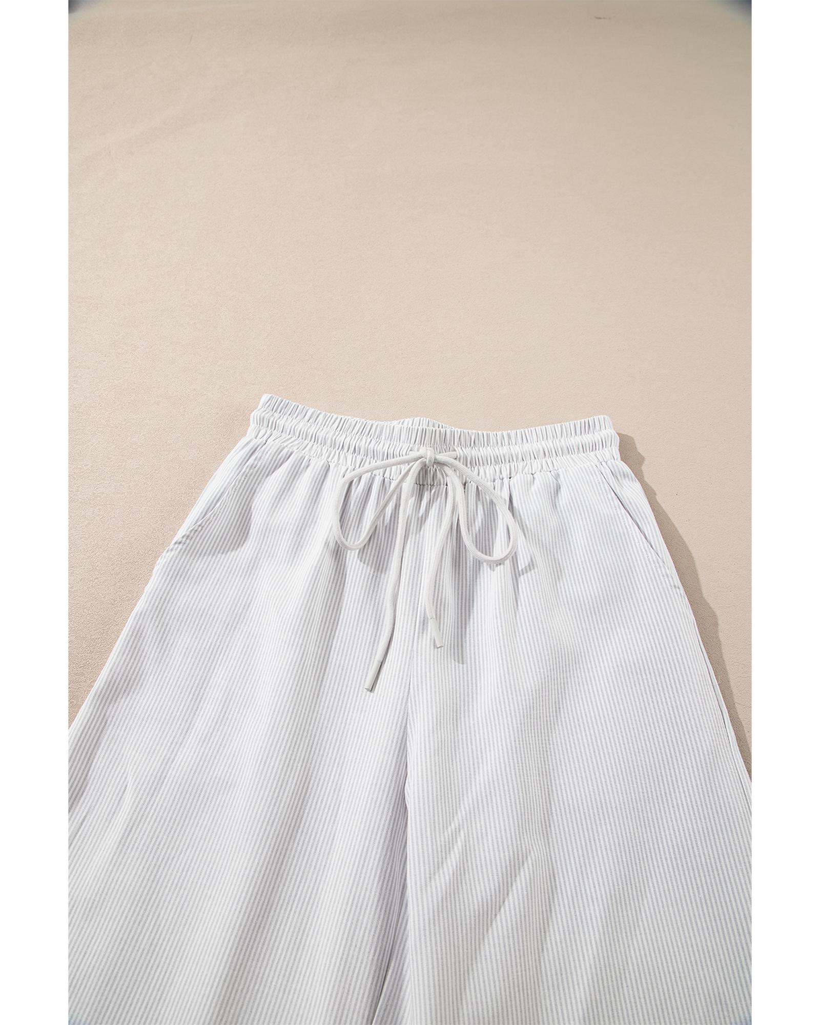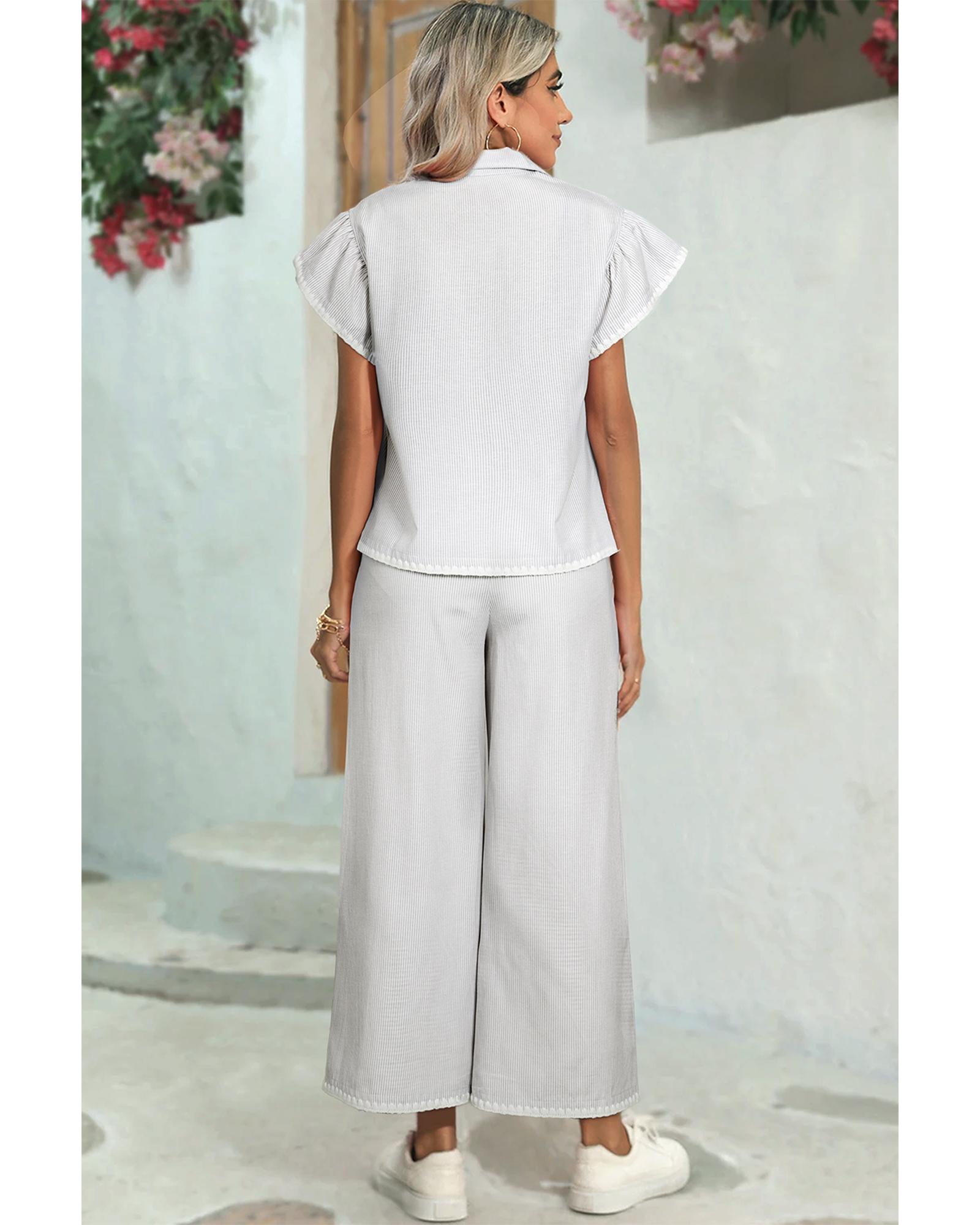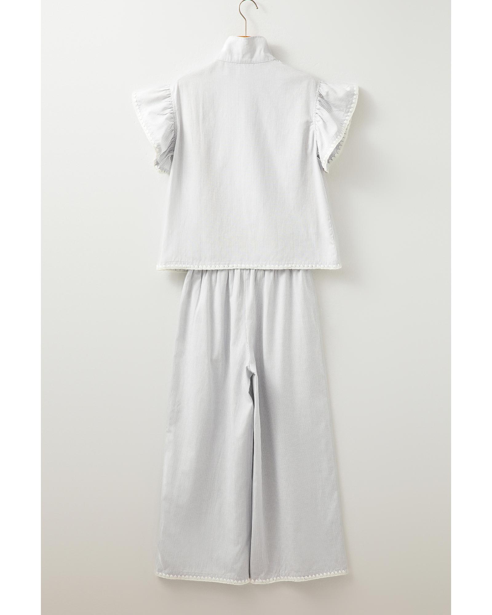 This 2-piece outfit features a stylish gray stripe pattern, combining a short sleeve top with ruffled sleeves and a pair of wide-leg pants. Designed for a relaxed fit, it offers both comfort and a trendy look suitable for daily wear.