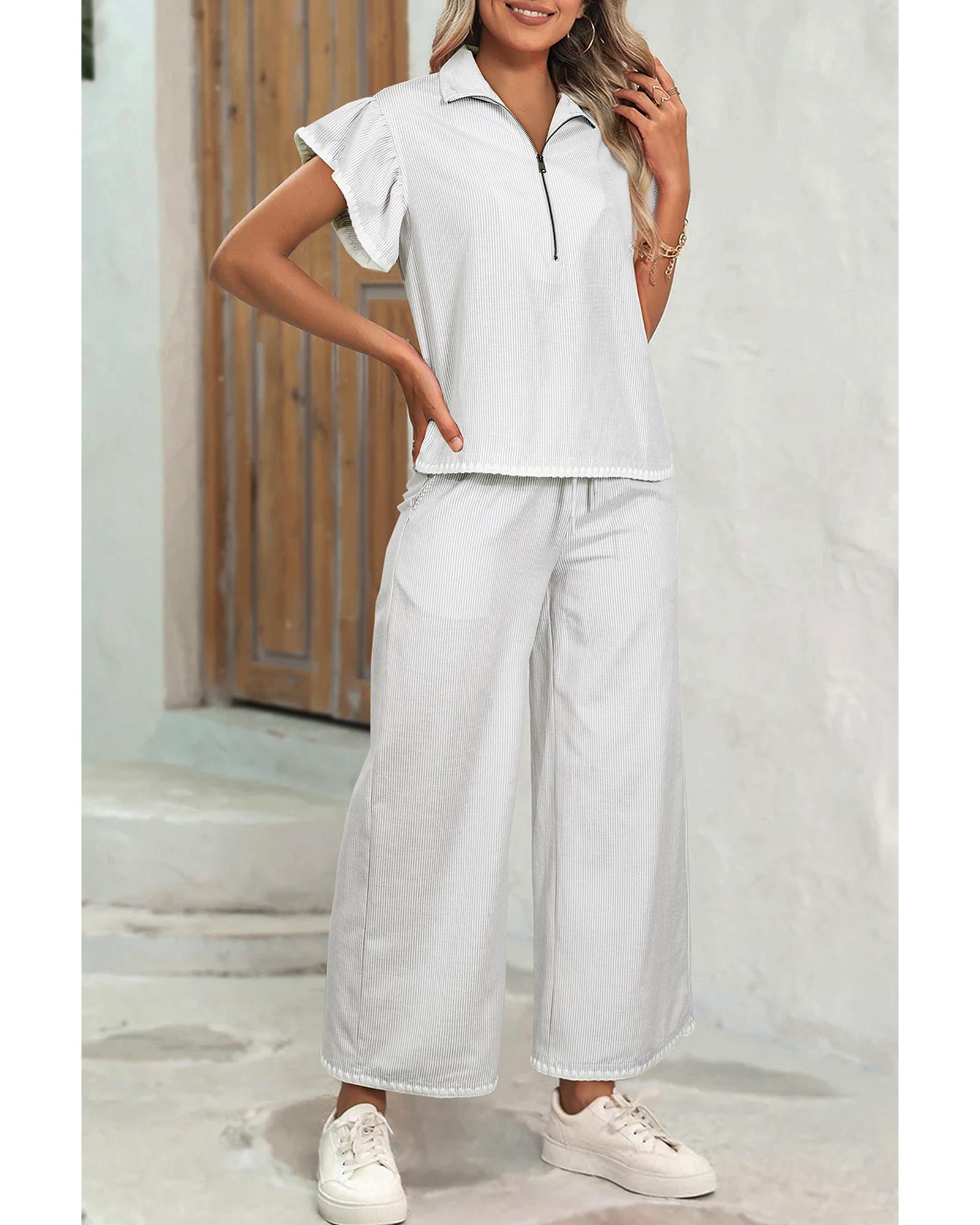 Gray Stripe Zipped up Collar Ruffled Sleeve Tee and Wide Leg Pants 2pcs Outfit – L