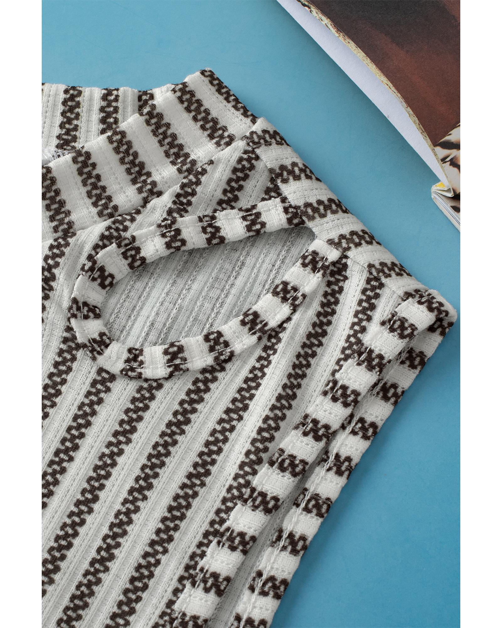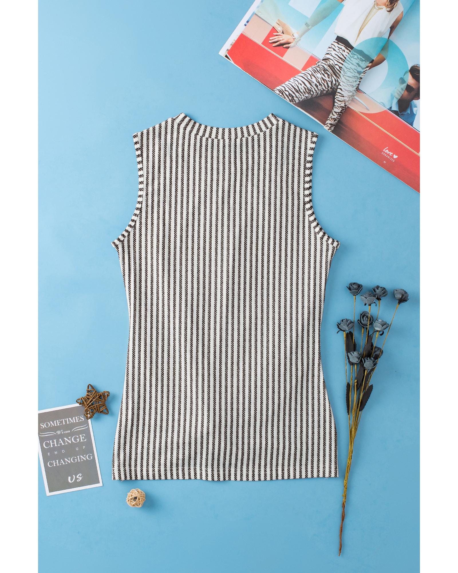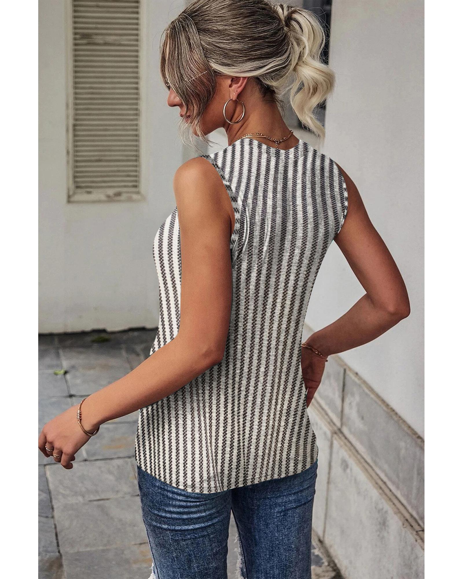 This gray striped cutout twist front tank top features a trendy fitted design with unique shoulder cutouts and a chic twist front detail. It is versatile for layering under shirts or jackets and offers high elasticity for a comfortable fit. Perfect for pairing with jeans, shorts, or skirts for a stylish look.
