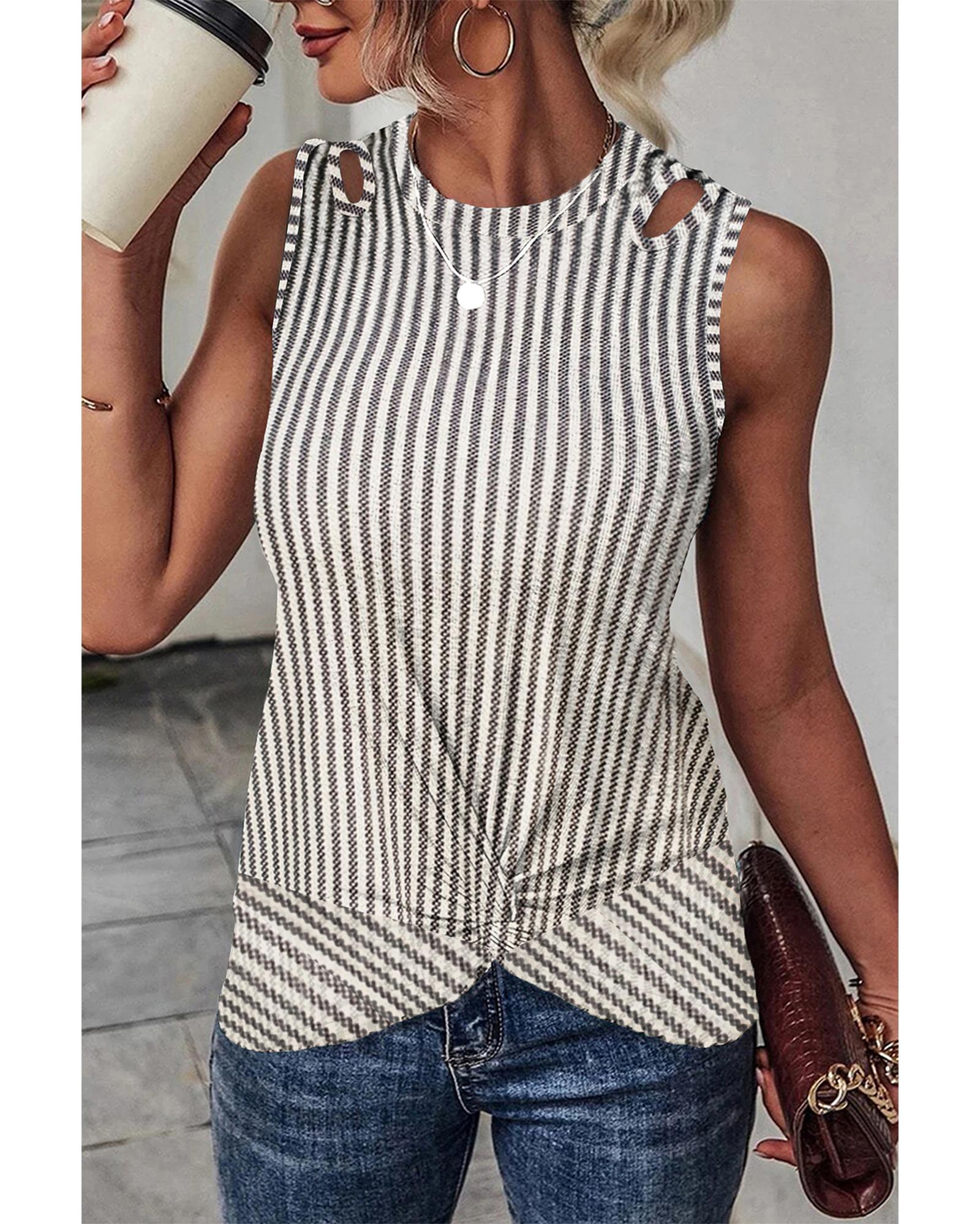 This gray striped cutout twist front tank top features a trendy fitted design with unique shoulder cutouts and a chic twist front detail. It is versatile for layering under shirts or jackets and offers high elasticity for a comfortable fit. Perfect for pairing with jeans, shorts, or skirts for a stylish look.