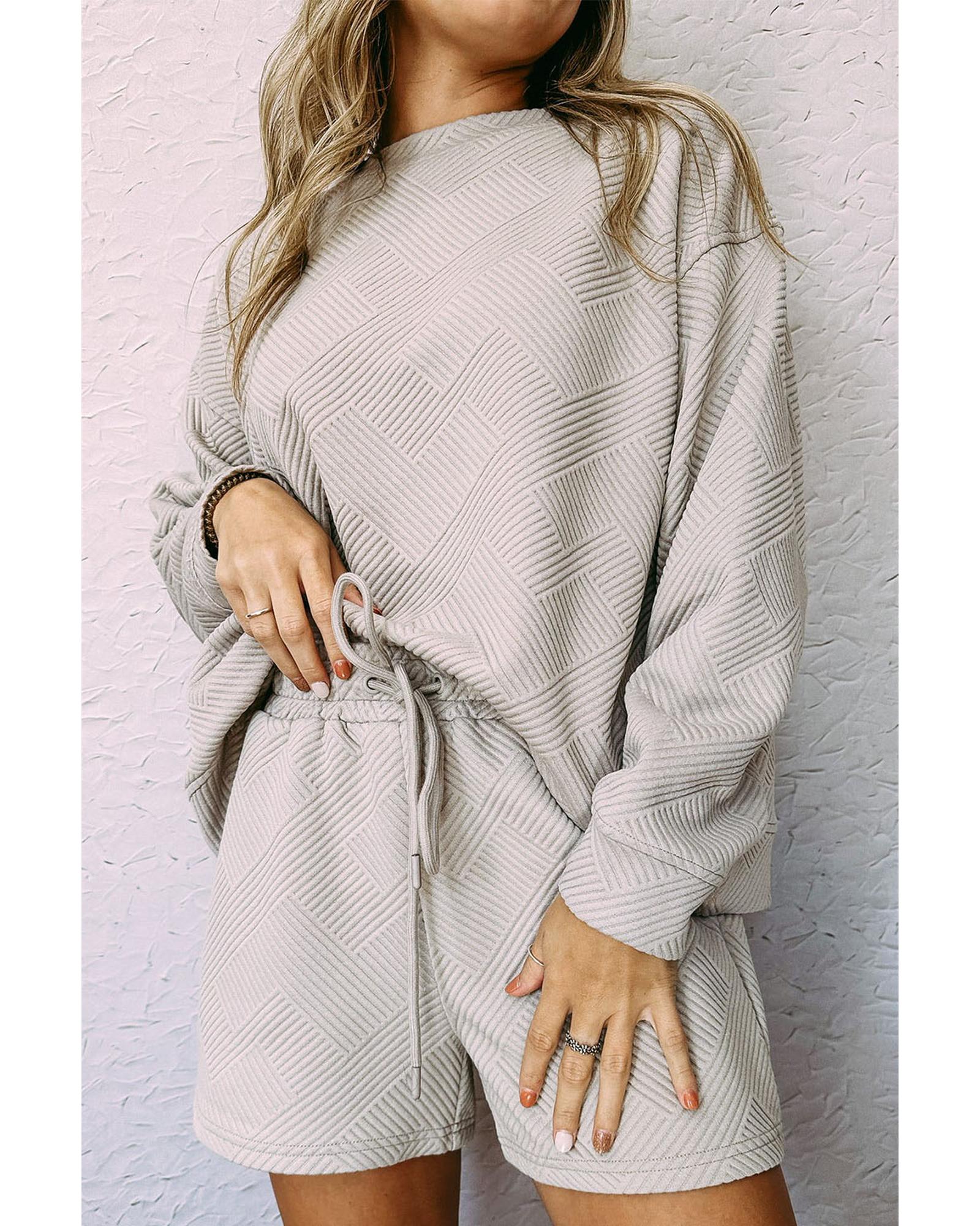 This textured long sleeve top and drawstring shorts set offers a stylish and comfortable loungewear option. Designed with a trendy fitted look, it combines sophistication with practicality, making it suitable for relaxing at home or running errands.