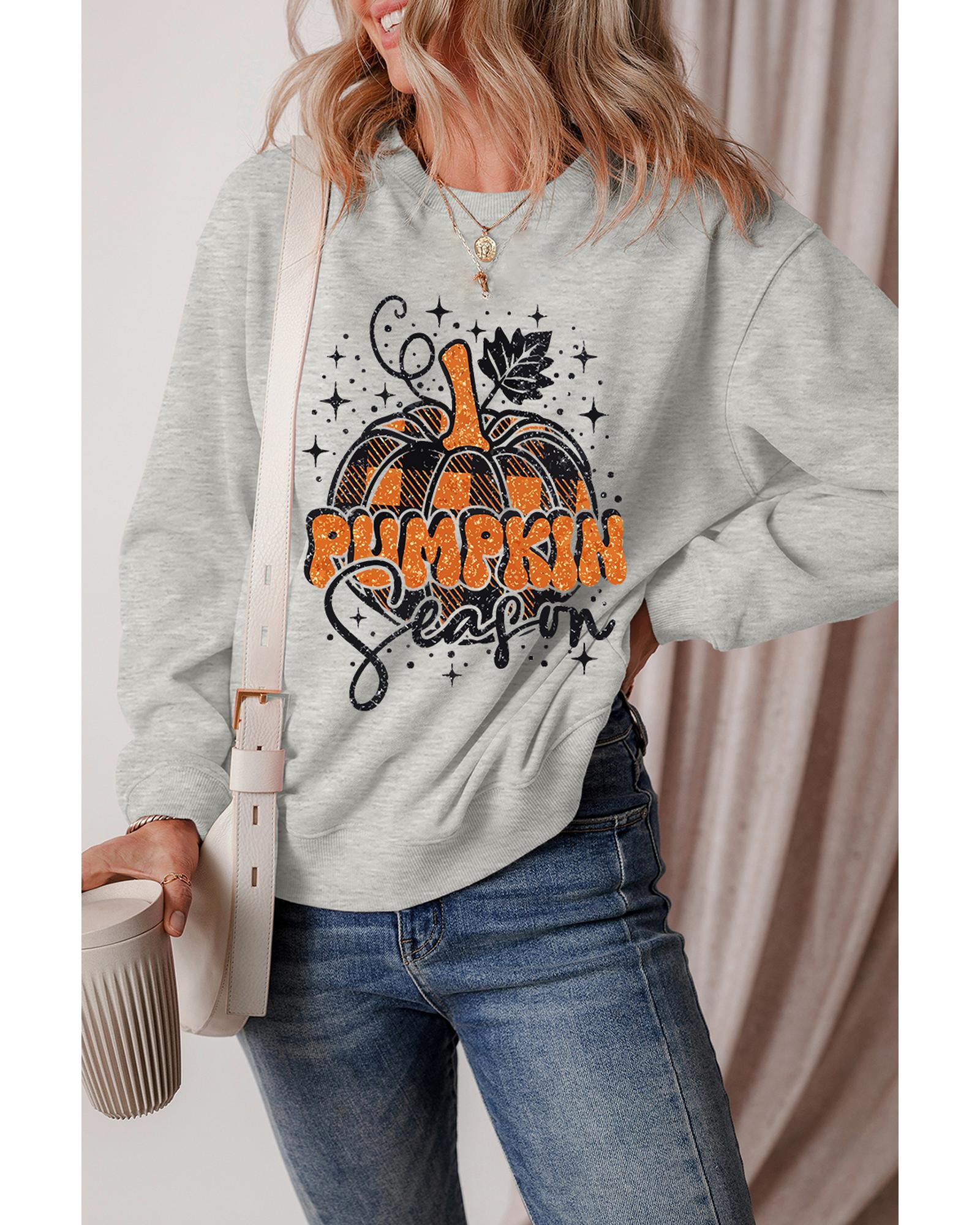 This gray sweatshirt is perfect for celebrating the pumpkin season with a festive and stylish look. Designed with a trendy fitted silhouette, it features playful pumpkin details and seasonal lettering, making it ideal for Thanksgiving festivities. The drop shoulder design and long sleeves add to its cozy and fashionable appeal.