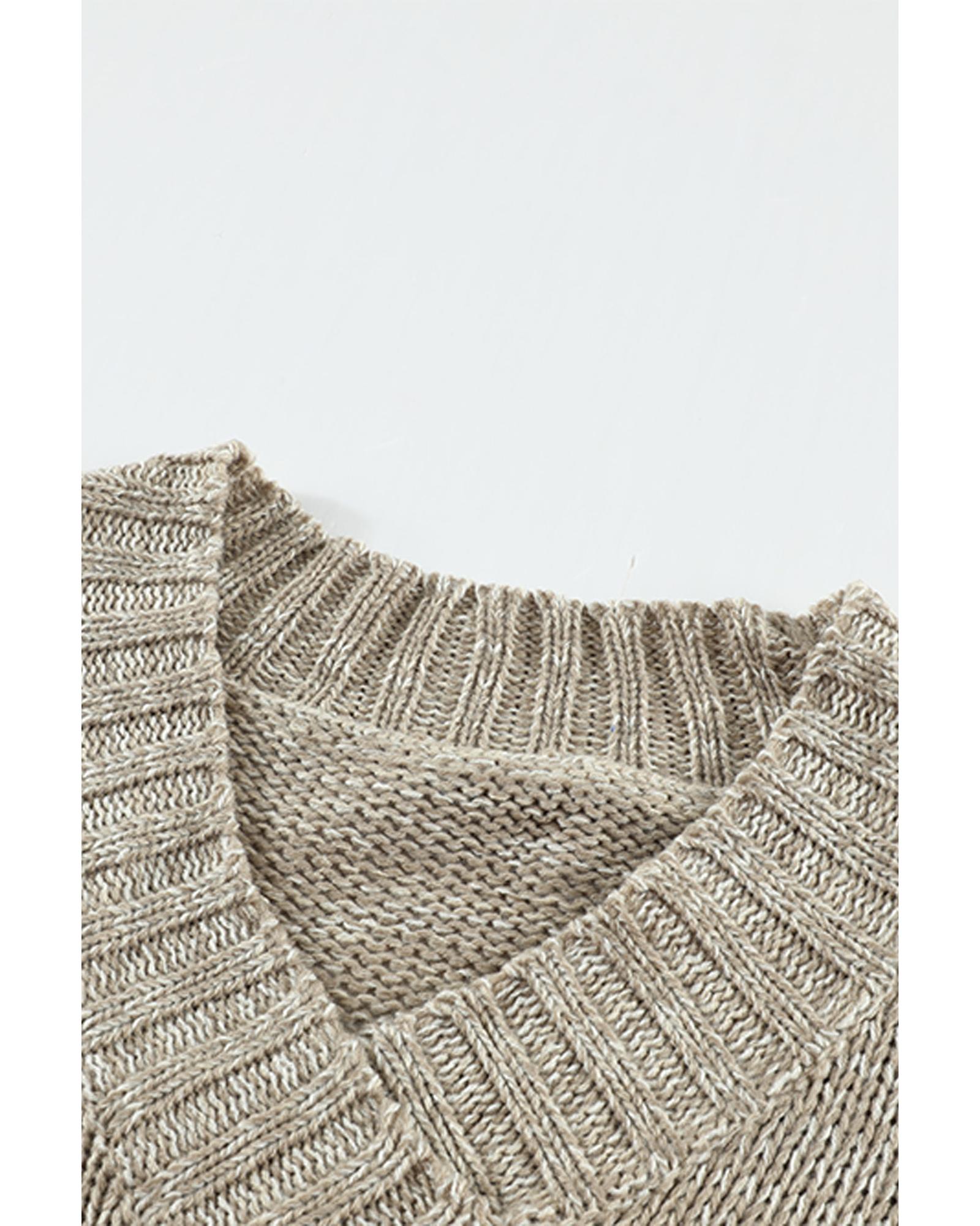 This gray V-neck drop shoulder knitted sweater offers a stylish and comfortable fit, ideal for cold weather. Its versatile design makes it suitable for various occasions and easy to pair with different outfits.