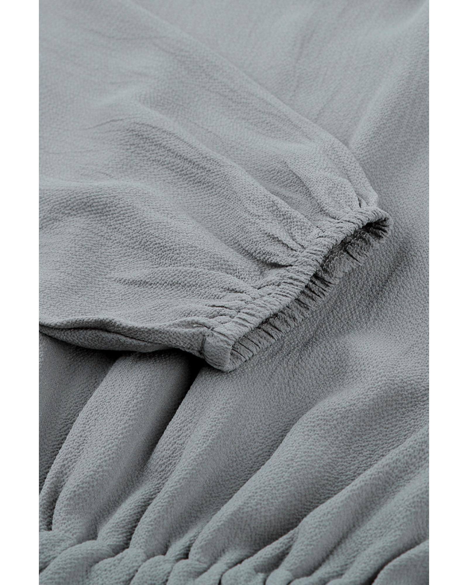 This Gray V Neck Long Sleeve Ruffle Tiered Mini Dress offers a trendy and elegant look with a comfortable fit. Its design combines a flowy silhouette with stylish details, making it suitable for various occasions.