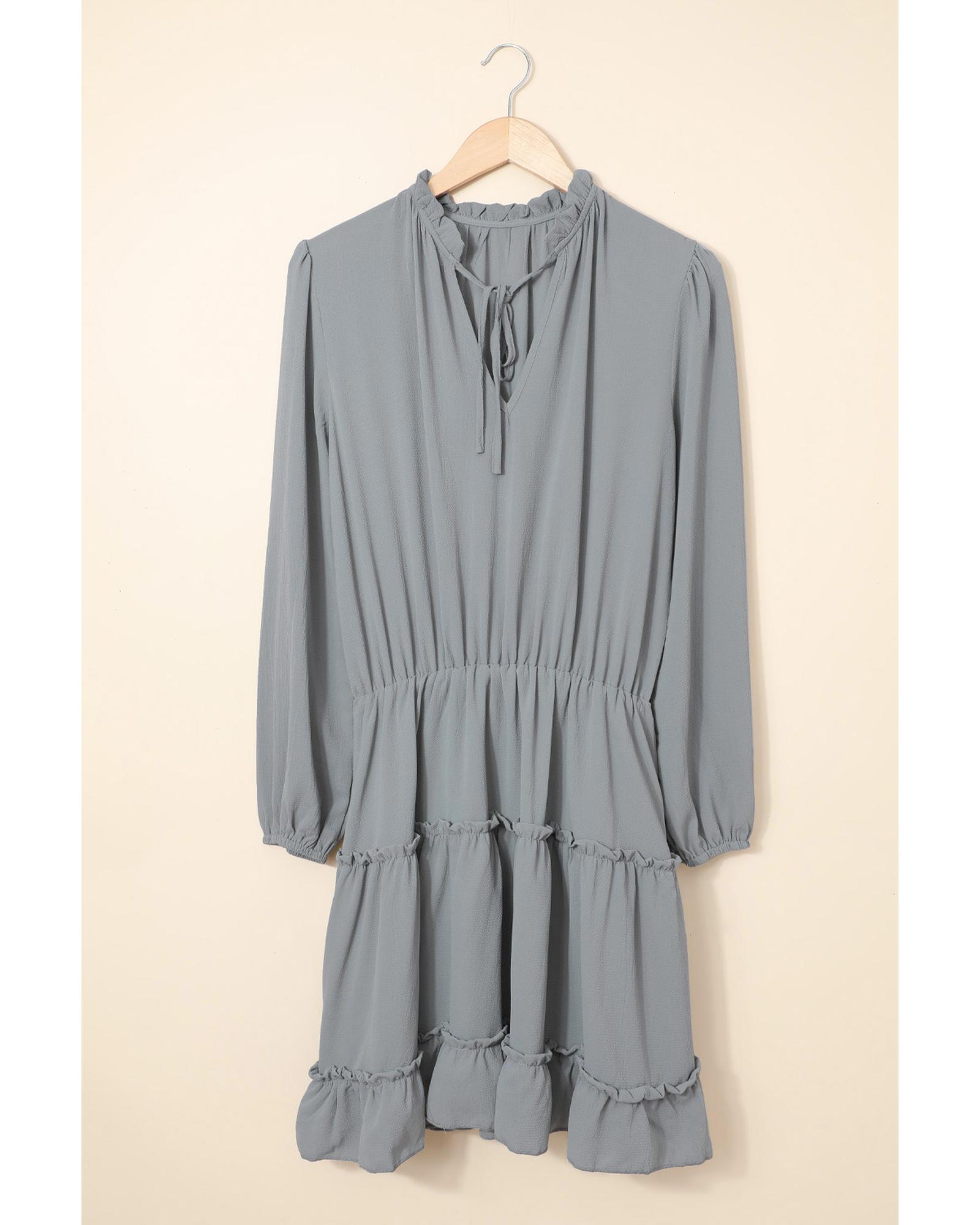 This Gray V Neck Long Sleeve Ruffle Tiered Mini Dress offers a trendy and elegant look with a comfortable fit. Its design combines a flowy silhouette with stylish details, making it suitable for various occasions.