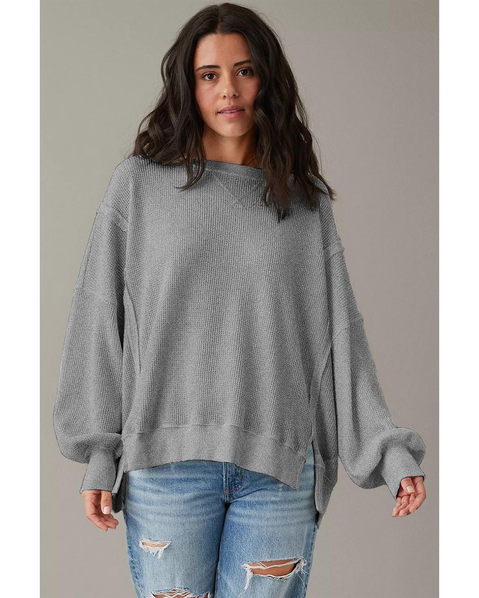 This gray waffle knit bishop sleeve split oversized top offers a trendy and relaxed silhouette, perfect for casual and stylish wear. Its solid color and elegant design make it a versatile addition to any wardrobe.