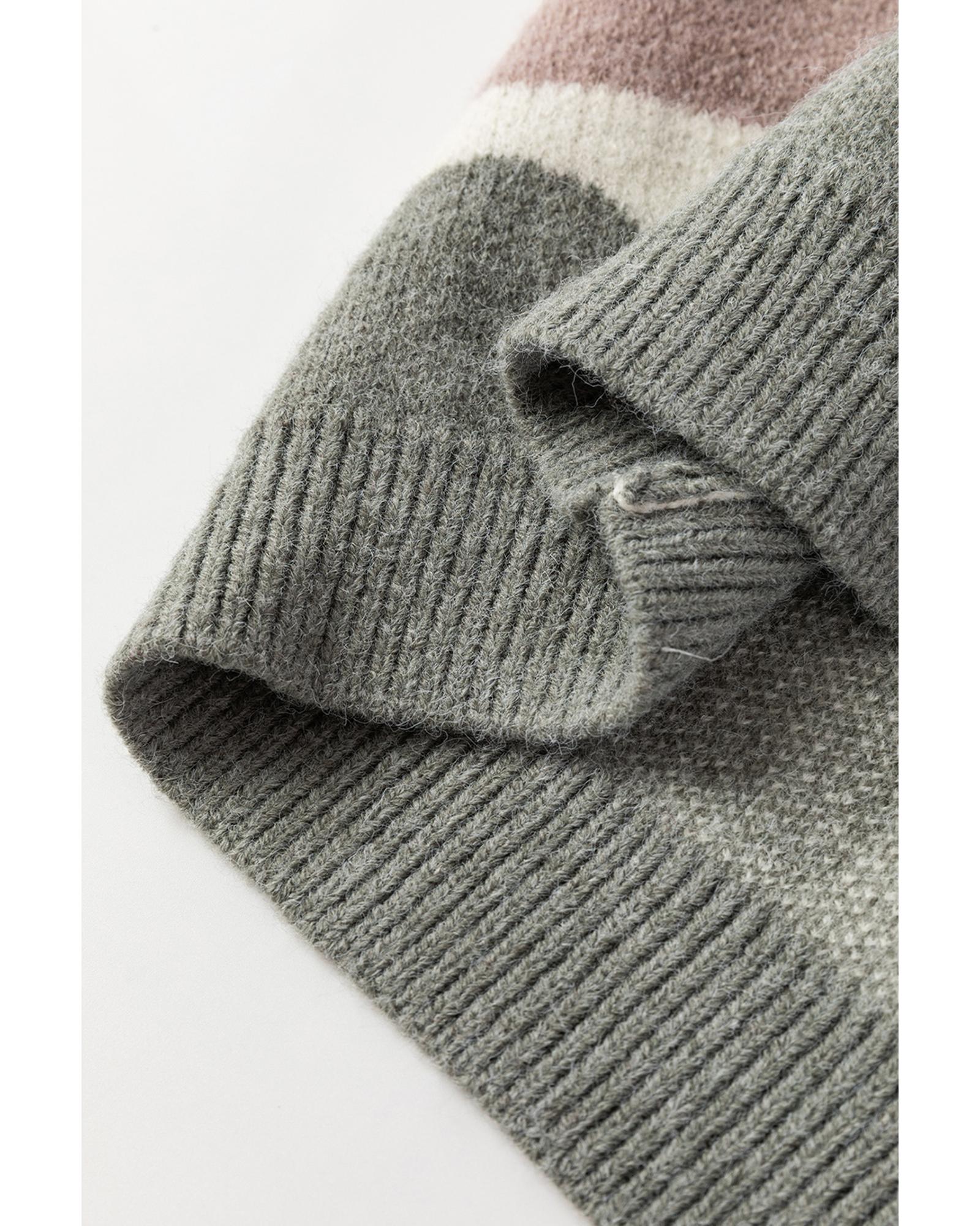 This sweater features a trendy fitted design with a relaxed and casual style. It combines a chic wave pattern with whimsical balloon sleeves and a striped design, making it suitable for a stylish yet comfortable look.
