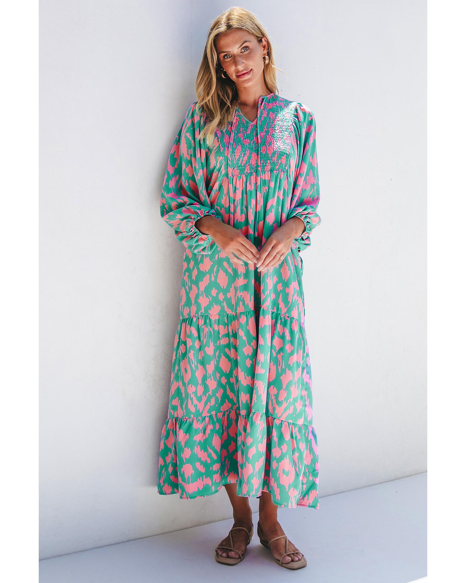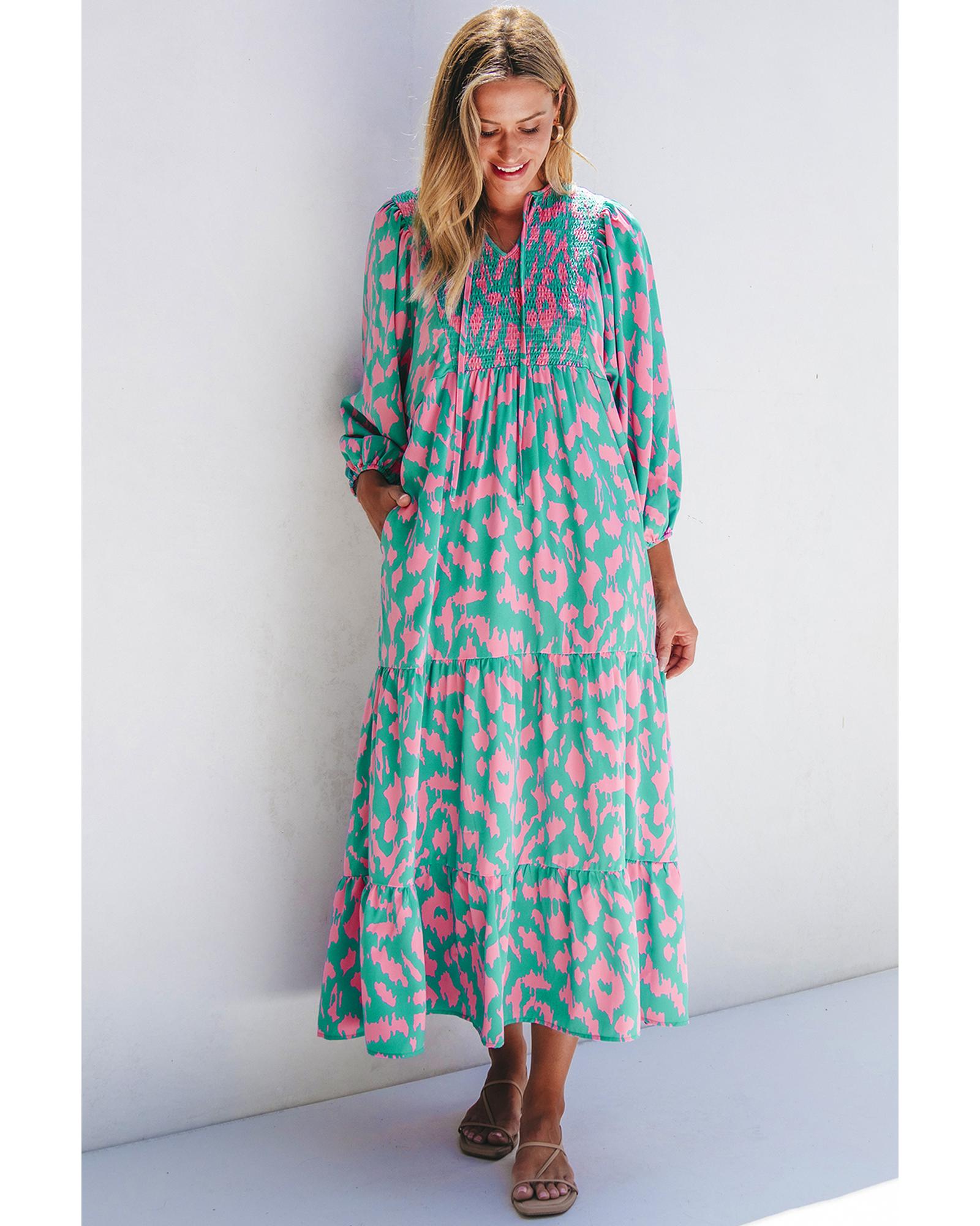 This long dress features a stylish green abstract print with a relaxed fit, making it suitable for various occasions. It combines trendy design elements such as puff sleeves, a tied notched neck, and a tiered silhouette to create a fashionable look. The maxi length adds elegance and comfort to the overall style.