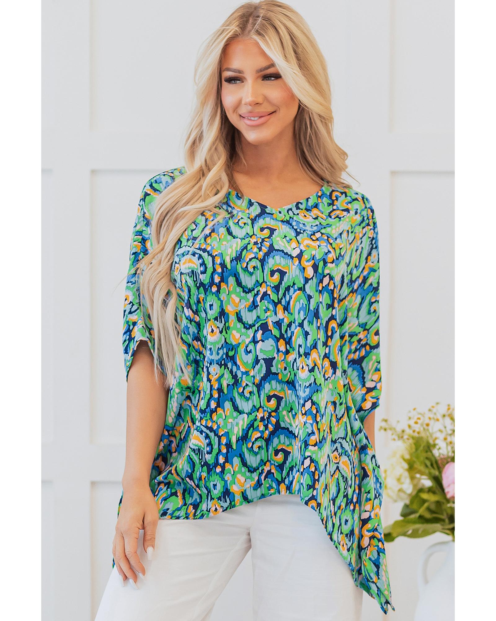 Green Abstract Print V Neck Half Sleeve Loose Fit Tunic Blouse – M