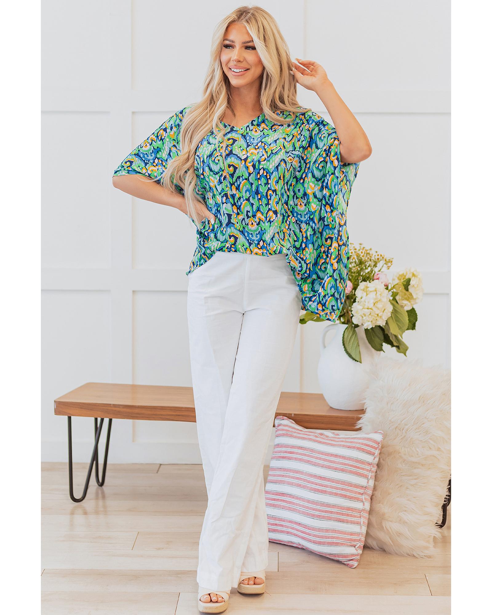 This green abstract print V-neck half sleeve tunic blouse offers a stylish and comfortable option for casual or semi-formal occasions. Its loose fit ensures ease of movement and all-day comfort, making it a versatile addition to your wardrobe.