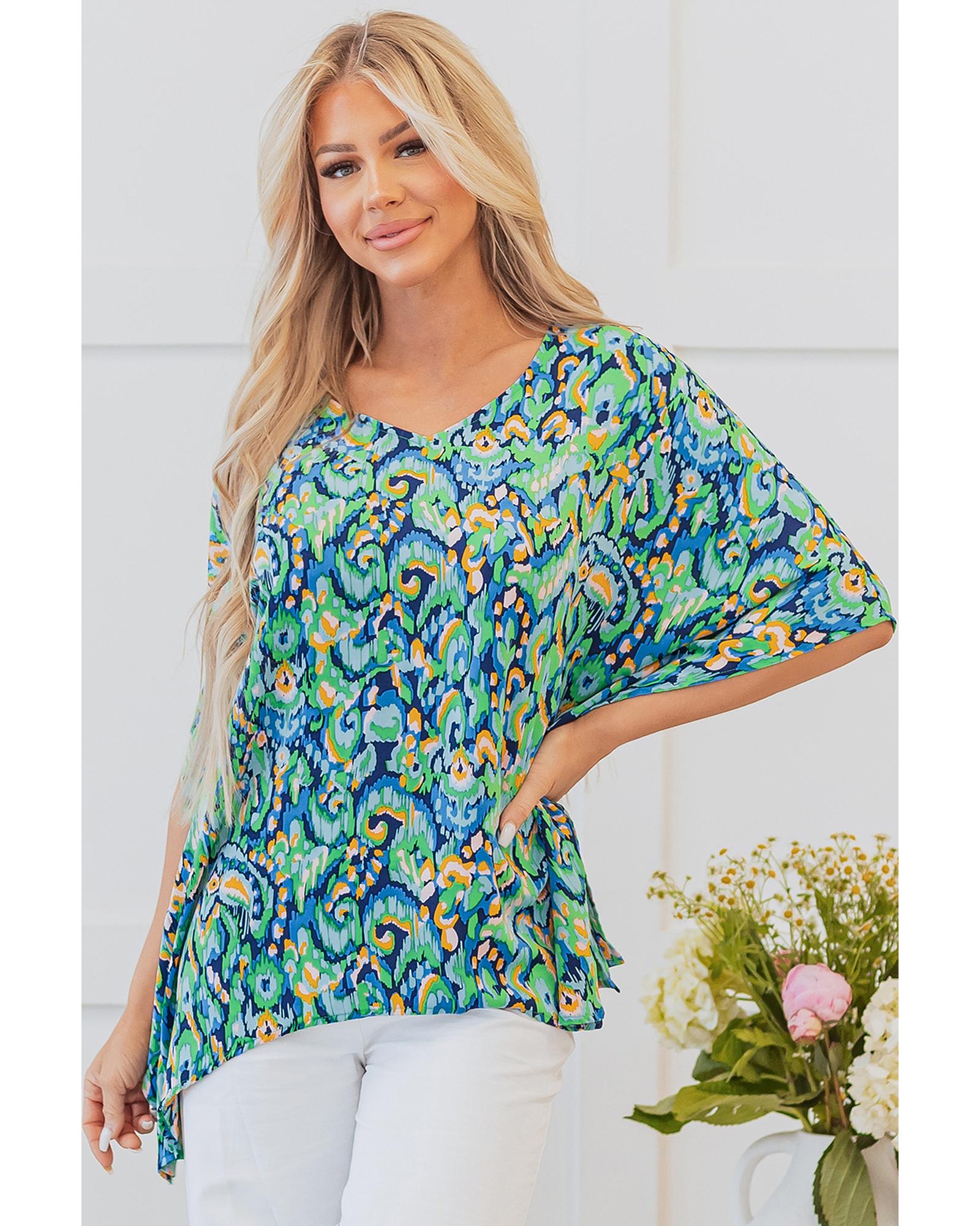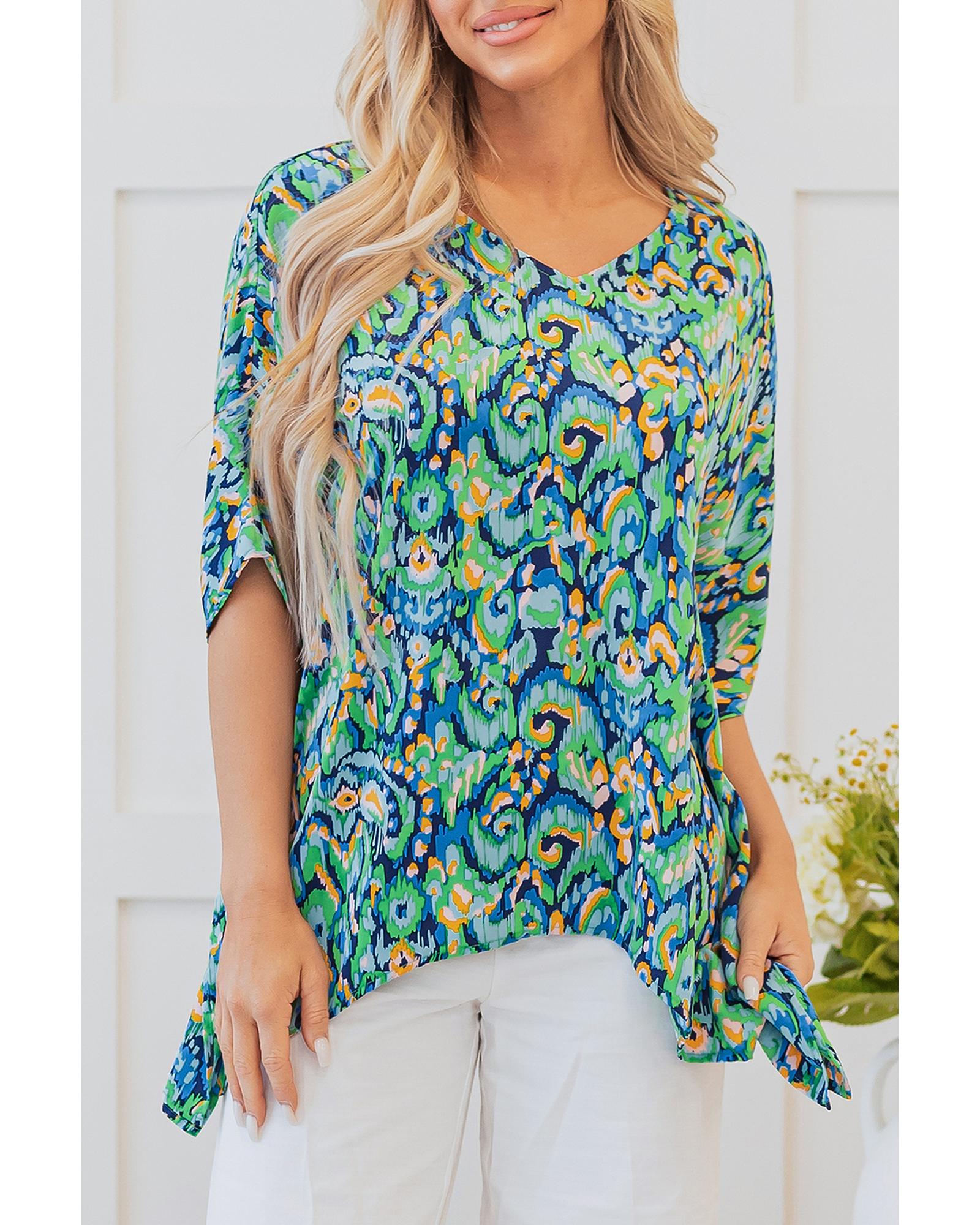Green Abstract Print V Neck Half Sleeve Loose Fit Tunic Blouse – S